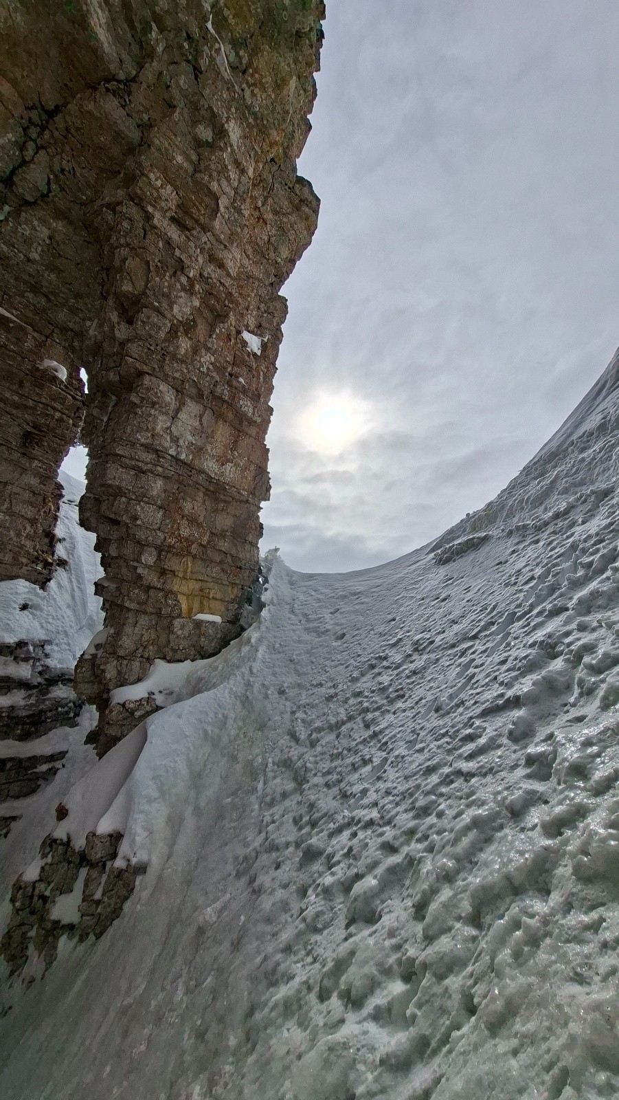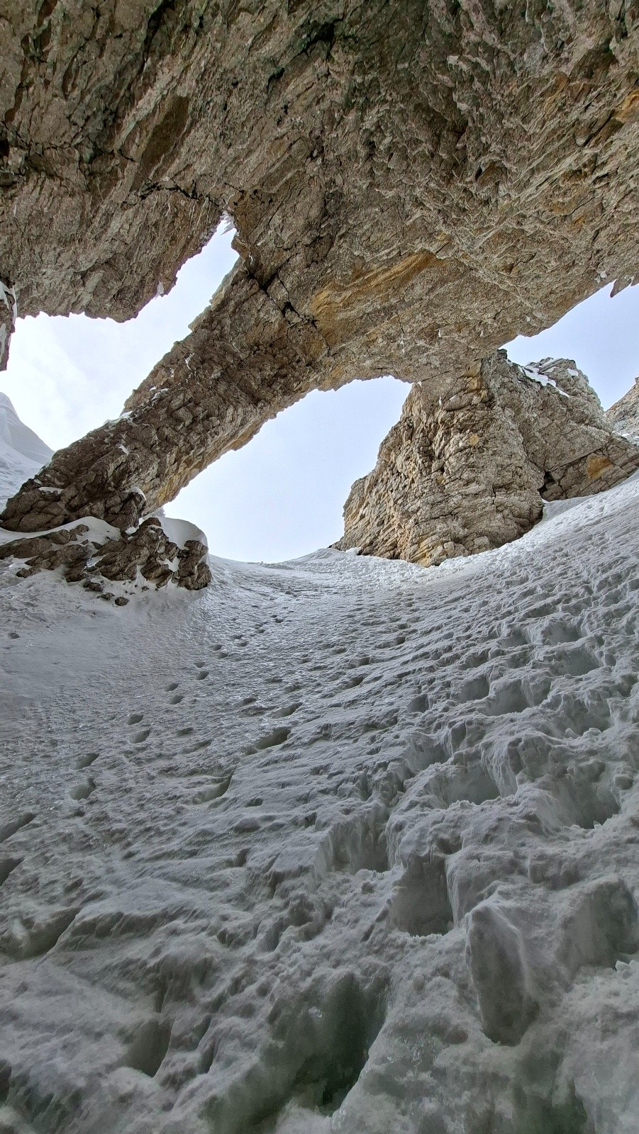 A noter que la sortie se fait sous une énorme corniche (voir les photos).