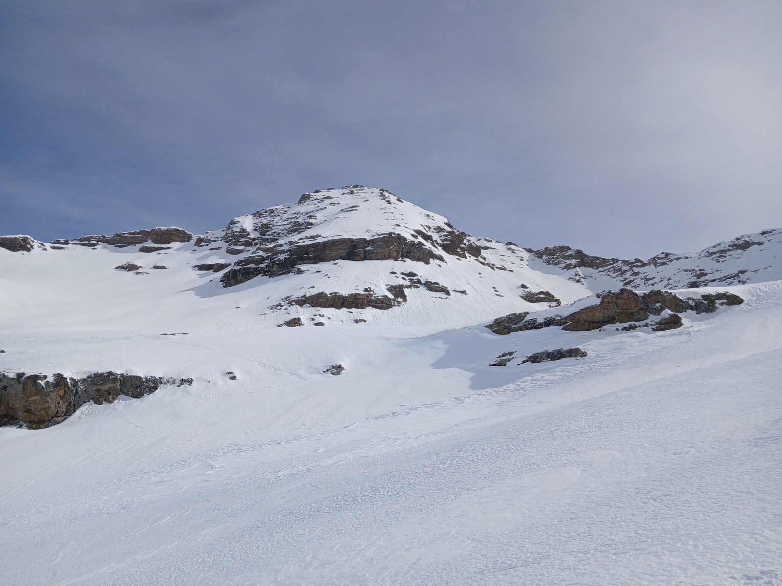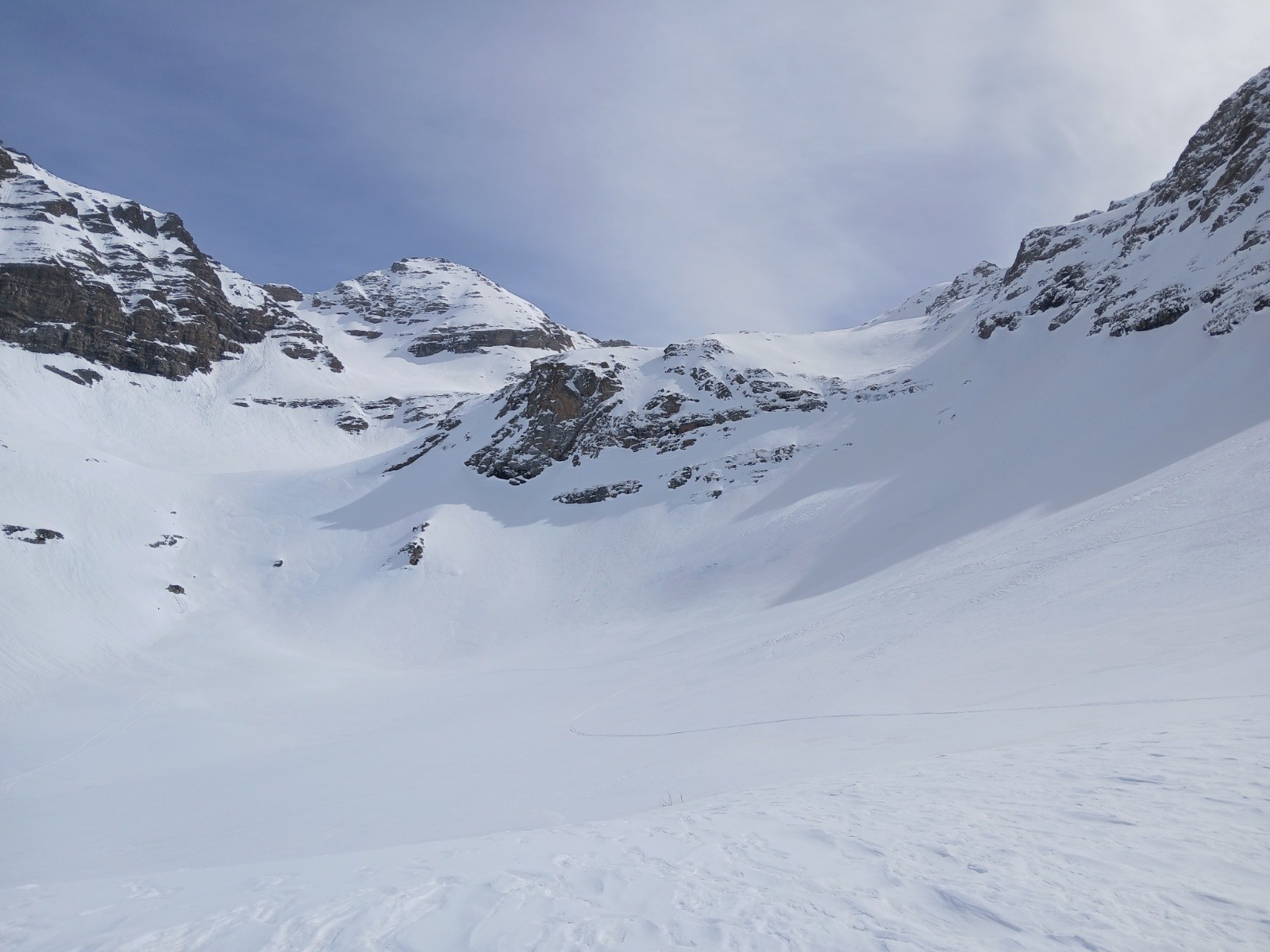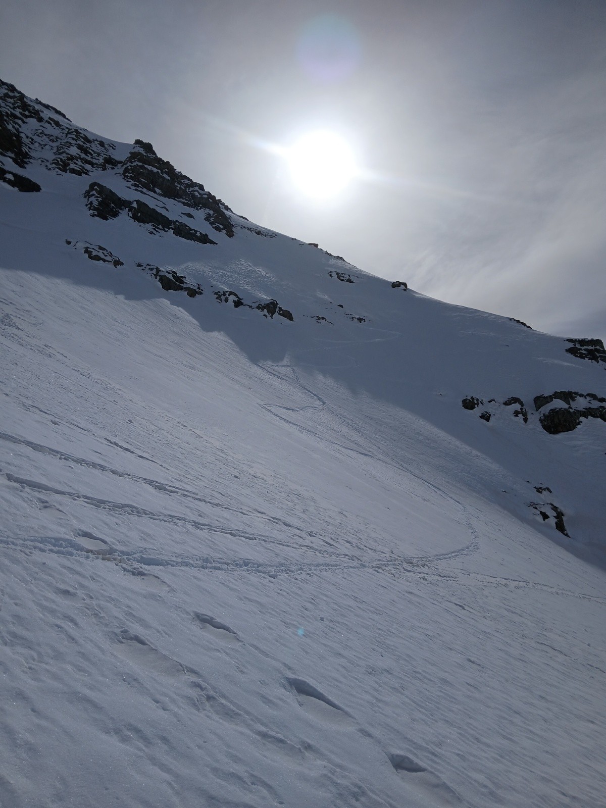 Je passe une section où les rochers ne sont pas si loin et la neige changeant en suche goblet bof... je doute un peu et continue vers la face plus homogène, en traversée vers la droite.