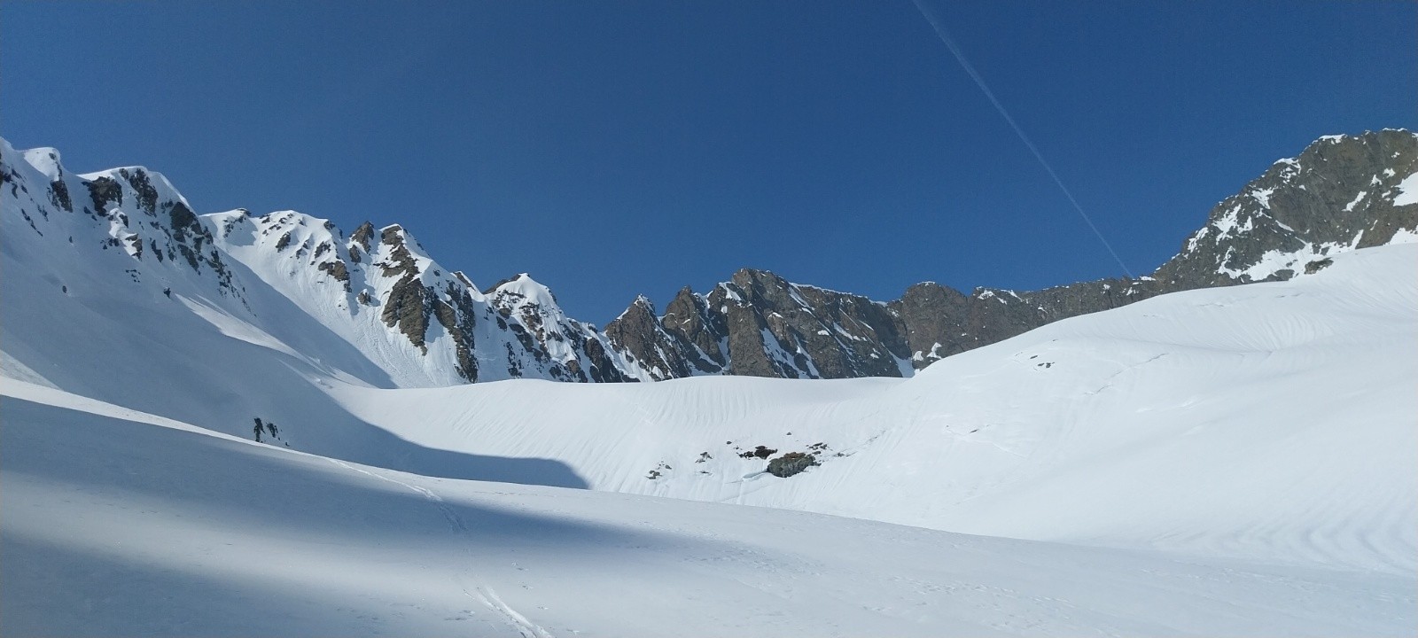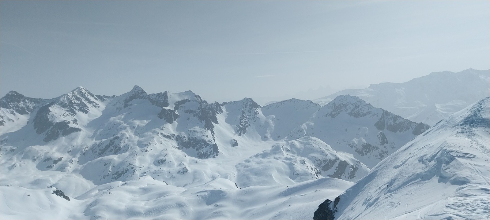 Le col de l'Amiante est désert, pas un chat. Seulement des résidus de grosses et vieilles coulées qui se sont arrêtées dans le lac. A la montée c'est top mais je déconseille la partie basse à la descente, sauf si vous aimez vous faire secouer. Le couloir SO du Rocher Blanc donne bien envie, il est au soleil et bien rempli. Ce sera pour une prochaine fois😜. Le raidard final du col de l'Amiante est en neige un peu dure et zippante. J'ai rapidement cramponné et suis monté dans un escalier 5⭐️, un grand merci à celui qui a fait les marches. Le final en sud du Rocher Blanc est passé sans problème. Une fois en haut me revoilà dans la civilisation, il y a du monde au sommet mais pas dans les faces que j'emprunte. Malgré le sable dans l'air on y voyait quand même nettement plus loin que jeudi, notamment vers le Mont Blanc, la Grande Casse ou les Aiguilles d'Arves toujours aussi majestueuses😍. Je décide de m'engager dans la boucle, le manteau neigeux n'a pas encore trop ramolli. Je pars donc dans les grandes pentes sauvages en sud-est du sommet. Cette fois -ci la moquette est très bonne, je me régale. Par contre c'est préférable de bien serrer rive droite à 2500m, en étant un peu plus à gauche je me suis retrouvé au dessus d'une barre que j'ai contournée grâce à un bon enneigement vers 2400m.