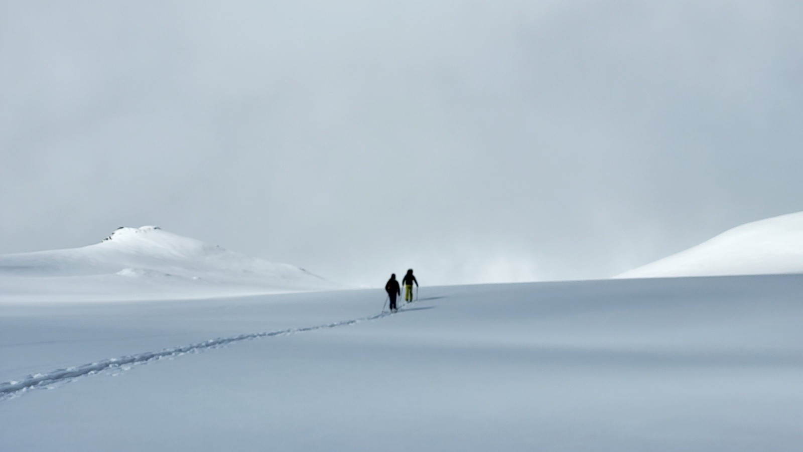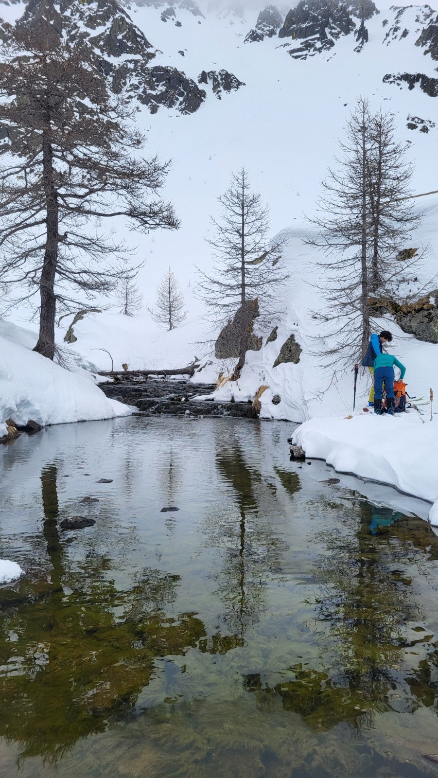 Nous remontons l'Ubaye jusqu'à sa source. C'est très plat, très long mais superbe. Le ciel est embrumé par le sable du Sahara rendant l'ambiance un peu surnaturelle. Personne en vue sur 11 km. Au col de la Noire, nous retrouvons la civilisation. Superbe descente plein nord, 30/40 cm de poudre froide. Nous arrivons juste à l'heure pour se commander une bonne omelette en guise de repas. Ça nous change de notre habituel combo pain rassis-saucisson-tomme !