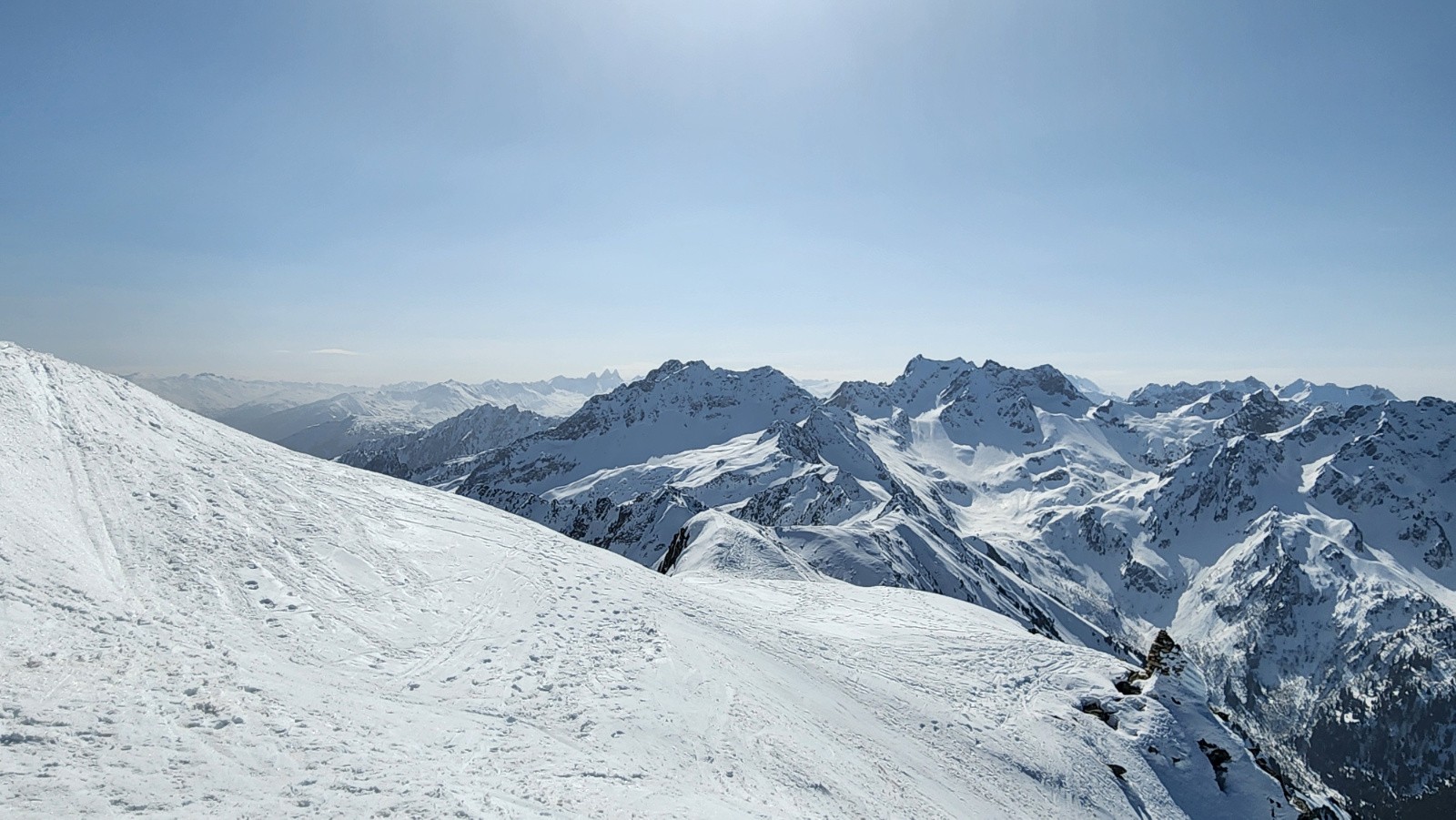 Il est long à atteindre ce couloir, des kilomètres de plat avant que ça grimpe franchement. On a tenté un raccourci, pas mal au début puis un peu sanglier avant de rejoindre le refuge. Traversée sur couteaux assez tendu permettant de passer sous le couloir encore à l'ombre, puis remontée de la face Sud, ça passe en ski pour l'instant. Une fois n'est pas coutume, une pause d'une heure trente histoire que la bête soit à point. On a le temps d'observer tous les couloirs faisables sur ce sommet. A 13h30, feu, c'est nickel. Petite remontée vers la montagne d'Arvillard avant de se laisser glisser sur la piste encore bien béton.
