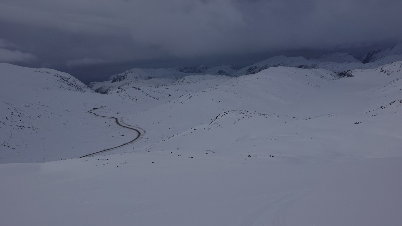 Pour ce premier jour de ski sur l'île de Senja et avec cette météo incertaine nous partons vers la partie centre Ouest de l'île pour skier soit l'Istind, soit le Tredjefjellet ou les deux sommets. Finalement ce sera le Tredjefjellet qui est un peu moins ennuagé mais globalement sous un ciel typiquement norvégien, bas et chargé, avec un petit vent frais et humide qui accompagne le début de notre ascension. L’ambiance reste humide et grise, le relief atténué par cette lumière uniforme mais quelques éclaircies très fugaces laissent par moments entrevoir les contours plus marqués de l’île de Senja. La montée se fait donc dans une atmosphère calme mais un peu lourde avec un groupe de 10 skieurs finlandais qui nous précède mais qui s'arrêtera à l'antécime et un groupe de 6 toulousains et de 3 norvégiens.