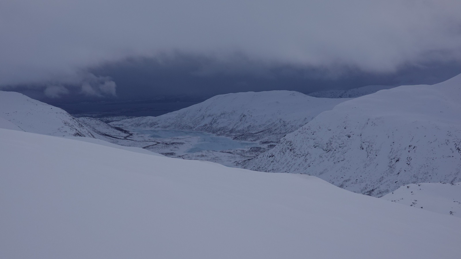 En gagnant de la hauteur, le ciel demeure largement couvert. Les rares trouées de lumière révèlent alors brièvement le Sifjorden vers le Nord et le Kapervatnet vers le Sud ainsi que les pentes voisines vers l'Hesten et l'Innhesten ainsi que l’architecture découpée de l’île, avant que tout ne se referme. À l’approche du sommet, la visibilité se dégrade franchement et, vers 13h30 le Tredjefjellet est entièrement pris dans le brouillard. L’arrivée au Cairn givré du sommet se fait ainsi dans un univers très blanc, sans horizon, où seuls les reliefs immédiats et le bruit du vent donnent des repères. La descente commence sur une neige dure, demandant une bonne vigilance et des appuis précis. Rapidement, on trouve une couche de 5 cm de poudreuse posée sur un fond dur, offrant un ski nettement plus agréable sur une portion intermédiaire du versant. Dans cette zone, les virages s’enchaînent mieux, malgré une lumière toujours très plate. En dessous d’environ 450 m, la neige devient nettement plus humide et lourde, rendant la glisse plus physique et moins fluide.