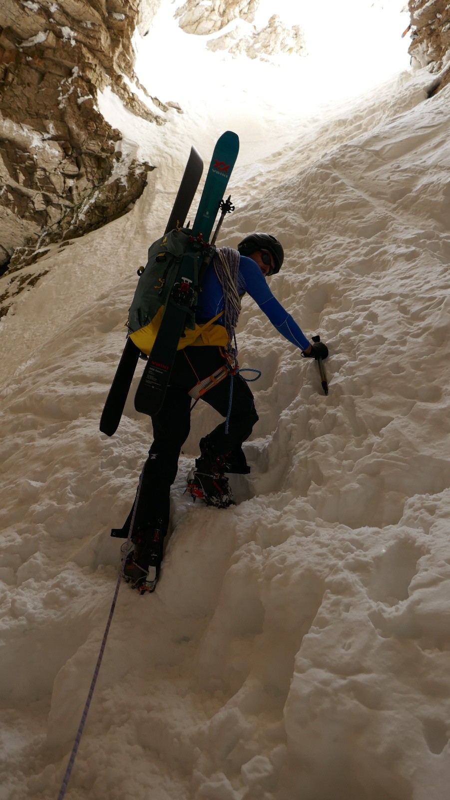 Le premier chourum est large, une belle cascade de glace sur le côté droit. A un seul endroit, au niveau de la sortie, la glace commence à apparaitre mais cela passe sans difficulté. L'arrivée sur l'épaule est belle et permet de voir ce "trou" impressionnant du dessus. Les arches inter ferrantes du suivant nous ont paru plus petites que ce dont on s'attendait. La sortie par le tunnel est très courte mais ludique. La corniche est toujours là, impressionnante, mais le passage vraiment expo reste court. Une montée bien belle, et bien ludique dans ces conditions.