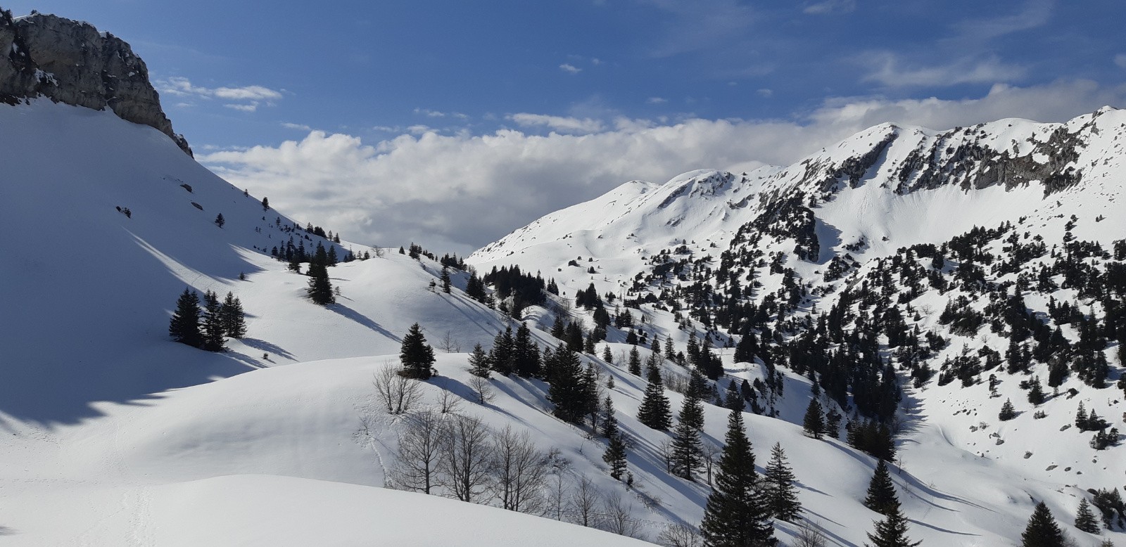 Solitude et silence garantis aujourd'hui, pas âme qui vive, c'est vrai que le ski se résume à la Face E et à la paisible combe du col de la Sure, avec les conditions actuelles j'ai pas tenté le pas de la Biche. En forêt il faut déchausser assez vite, sous 1400m c'est fini, le retour est long jusqu'à la voiture, mais peut-être pas définitivement pour cette saison, à voir...