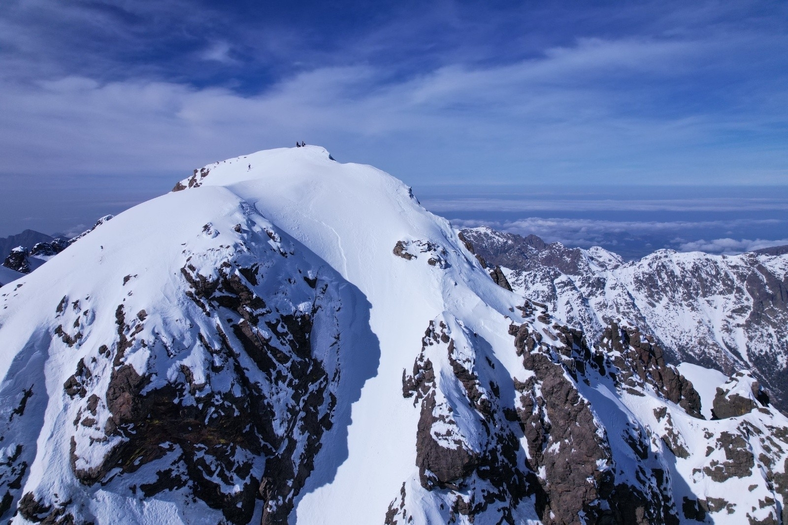 Ce matin c'est mode combat, l'étape initiale s'arrête à Petra Piana après avoir skier la Maniccia et le Rotondo, mais on s'attend à trouver le refuge rempli de neige et devoir pousser jusqu'au prochain, le refuge de l'Onda. Départ tôt donc, skis aux pieds pour une fois, direction la brèche de Sorbo, que j'avais découvert en skiant ici en 2023. Le couloir plongeant sur le lac de Capitellu est toujours aussi beau, la moquette corse ne déçoit toujours pas. Antoine aux photos, Val au drone, l'organisation est digne d'un film Faction collective. On remonte direction le col de Rinoso, puis Bocca Muzella, tantôt en peaux, tantôt en crampons. Arrivés en haut, on découvre la longue crête qui mène au refuge de l'Onda, elle est en pleine tourmente dans une vaste mer de nuages venue de l'est. On adopte la technique de l'autruche et on monhe à la Maniccia, histoire de satisfaire nos envies compulsives de moquettes. On fait une croix sur le Rotondo pour le plus grand malheur d'Antoine, pas le temps. Mais la vue est belle, de là on voit tout ce qu'on a déjà parcouru et ce qu'il reste à faire !
