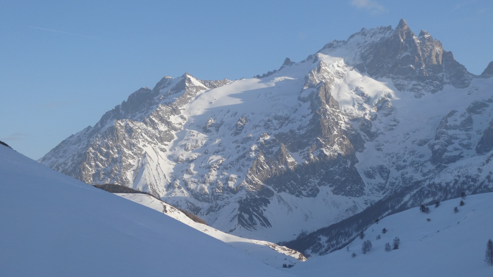 Contraste entre les blanches lignes de la Grande Buffe et les contreforts de la Meije