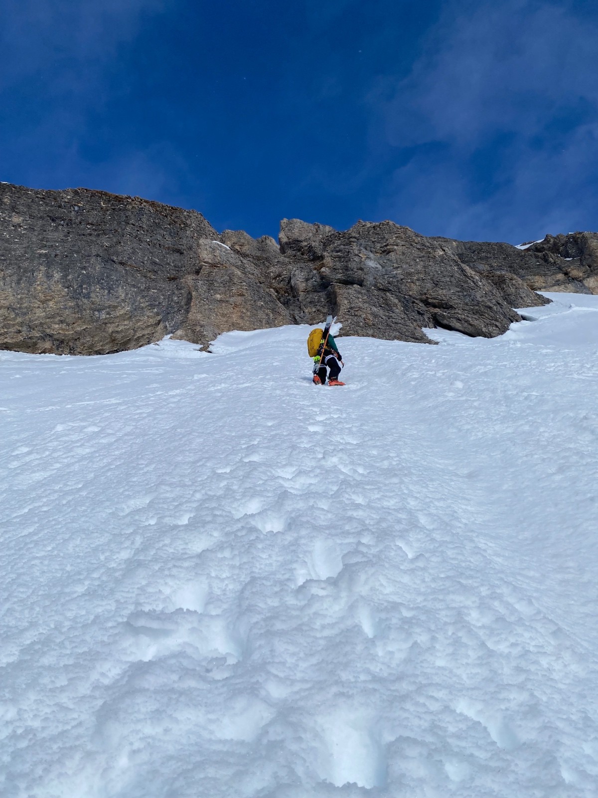 Tentative de descente par le même itinéraire. Bah c’est de la merde. C’est bleu armé dans une cot relativement élevée et surtout aussi exposée on fait pas trop les malins avec nos skis au pied.