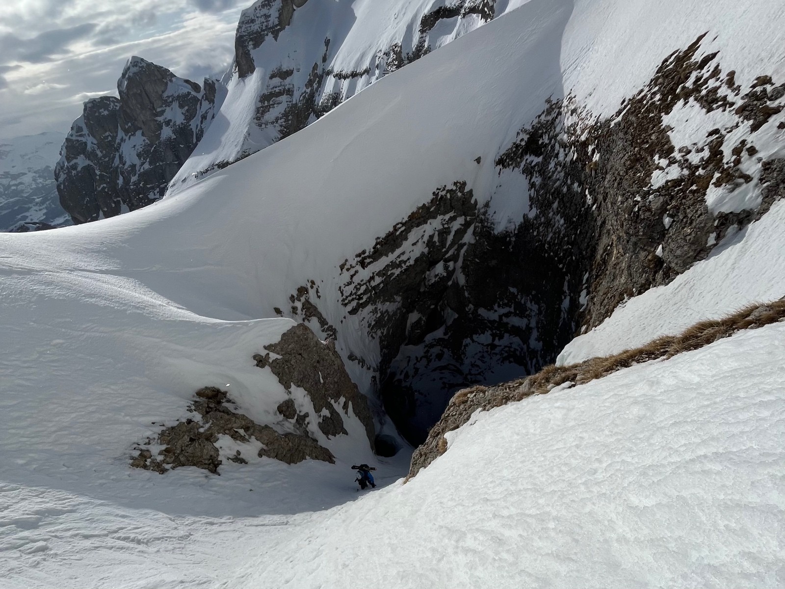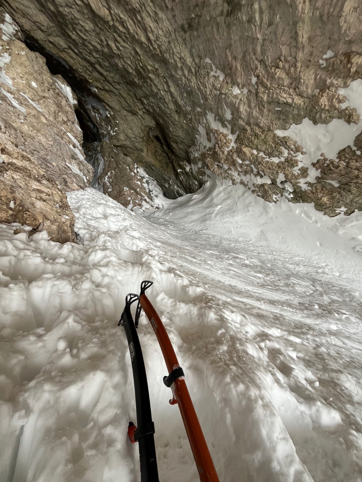 on fait un premier rappel, dans le premier chourum dans le sens de la descente. On skie 4 ou 5 virages plus que concentrés dans le chourum, en vrai c’est majeeeeeeur. Mais Tom fais un virage de plus, un petit dérapage et se retrouve sur une section très dure, même en super G la neige est pas aussi dure. Dans une pente à au moins 50 degrés, au dessus d’un toboggan et du grand saut. Je lui envoie la corde et l’assure avec un corps mort pour qu’il puisse passer la section et se mettre dans un endroit plus tranquille pour remettre les crampons.