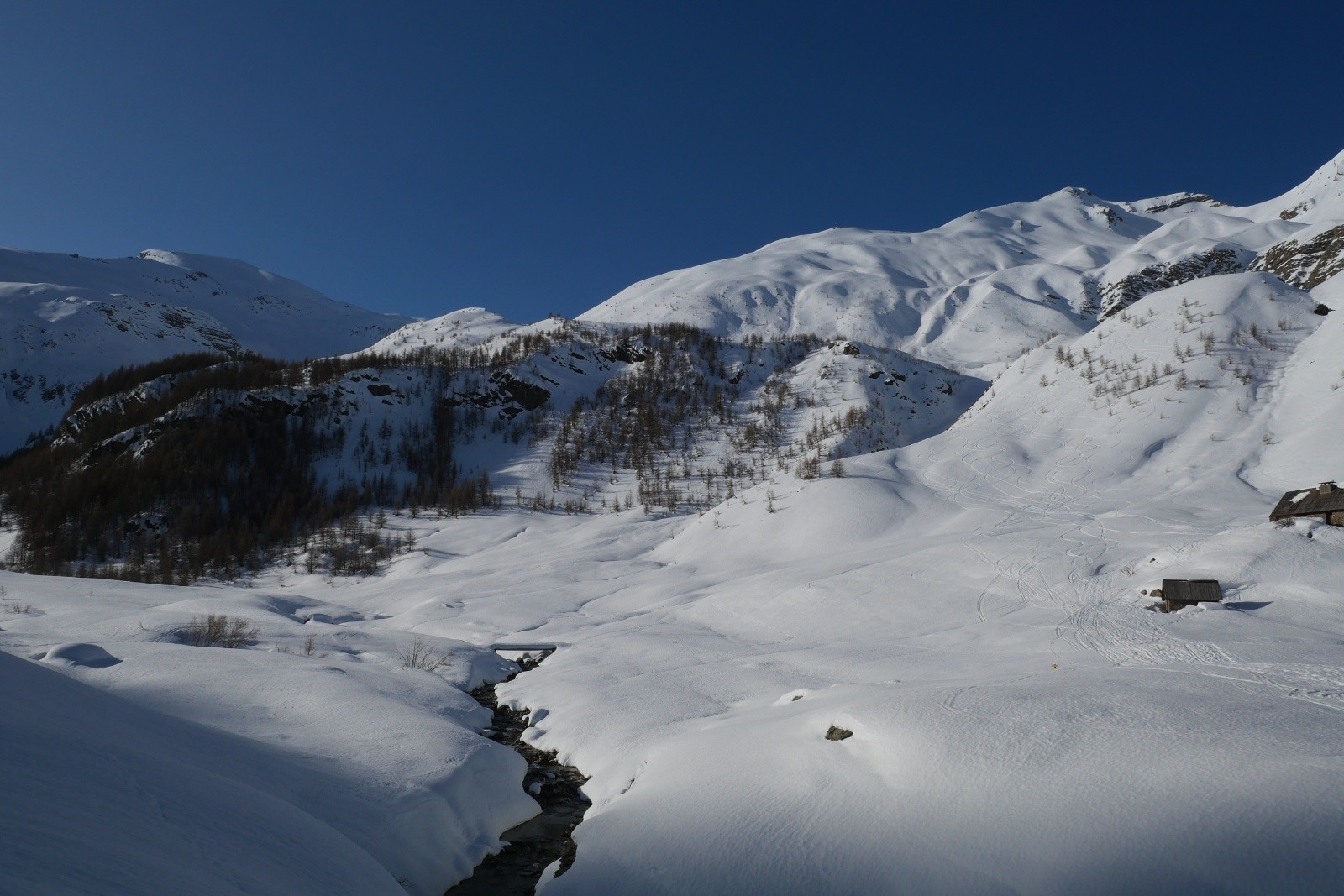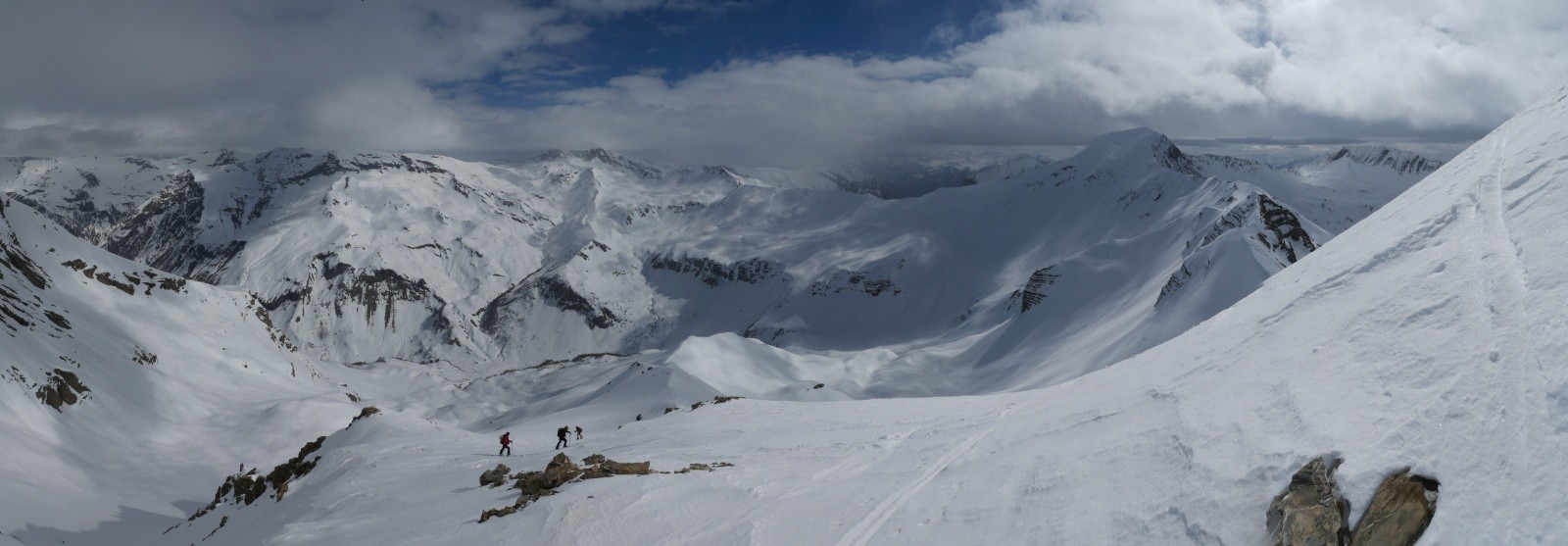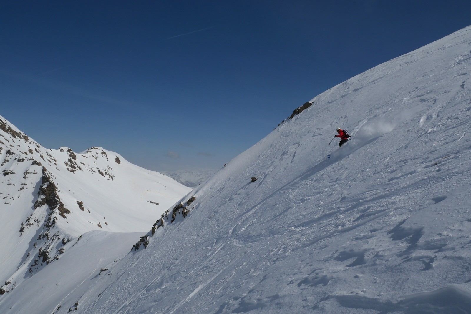 Conditions nivo et activité avalancheuse : Aucune activité avalancheuse lors de ce séjour. Les faces ensoleillées sont bien stabilisées. Et en Nord en altitude, vieille poudreuse sans cohésion en surface, parfois cartonnée, reposant généralement sur une épaisse couche de grain fin (on n'atteint pas la sous-couche fragile persistante quand on teste avec le baton).