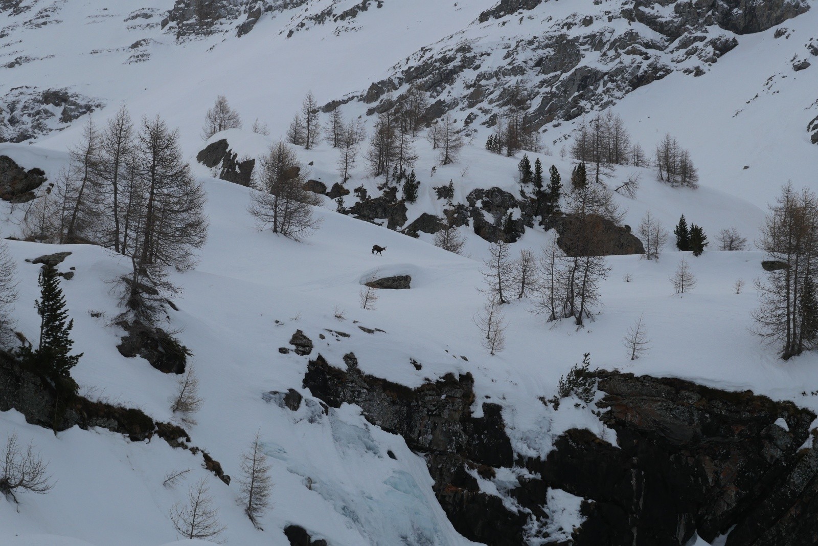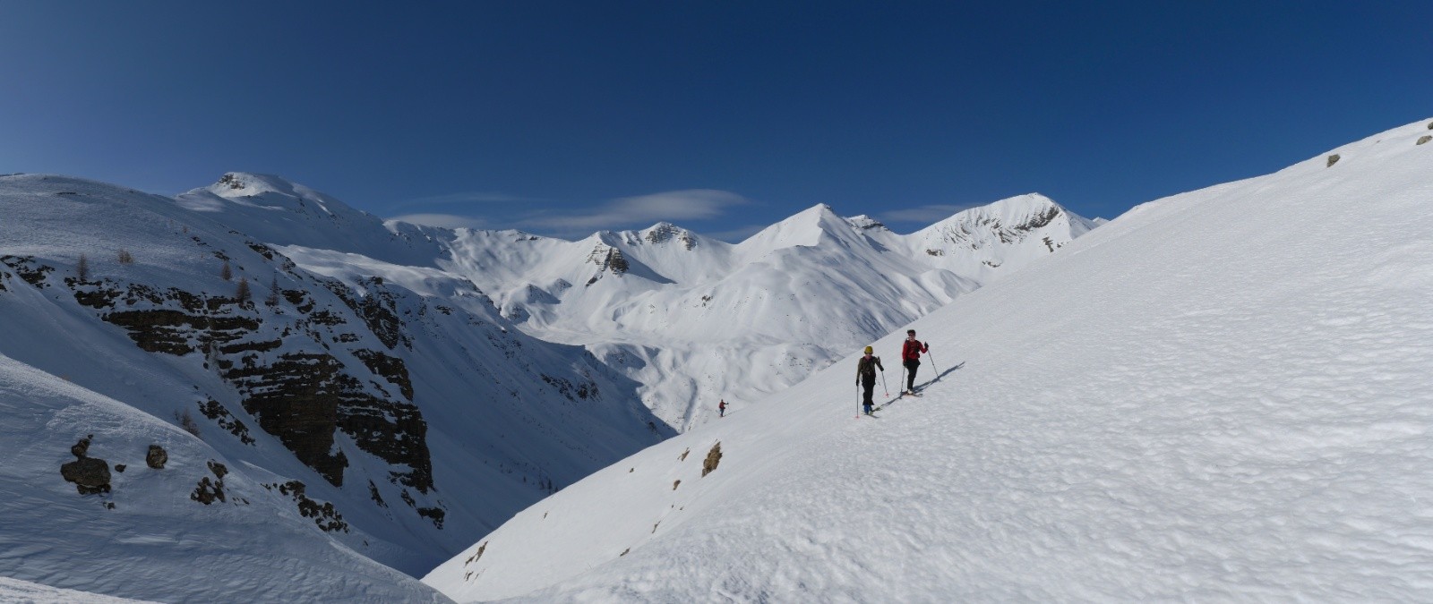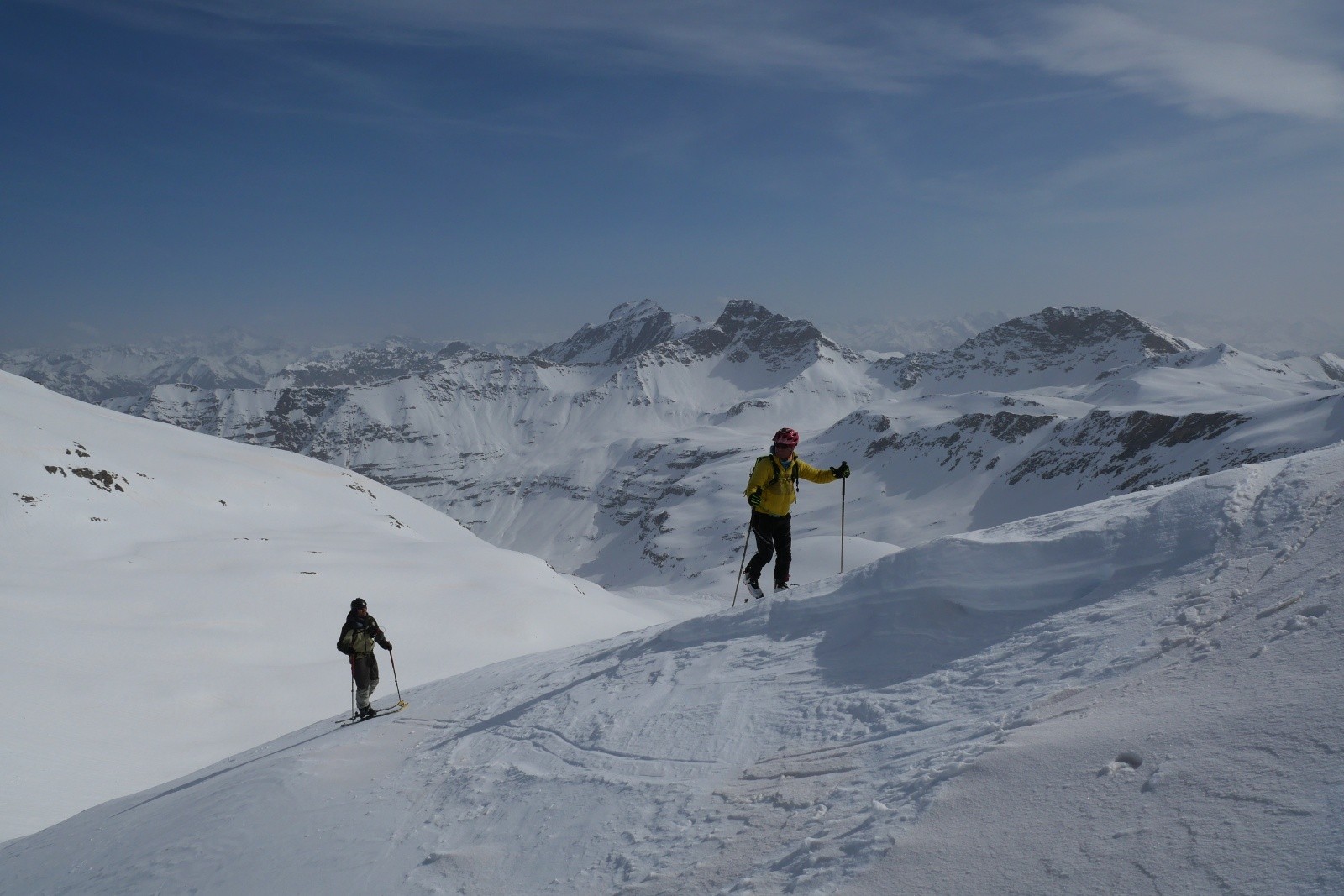 Conditions nivo et activité avalancheuse : Aucune activité avalancheuse lors de ce séjour. Les faces ensoleillées sont bien stabilisées. Et en Nord en altitude, vieille poudreuse sans cohésion en surface, parfois cartonnée, reposant généralement sur une épaisse couche de grain fin (on n'atteint pas la sous-couche fragile persistante quand on teste avec le baton).