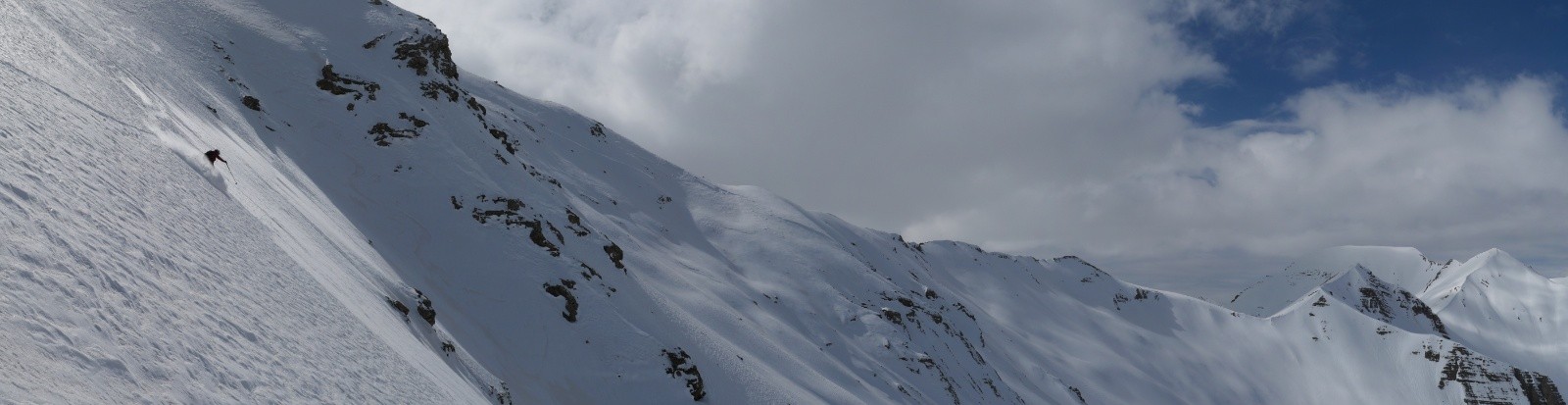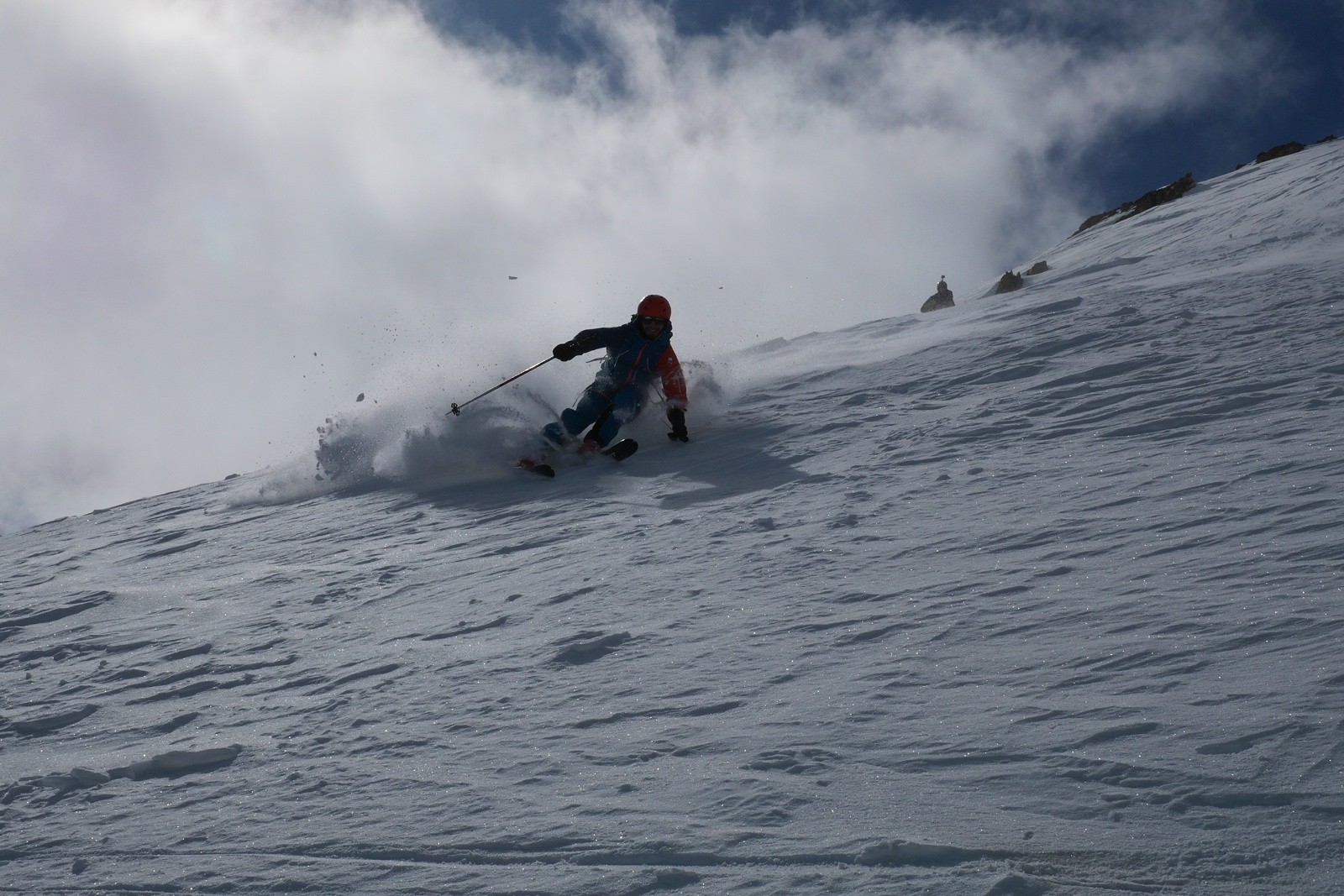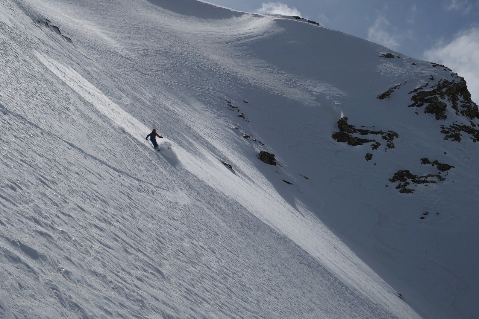 C'est maintenant l'heure de la descente dans cette magnifique face et pour l'occasion on envoie le grand sage Patrick en éclaireur. On n'aura pas les 30 cm de poudreuse attendus/survendus par un guide du coin, mais dans l'ensemble cela se skie très bien et c'est une régalade pour tout le monde (chacun son tour pour plus de sécurité et pour laisser reposer les cuisses). A noter que Adrien et Ludo réalisent ici leur première face en 4, bravo !