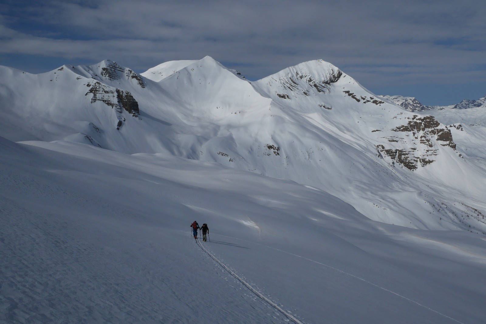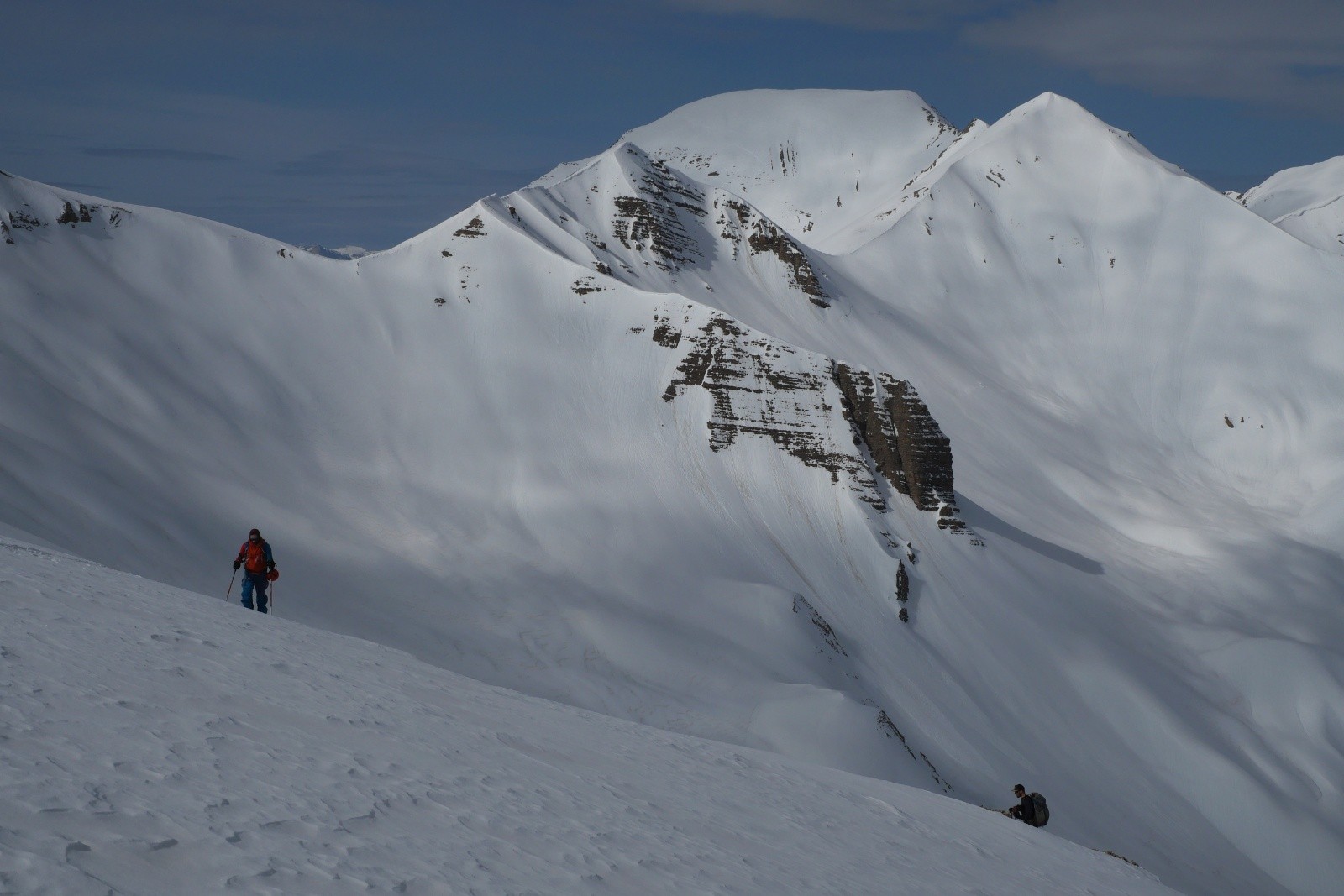 Nous voilà maintenant dans la face nord : la remontée se fait dans de la vieille poudreuse parfois cartonnée qui brasse un peu à la montée ! Pendant le picnic au soleil, c'est l'occasion de faire coucou au sommet du lendemain. Malheureusement il n'a pas répondu à nos grands gestes, c'est l'A-Mourre froid.