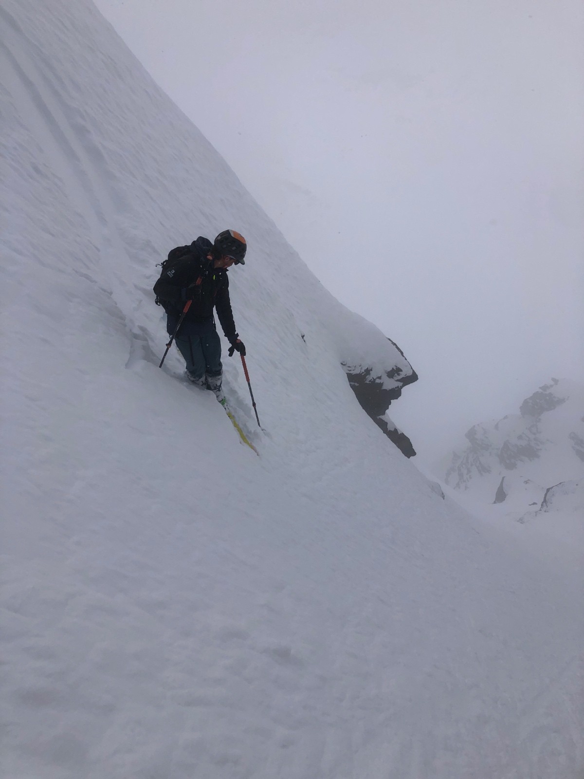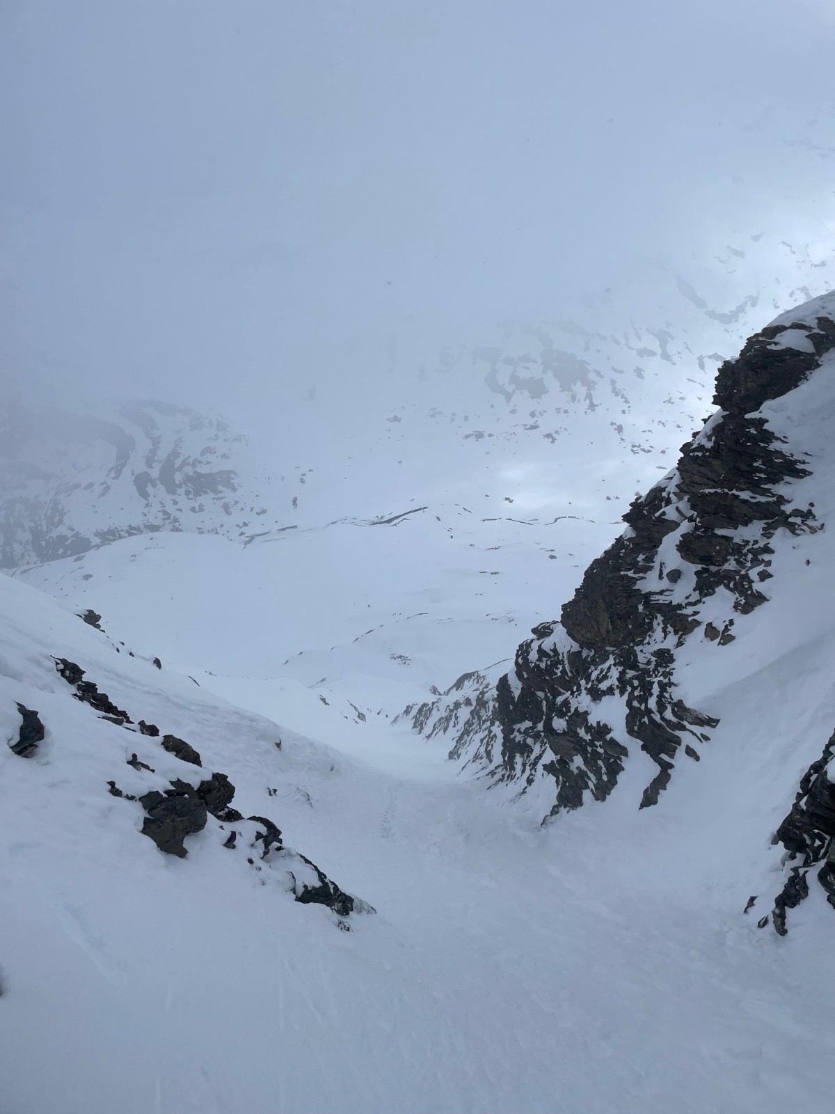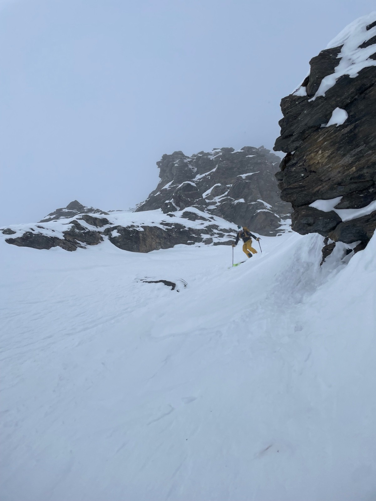 - vieille poudre (gobelet) excellent à skier sous la crête avant l'entrée du couloir (~3100 m), mais gros brassage à la montée (on remet les peaux).
