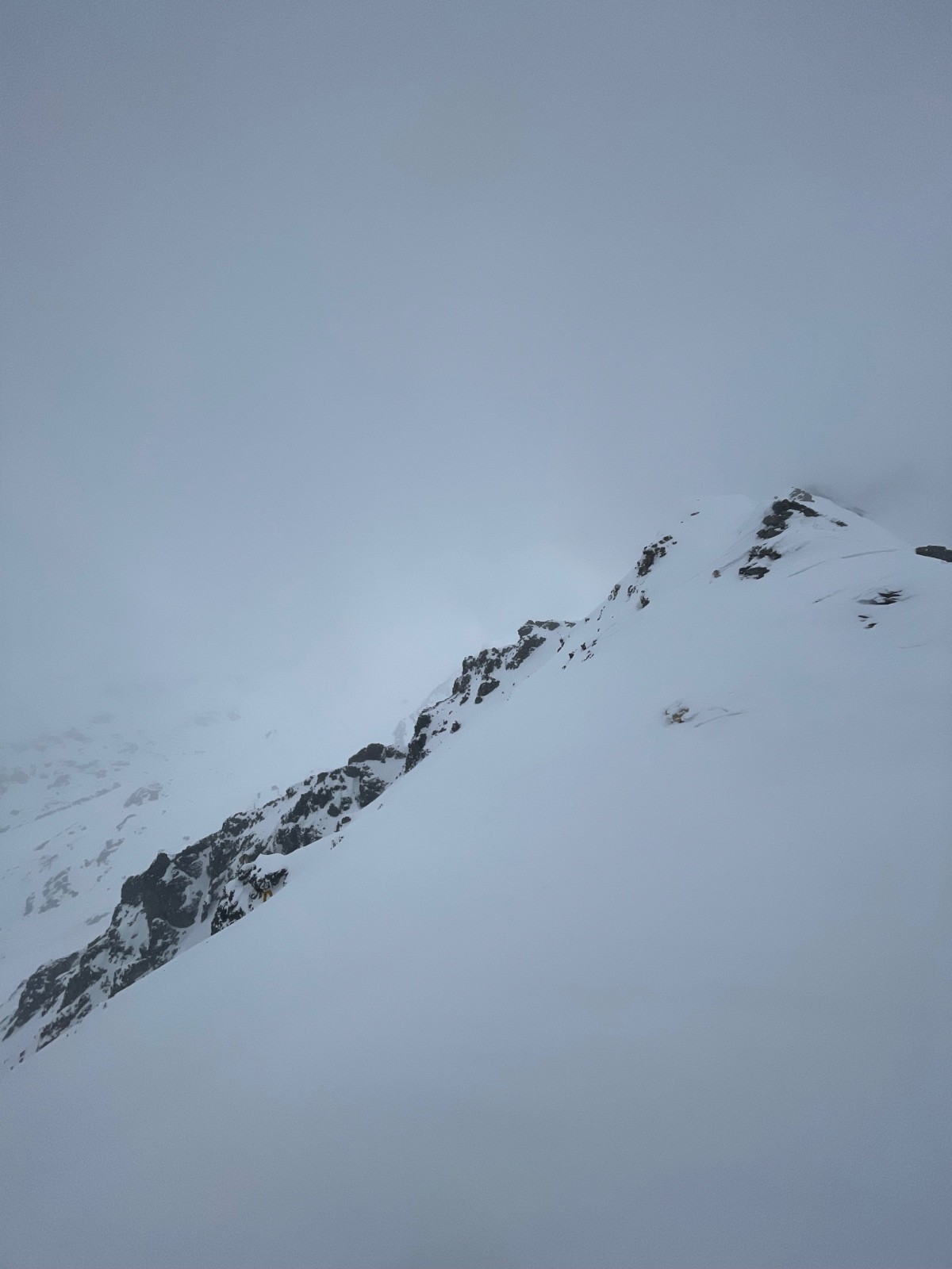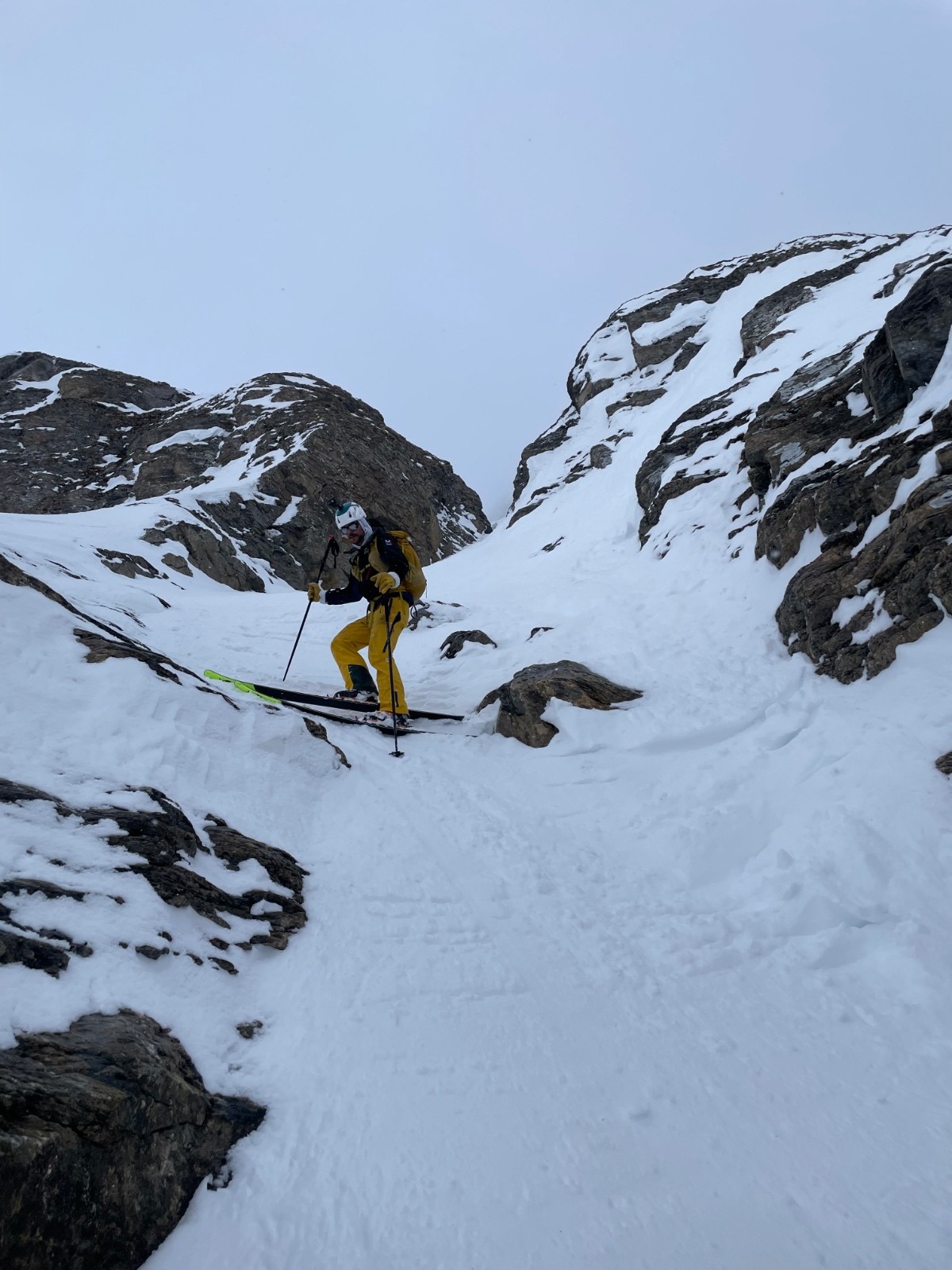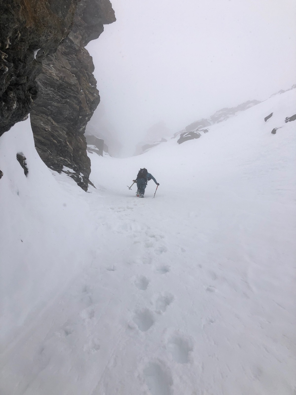 - vieille poudre (gobelet) excellent à skier sous la crête avant l'entrée du couloir (~3100 m), mais gros brassage à la montée (on remet les peaux).