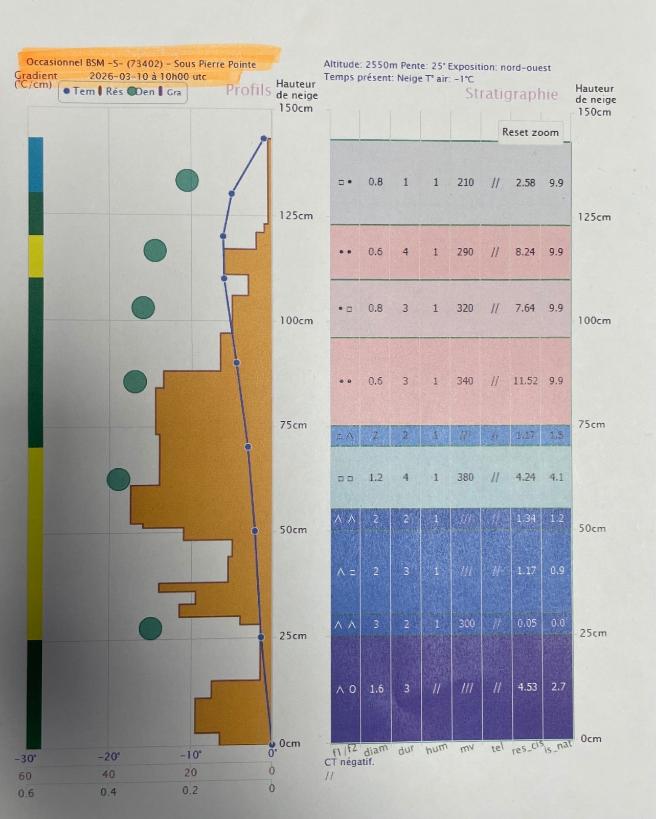 Le site du sondage du jour est une pente Nord-Ouest à 2500 m sous Pierre Pointe. L'enneigement y est un peu moins bon qu'aux alentours (zone ventée), le gobelet de décembre se trouve alors moins enfoui que dans la majorité des autres pentes. Néanmoins, le profil n'est pas alarmant : d'une part les 70 cm qui recouvrent le gobelet sont majoritairement très denses (grains fins), permettant de bien les isoler de la contrainte d'un skieur, d'autre part les gobelets se sont tassés et densifiés, les rendant moins réactifs. Le test de la colonne (CT) illustre bien cette faible réactivité, puisqu’il est négatif. Il reste quand même des points d'attentions :