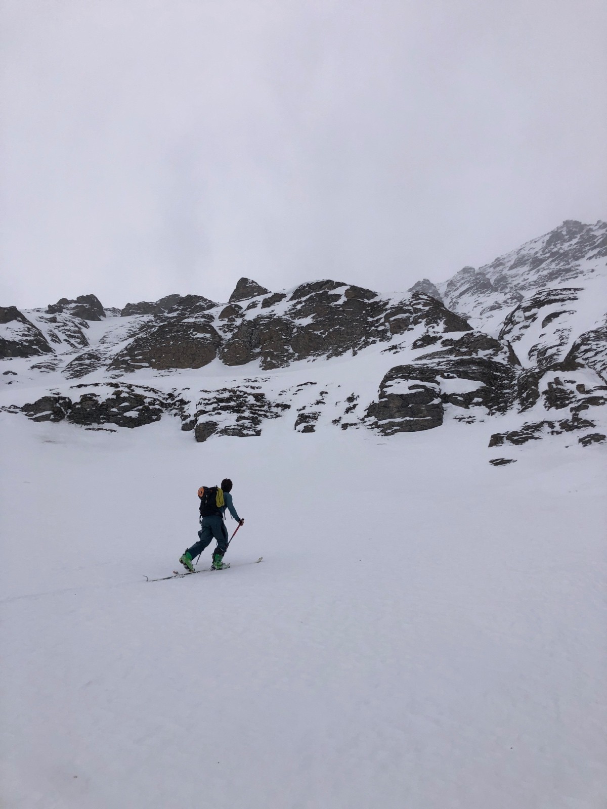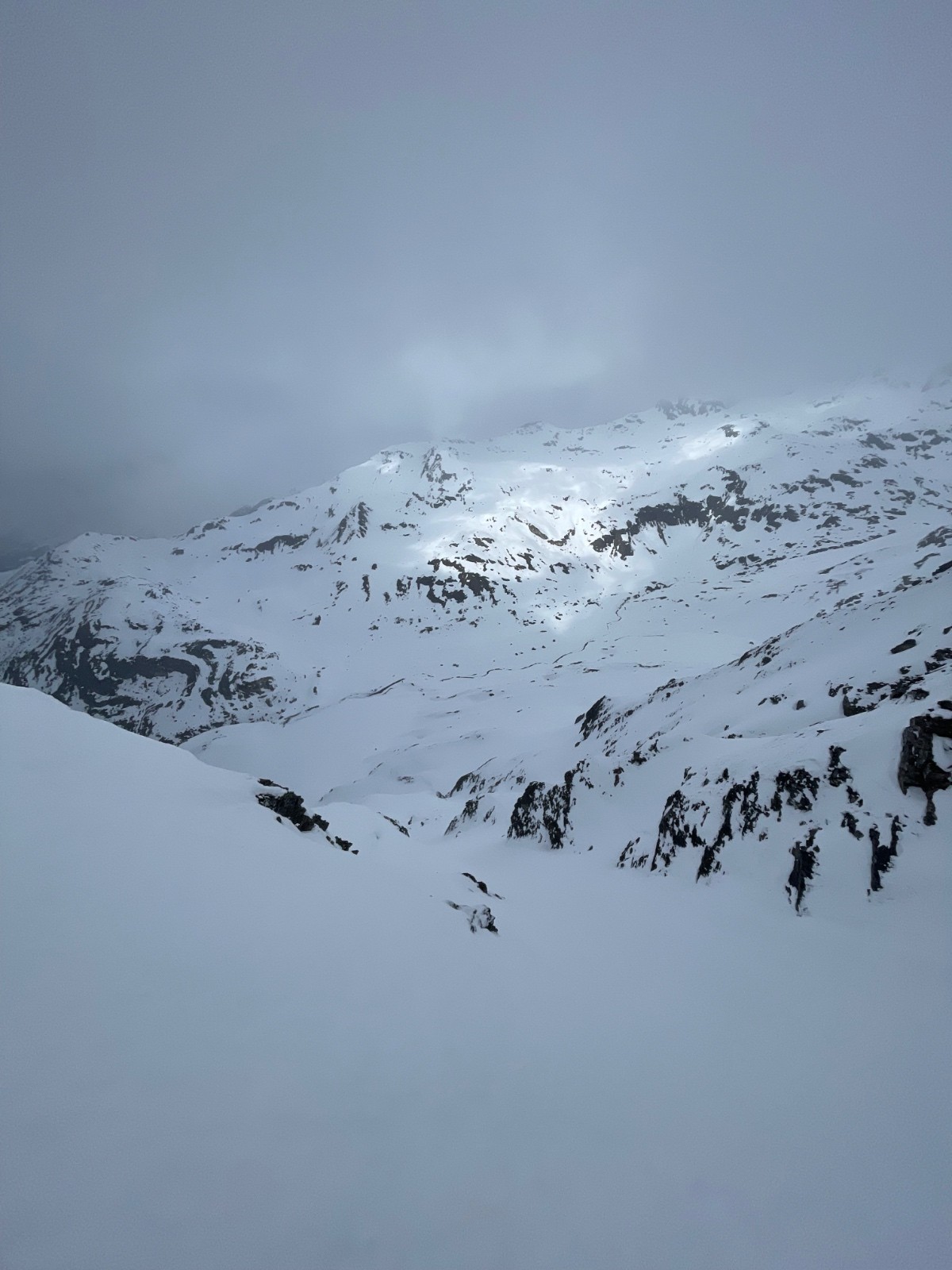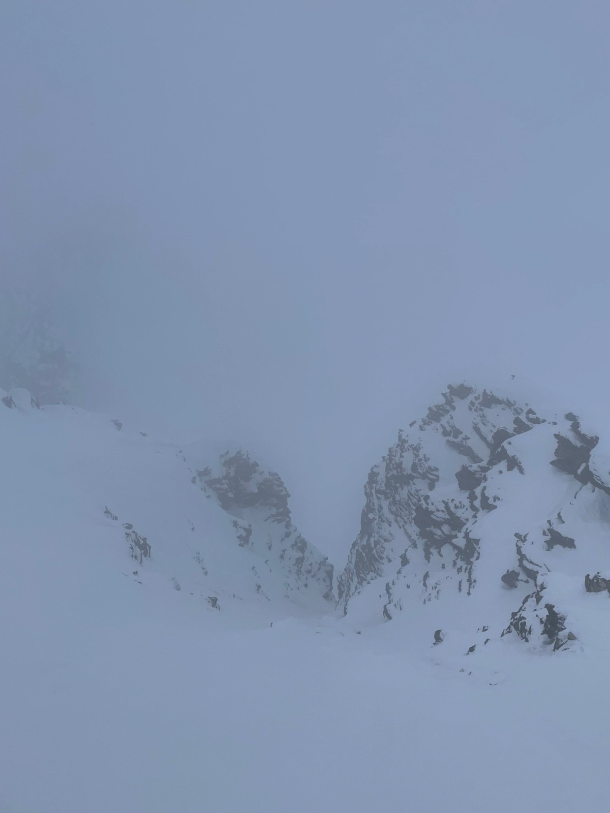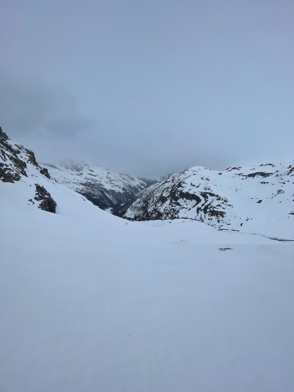 20 jours après la fin des chutes remarquables de février, le manteau s’est bien stabilisé. Depuis un petit moment, il est possible d’aller mettre les skis en haute montagne, ou dans des pentes Nord un peu plus raides, sans craindre de déclencher toute la face. Avec le mauvais temps, on se décide pour le pèlerinage annuel dans le vallon en amont du Monal, celui du Clou. La face Nord du Rocher de Pierre Pointe (celle rigoureusement au-dessus du barrage) a été le théâtre de grandes avalanches mi-février. Les dépôts, issus d’avalanches de poudreuse avec aérosol, sont encore visibles bien qu’ils ne soient pas composés de grosses boulettes infâmes. En conséquence la face est assez sèche (puisque tout est en bas) mais bien skiable pour autant. Elle nous laisse profiter d’une pente sommitale excellente et d’un couloir très esthétique dans ambiance nuageuse mystique.