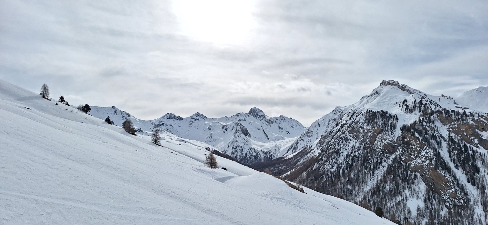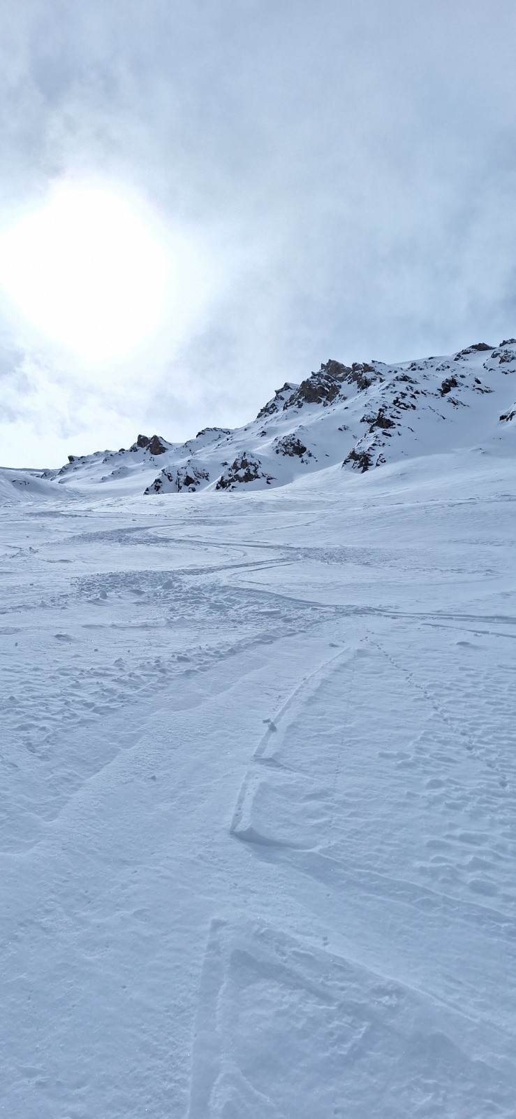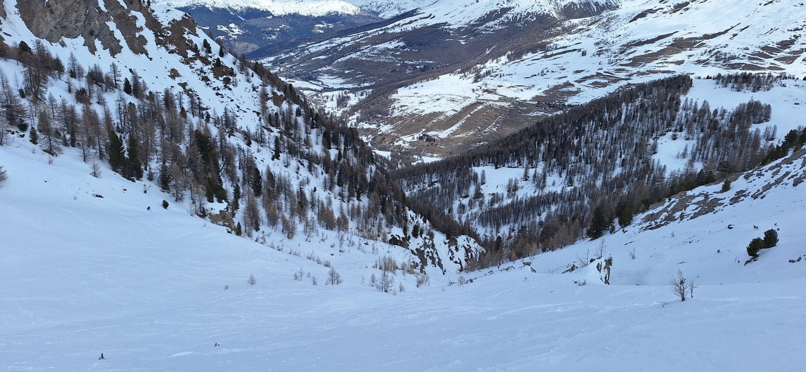- Descente de la Pointe des Marcelettes en poudre 10-15 cm sur fond trafollée avec un passage légèrement glacé (très court mais raide) avant Saint Veran.