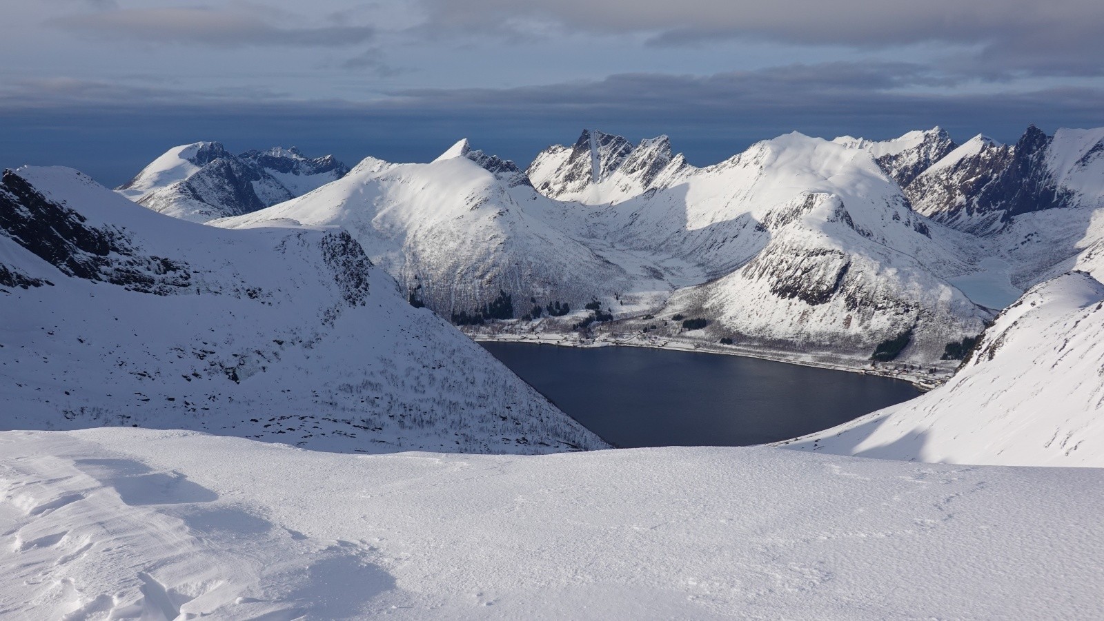 Le panorama sommital s’offre dans toute sa grandeur : les silhouettes caractéristiques du nord de l’île se dressent fièrement comme le Luttind et son couloir rectiligne caractéristique, tandis que le majestueux Stormoa, second sommet de Senja, domine l’horizon vers le Sud comme un géant bienveillant, gardien des fjords et des vallons enneigés.