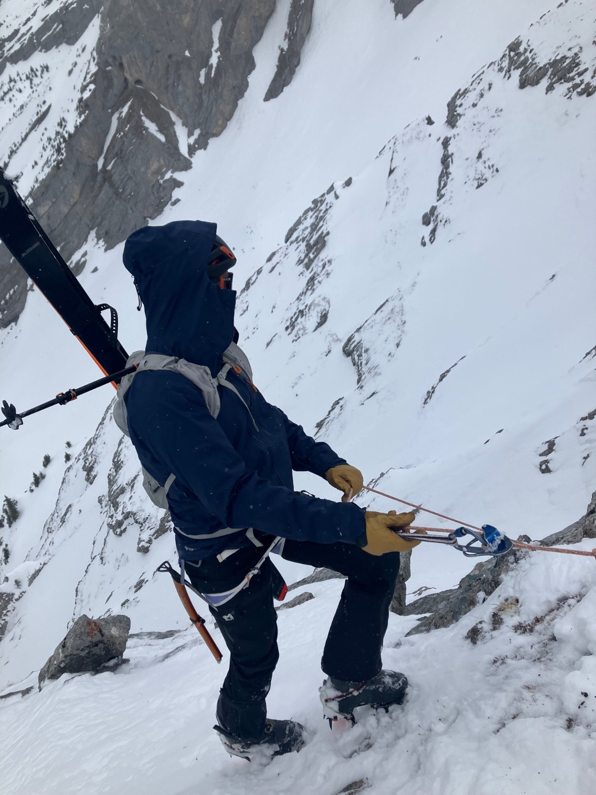 Par contre on est pas dans la ligne prévue, plus centrale. On longe la falaise et les dalles bien plus présentes. Entre le mauvais temps et le vent, pas trop le temps de chercher à se remettre dans la ligne, on y va.