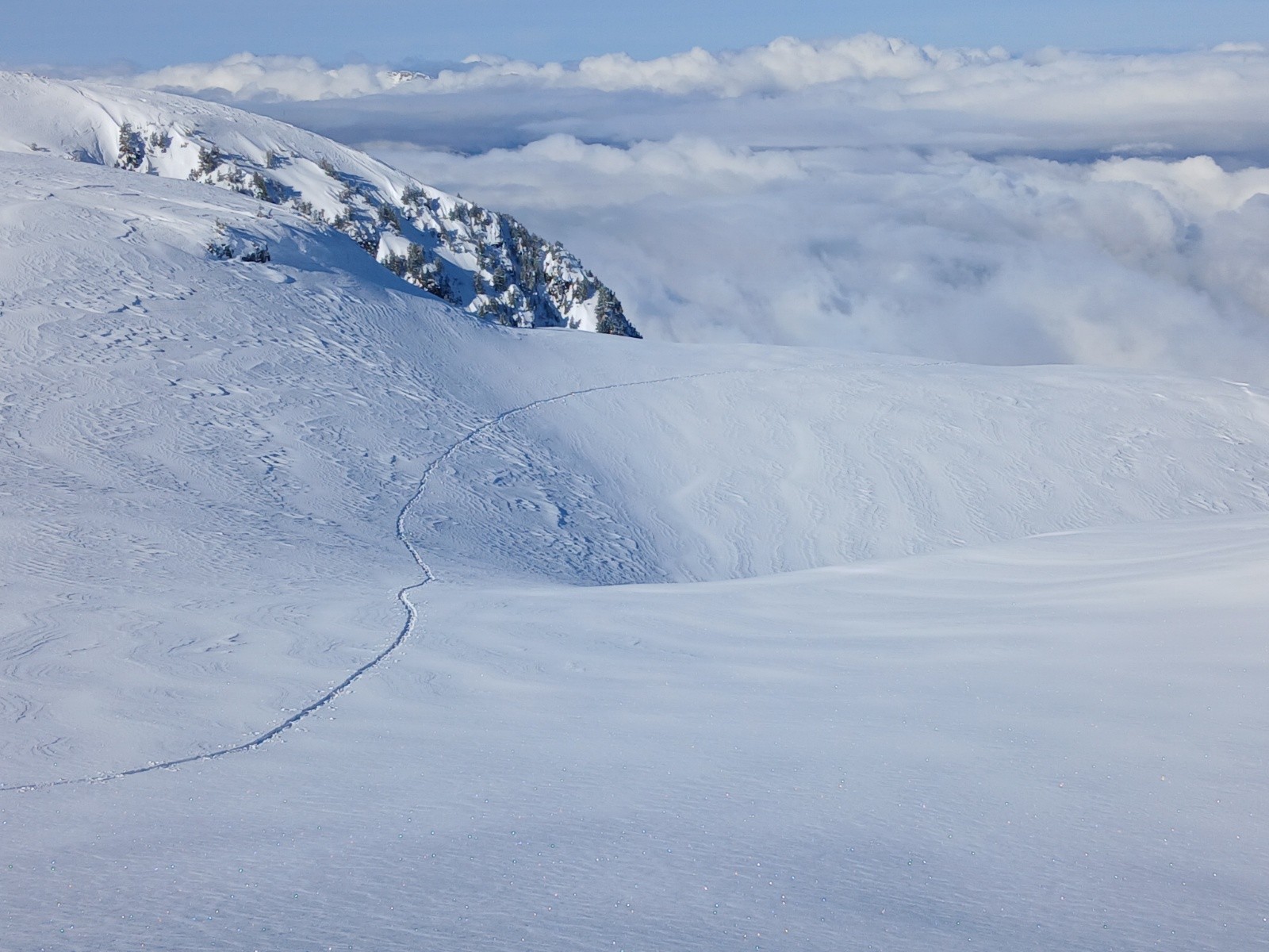 Les 20cm annoncés sont bien là, mais neige souvent ventée/un peu plaquée prenant les skis, et qui a très vite réchauffé donc lourde voire collante. Cela part en petites plaques (de quelques cm à bien 30cm là où accu).