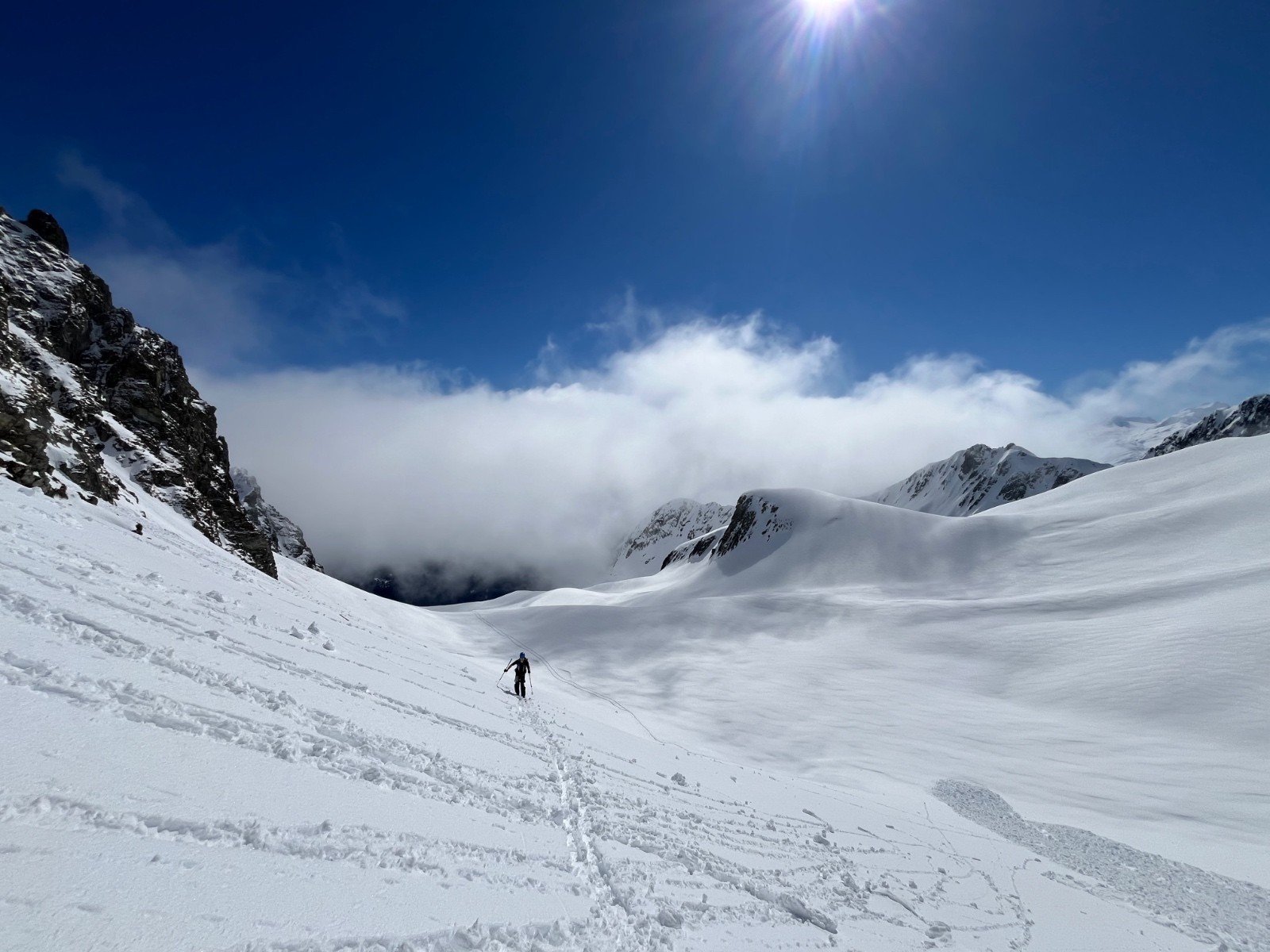 Partis pour enchaîner le Rectiligne et le Natey en boucle pour éviter le brassage et les purges en remontant les couloirs. Le col des Fouages est en bonne neige froide, on a tracé à pied les 100 derniers mètres plus raides et étroits. Descente côté Balmette dans une neige très humide et remontée à la brèche d’accès au couloir nord puis remontée de l’arrête en bon rocher jusqu’à l’entrée du rectiligne. Au sommet du couloir, aucune accumulation, on voit les vielles traces d’avant la chute de neige de la nuit. Personne ne monte dedans. Après quelques mètres en dérapage, j’atteins la fraîche que je teste avant de faire un premier virage, rien ne bouge. Au premier virage appuyé, une plaque se décroche quelques mètres au-dessus de moi sur 20cm d’épaisseur. Je réussis à prendre appui sur la sous-couche dure pour ne pas me faire emporter. Tout le couloir part jusqu’en bas avec un bel aérosol. Content d’être resté en haut. On était en alerte car la remontée dans les Fouages avait montré une mauvaise cohésion avec la vielle neige. Descente sur la sous-couche dure sur la moitié supérieure puis sur les contrepentes en bonne poudre qui sont restées en place.