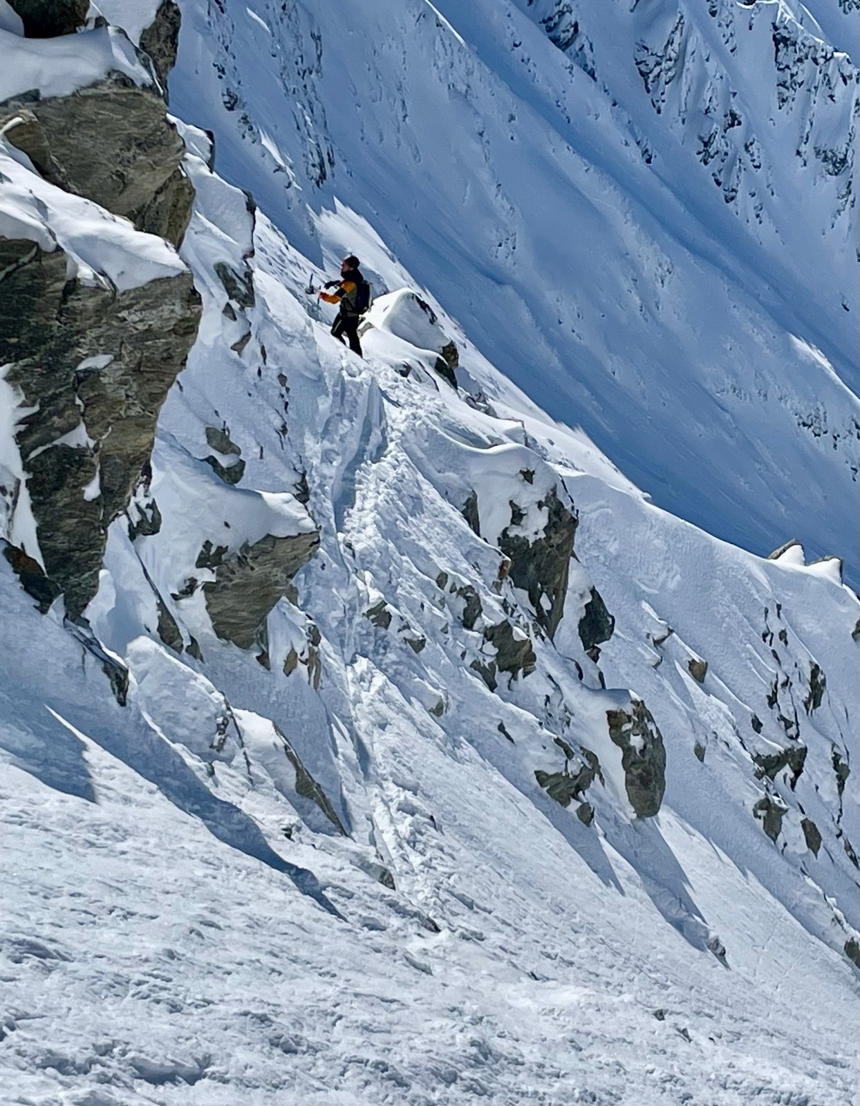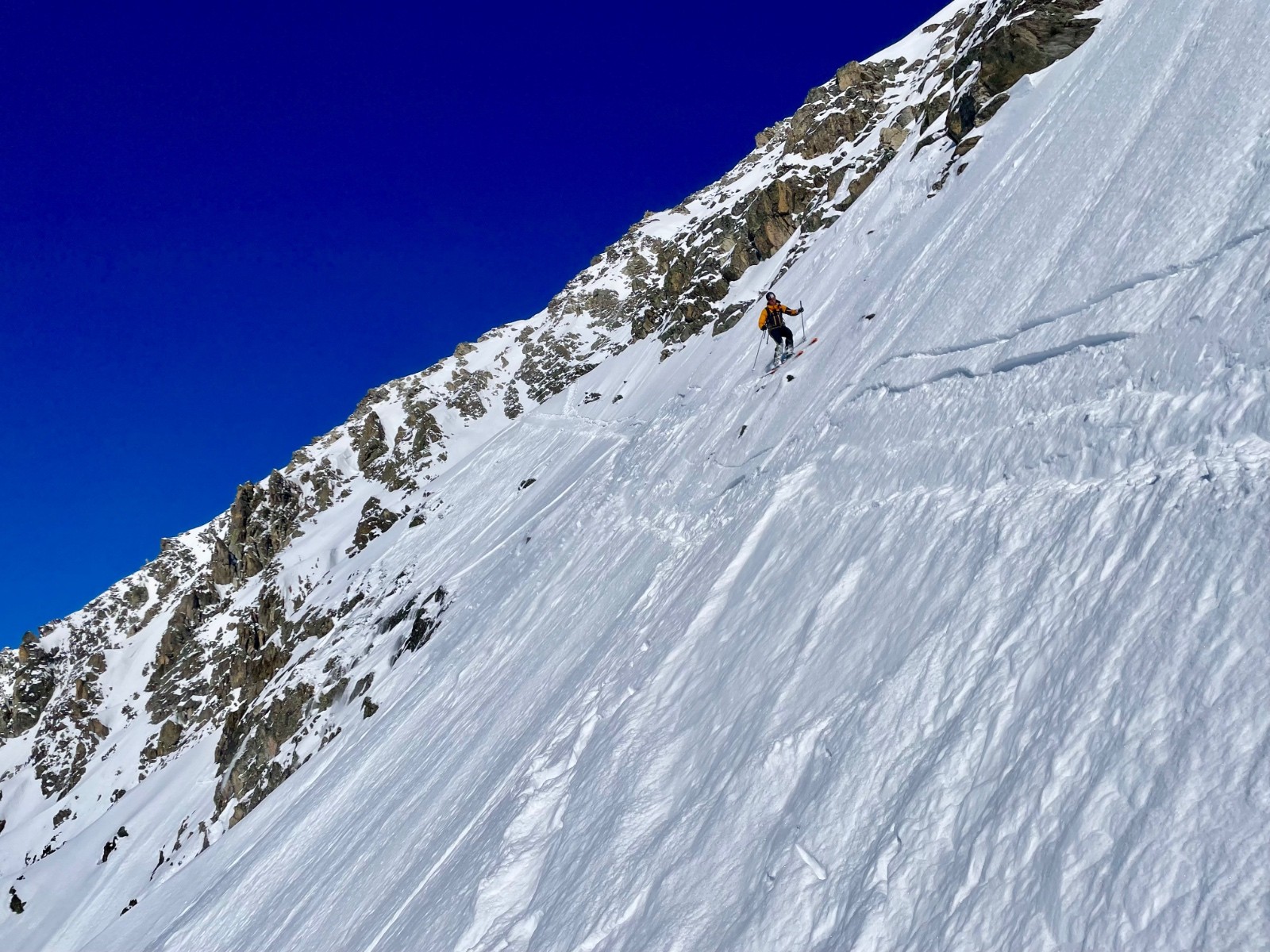 Il est difficile de trouver cette face en bonnes conditions, déjà parce que les orientations sont multiples, mais aussi parce que le couloir central coule très vite au printemps, le rendant impraticable. Enfin c’est un peu un labyrinthe et il est facile de faire des choix d’itinéraires qui mènent à des ressauts ou des passages compliqués.