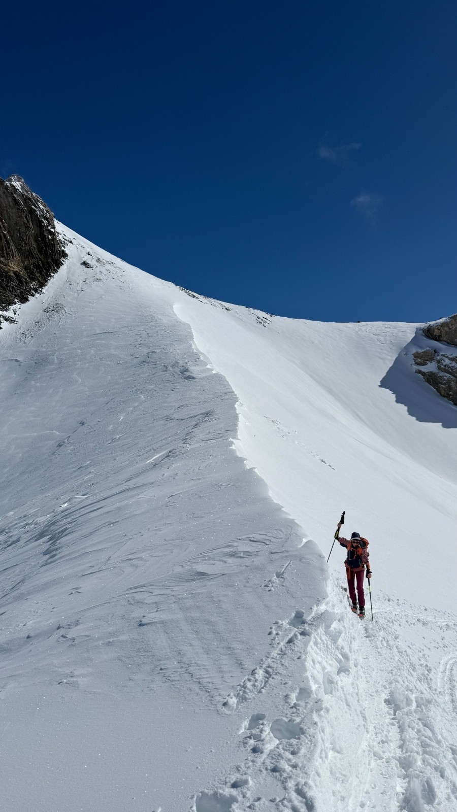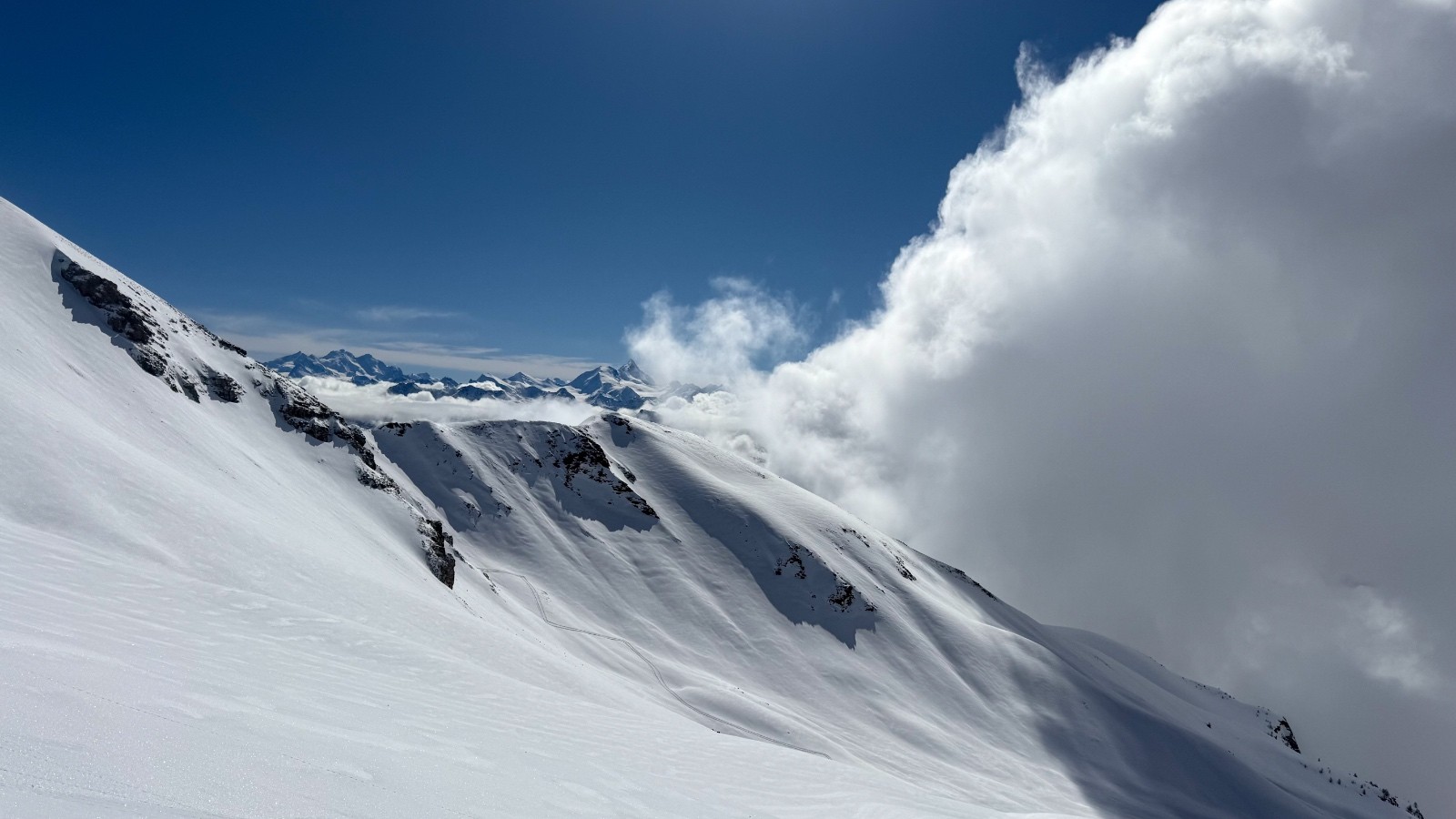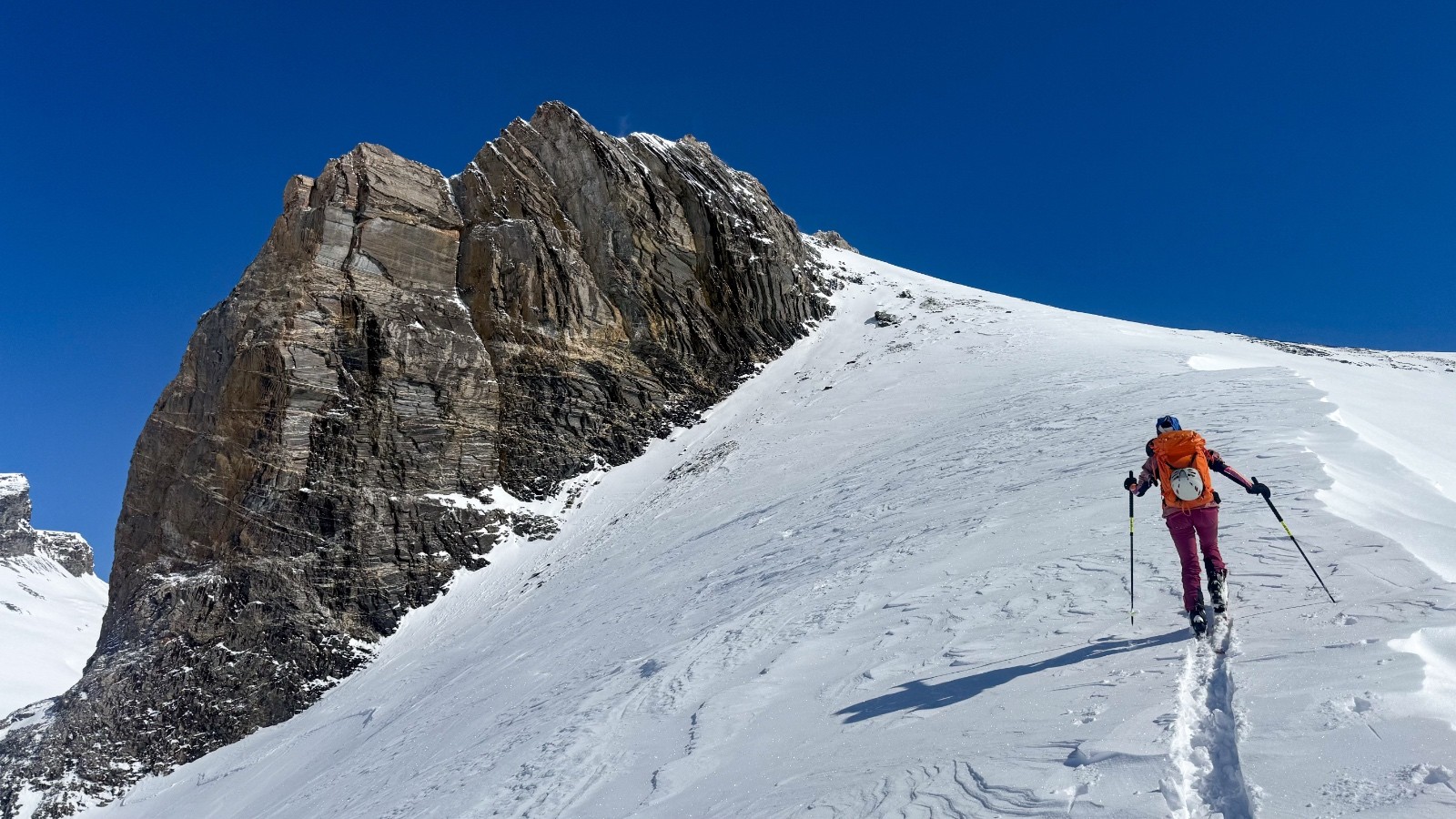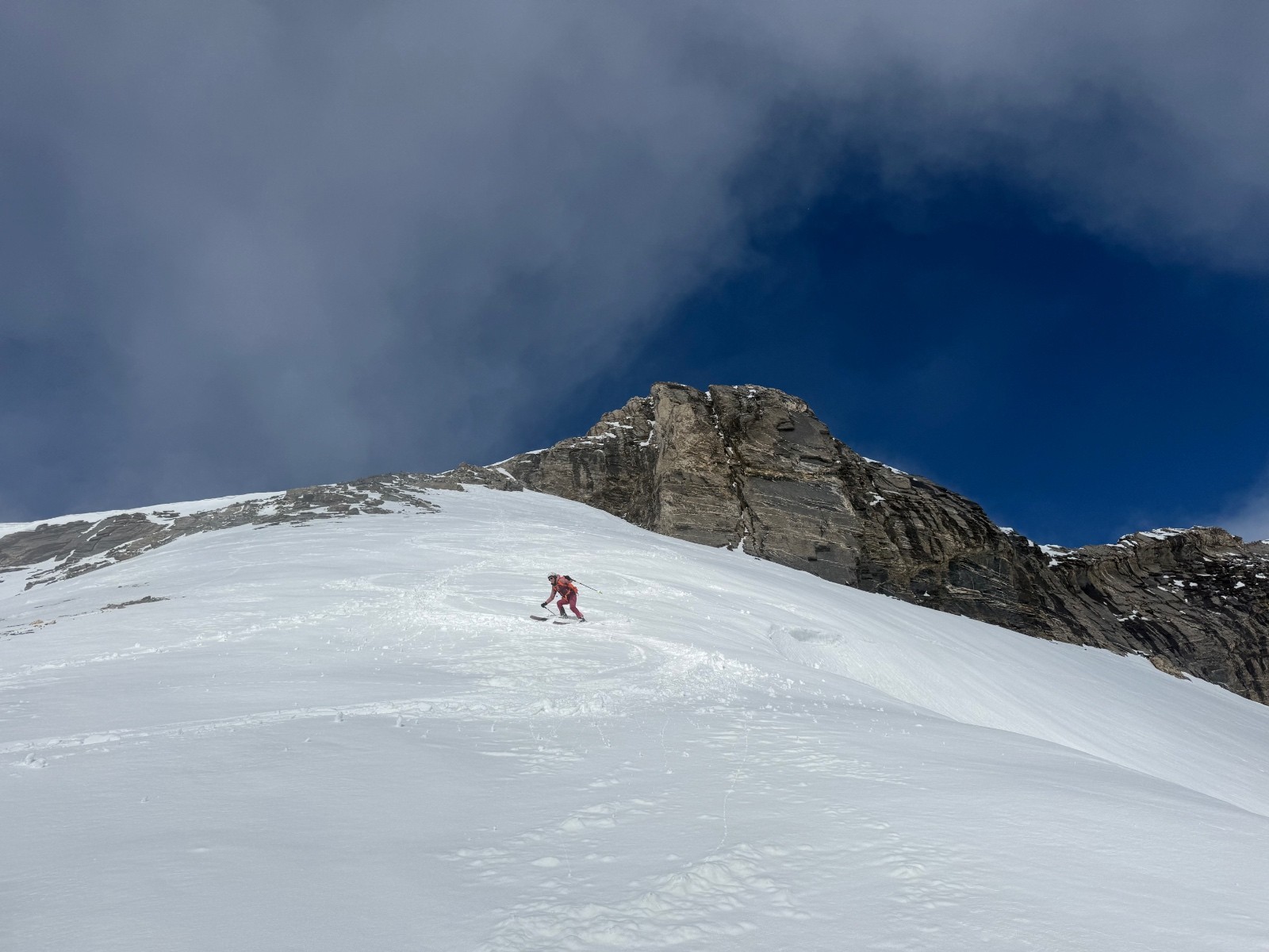 Horaires : montée 4h ,des paysages grandioses avec les nuages qui se déchirent sur la crête des Alpes valaisanne, le ski est bon mais pas excellent car on sent le fond humide sous la couche de neige fraîche , sinon le picnic au sommet et l’ambiance du matin à la trace dans le vallon de la tieche resterons mémorable !!