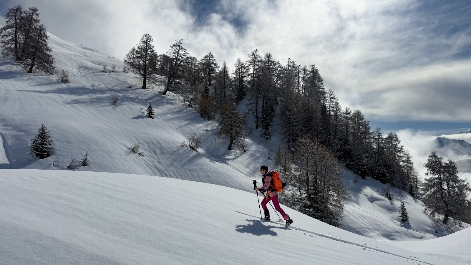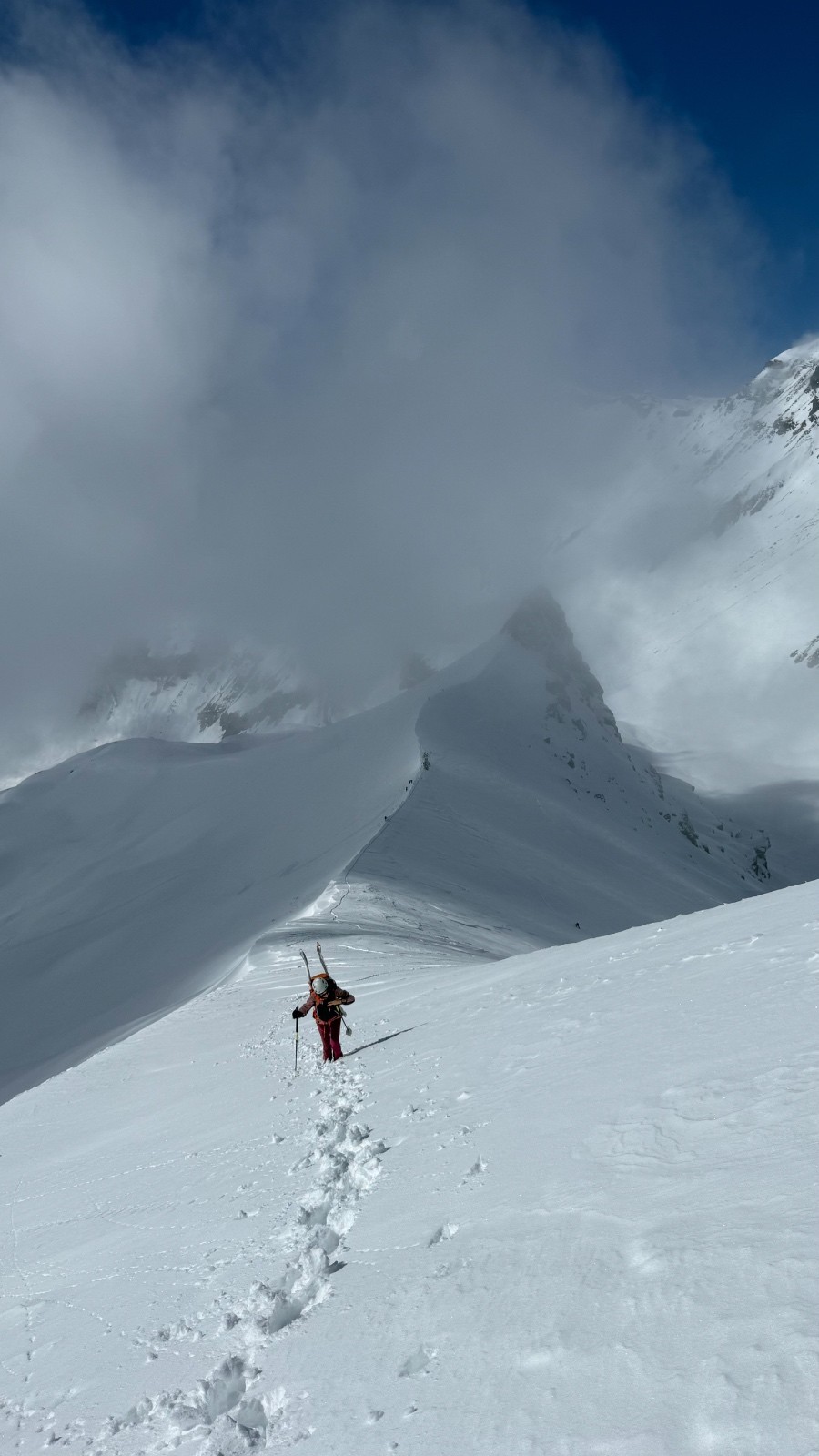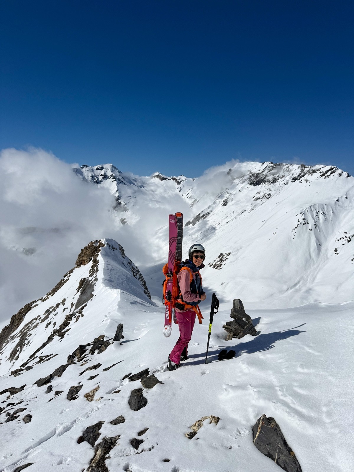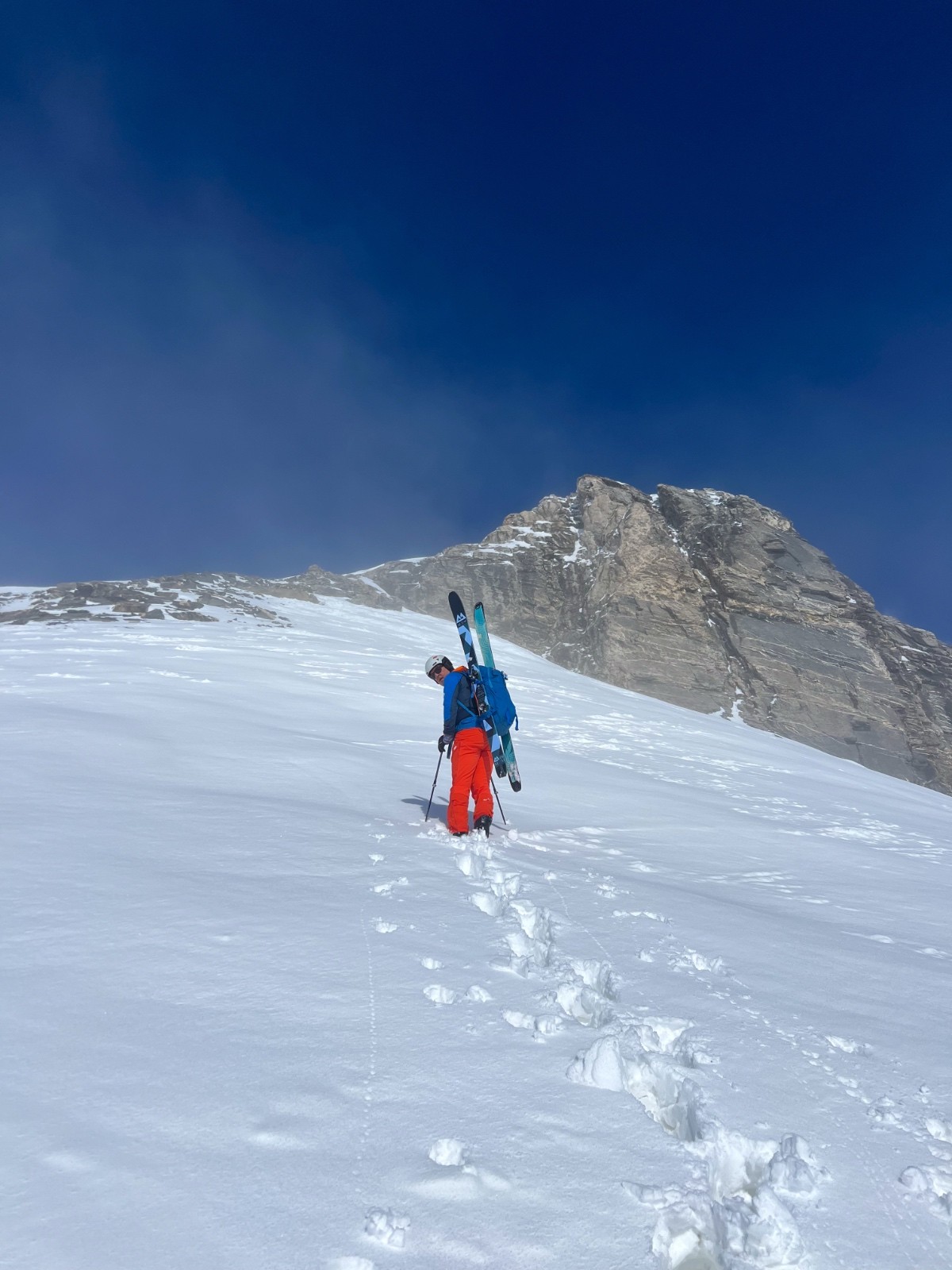 Horaires : montée 4h ,des paysages grandioses avec les nuages qui se déchirent sur la crête des Alpes valaisanne, le ski est bon mais pas excellent car on sent le fond humide sous la couche de neige fraîche , sinon le picnic au sommet et l’ambiance du matin à la trace dans le vallon de la tieche resterons mémorable !!