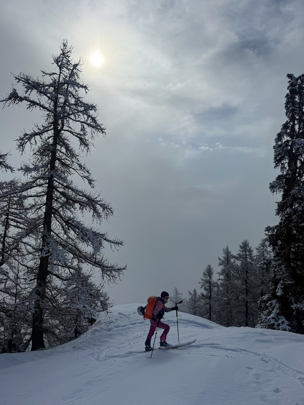 Conditions pour le ski : neige fraîche transformant vite , de nombreux skieurs qui tracent pour le défi de faverges ce week-end, on est seul au sommet par contre