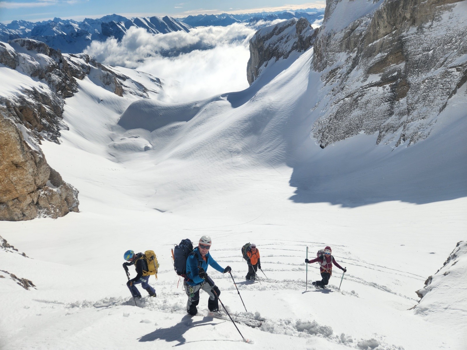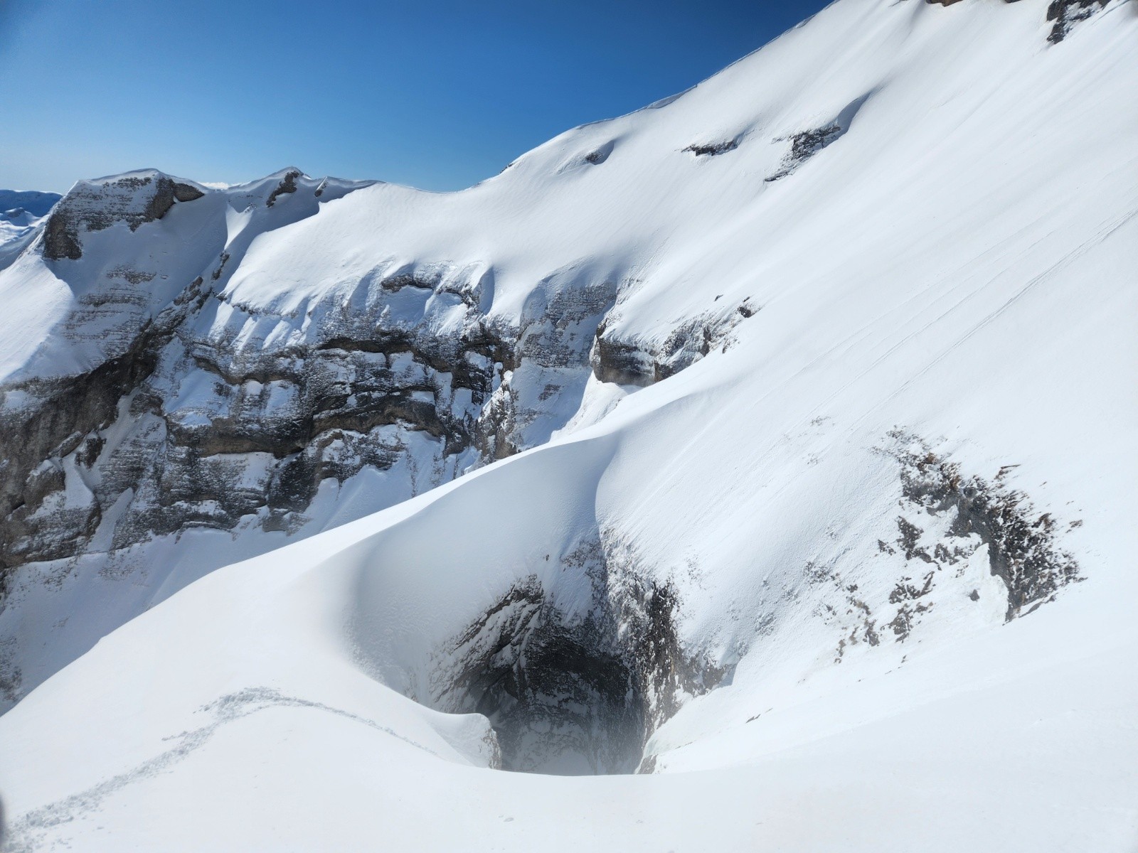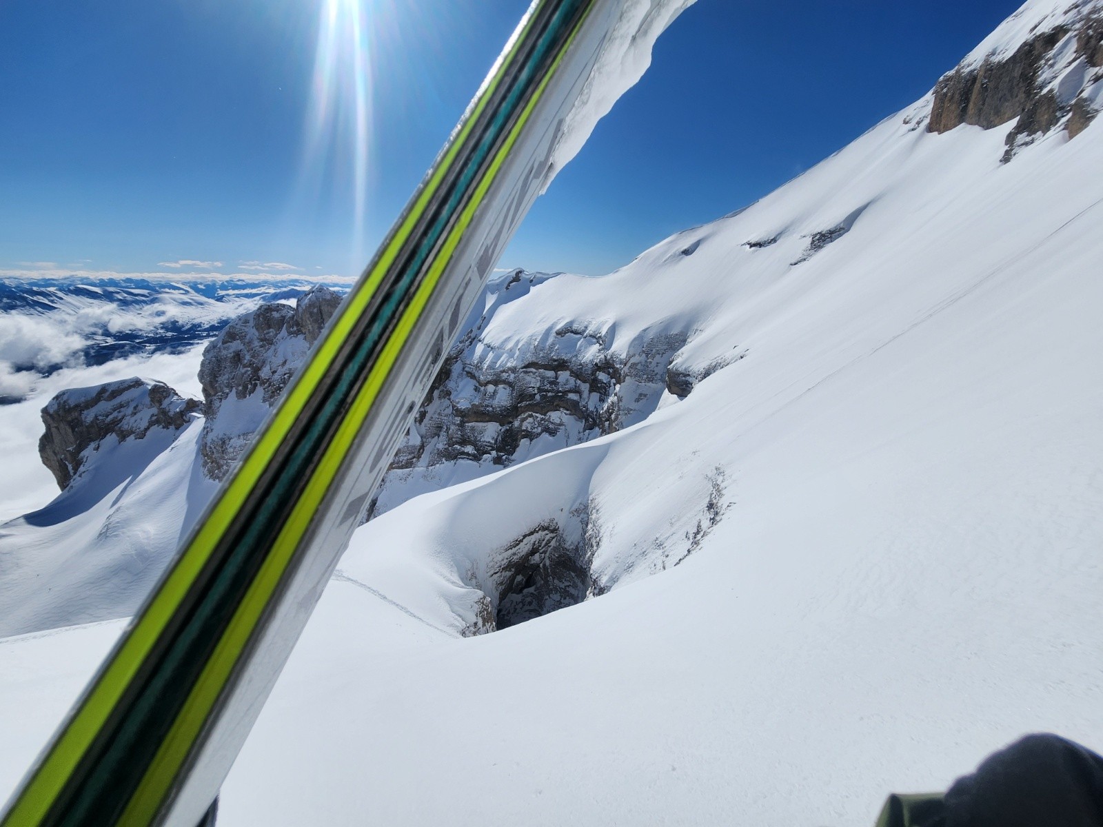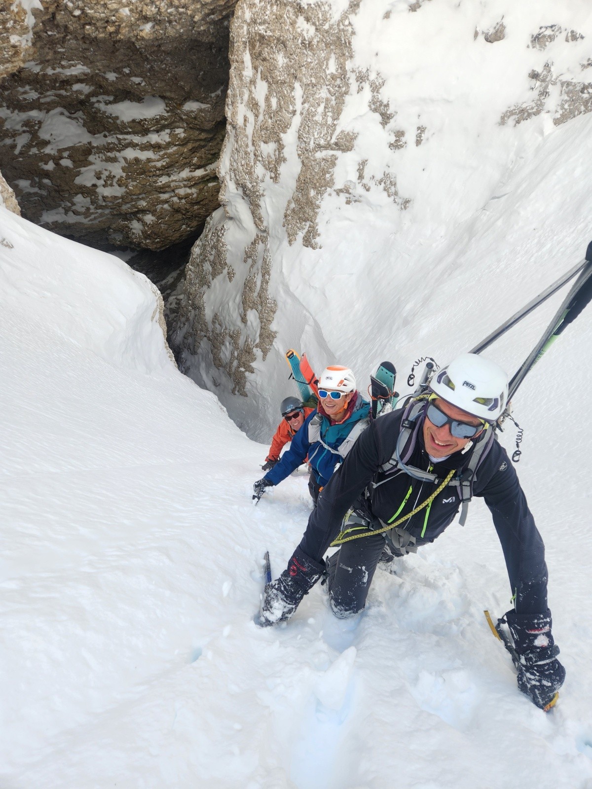 Conditions pour le ski : poudre dense, s'alourdissant beaucoup au fil des heures. Entre les 2 choroums 60- 80 cm de poudre dans les couloirs