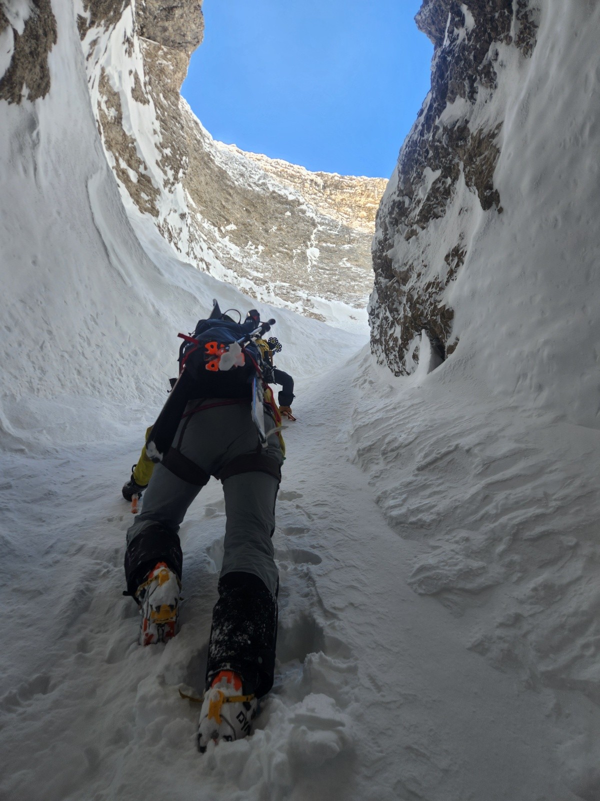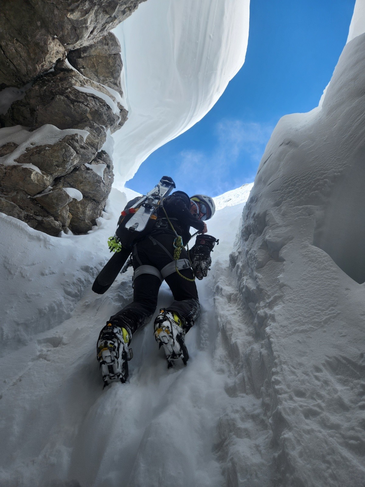 Conditions nivo et activité avalancheuse : il a neigé la veille, le Bera disait 5-10 cm, on s'est retrouvé avec beaucoup plus ( 60-80 cm parfois) d'entre les 2 choroums . On a hésité puis finalement on a envoyé. La glace etait donc présente sur les passages les plus raides mais sous la couche. Du sommet, bien suivre la trace du sentier d'été pour descendre. Corde 30 m utile pour les rappels.