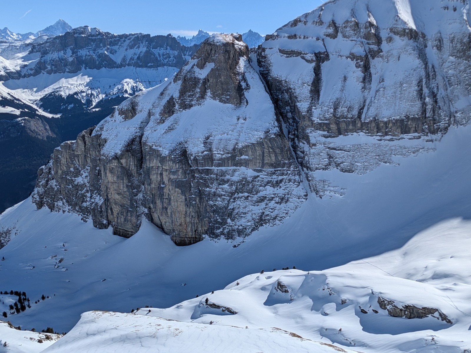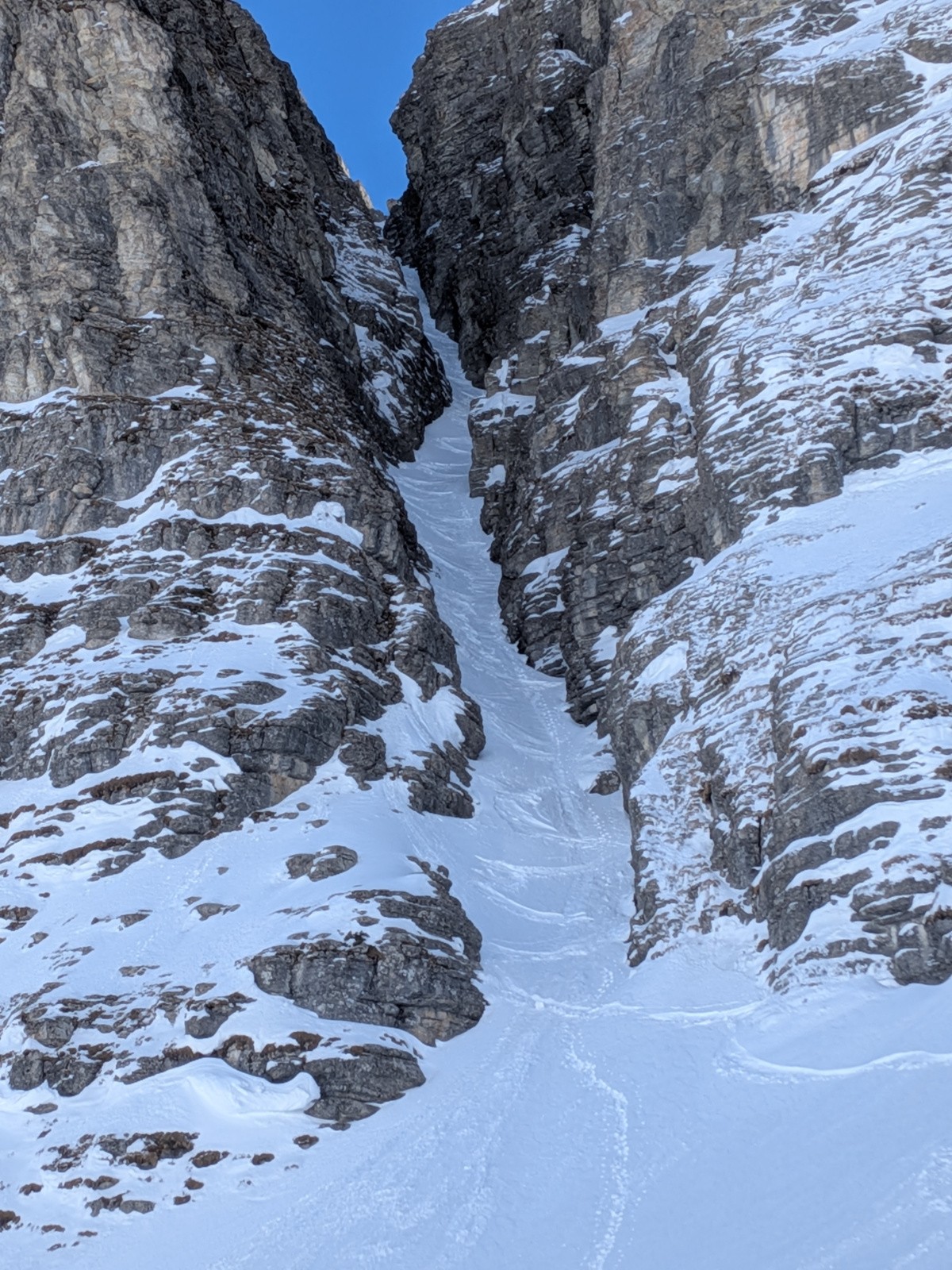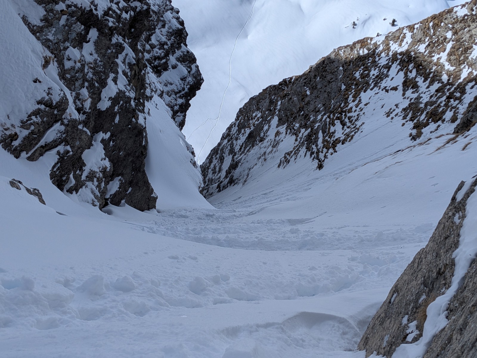 Conditions pour le ski : Couloir bien rempli avec un seul passage avant moi et environ 20 cm de neige tombée la veille pas encore trop lourde, le dessous reste bien dur. Neige transfo hyper lourde en descendant, attention à la sortie en bas du couloir, changement de neige , je me suis pris un bon râteau. Boules de glace en bas de Brion.