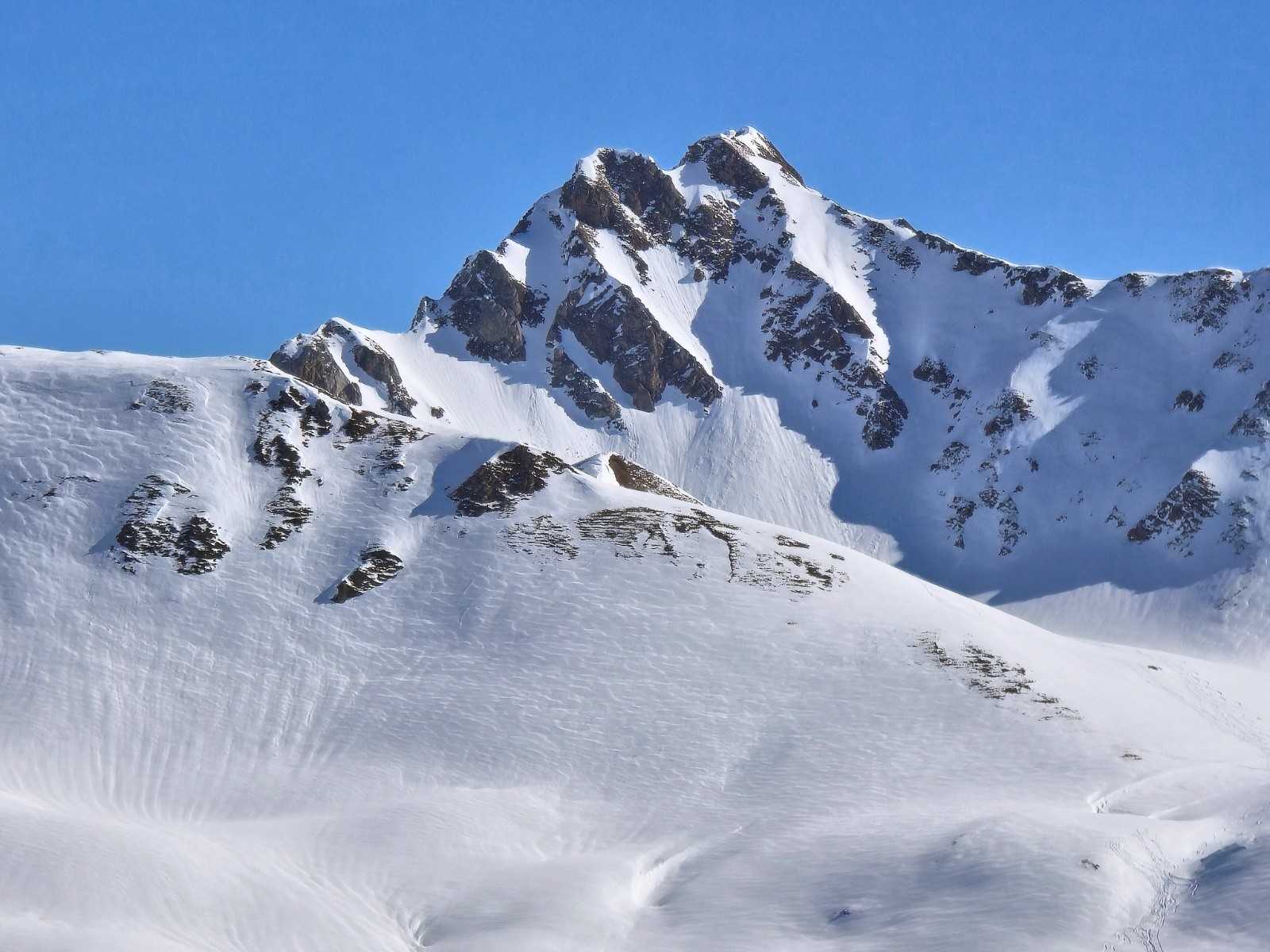 Conditions pour le ski : Une petite dizaine de cm de neige récente a nivelé le manteau neigeux. Cette couche superficielle est partiellement transformée par le soleil de la veille et durcie par le regel de la nuit. La pente sud sous le sommet 2246 m est béton en orientation sud (couteaux nécessaires).. Descente en orientation sud-est autant que possible. La couche superficielle est déjà bien humidifiée. La neige sur les pistes est restée bien ferme.