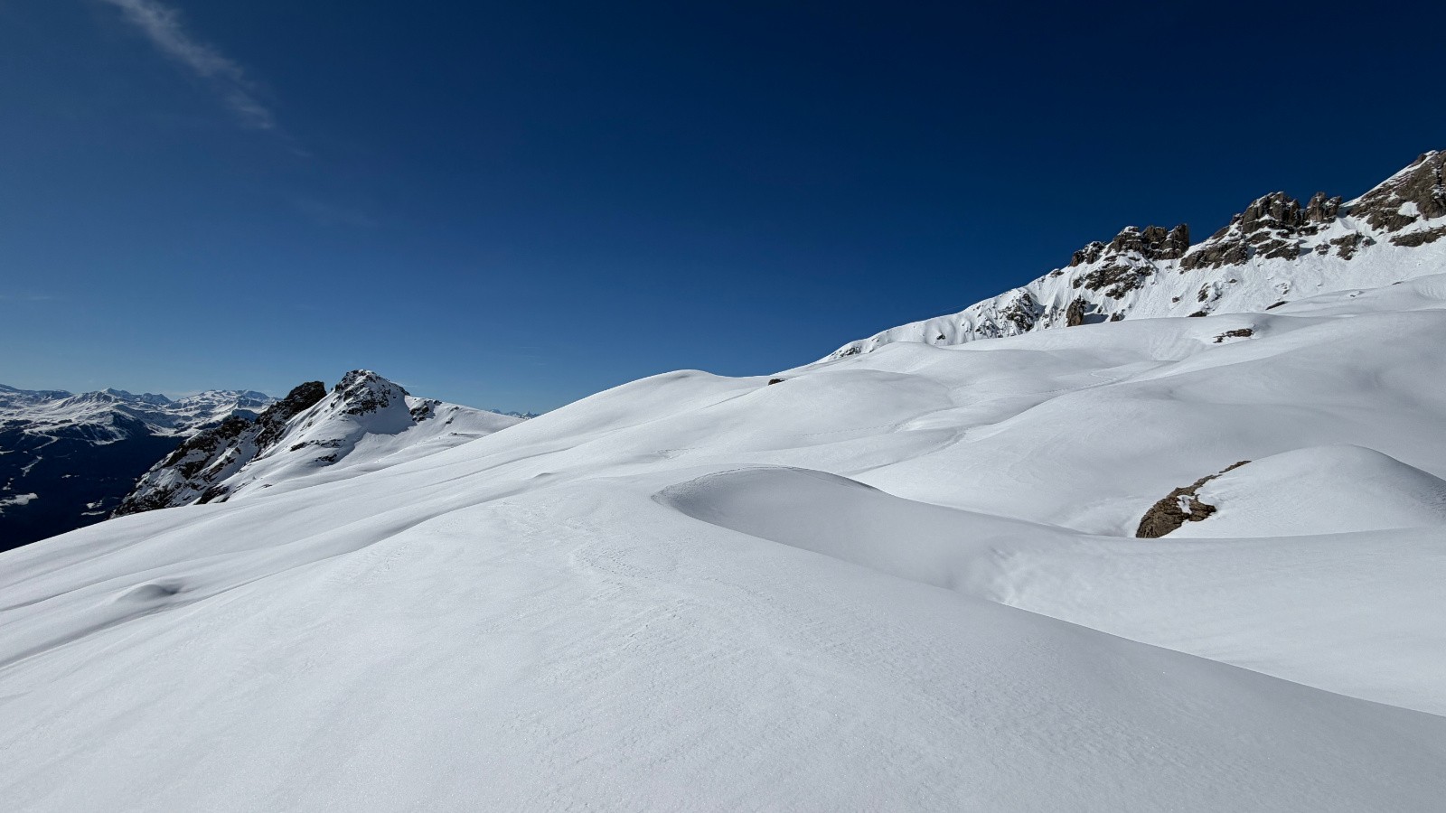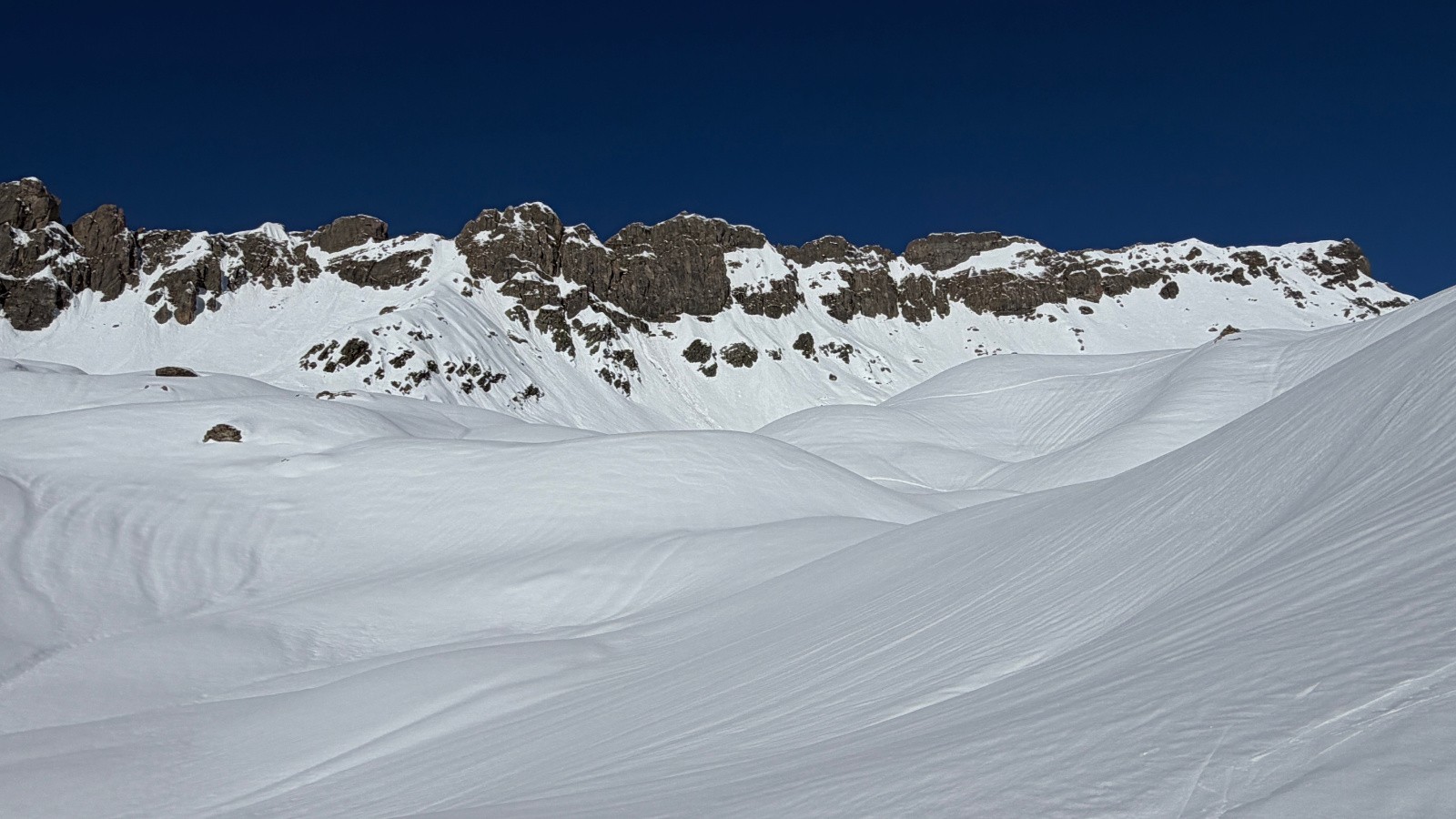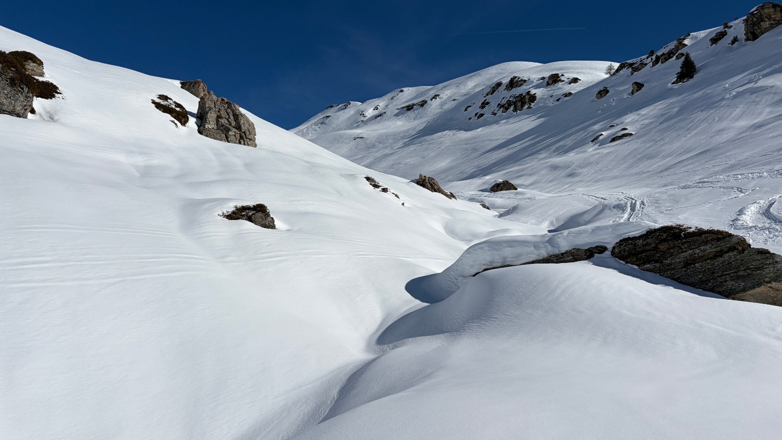 Descente ; la combe NE depuis le col est en poudre, neige légèrement croutée pour rejoindre le refuge de la Balme et pour terminer un vallon de Forand en neige transformée très agréable à skier