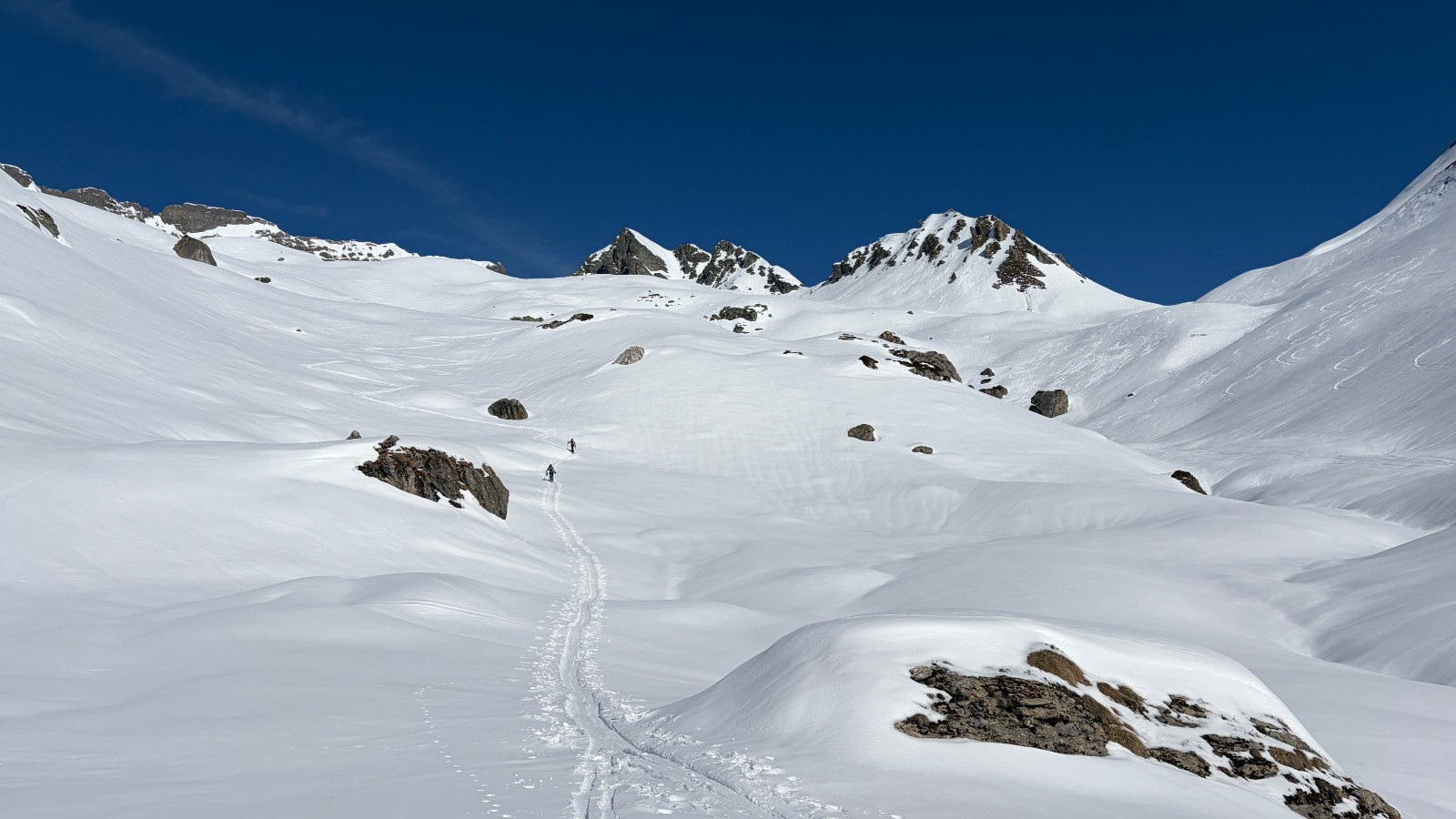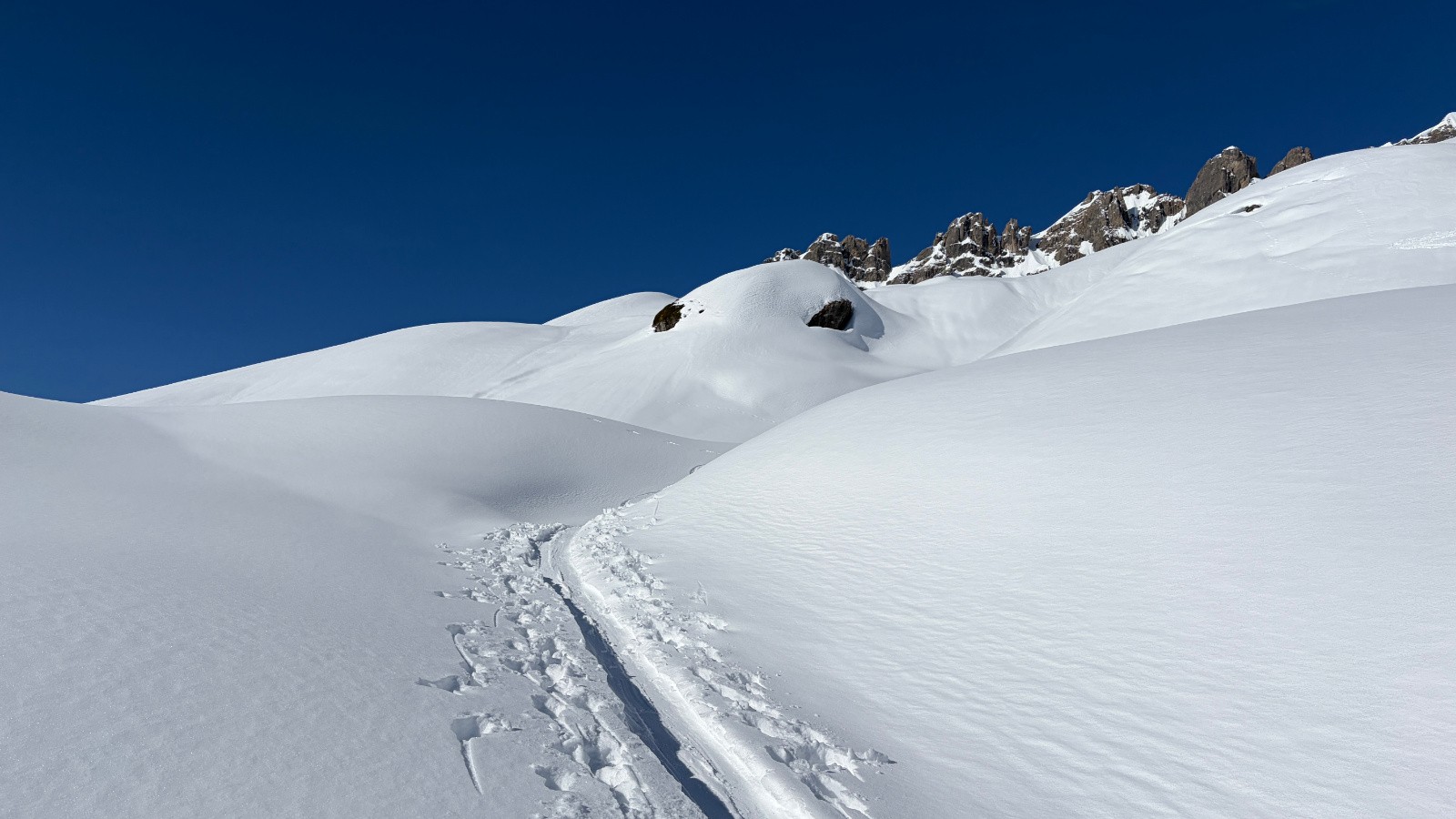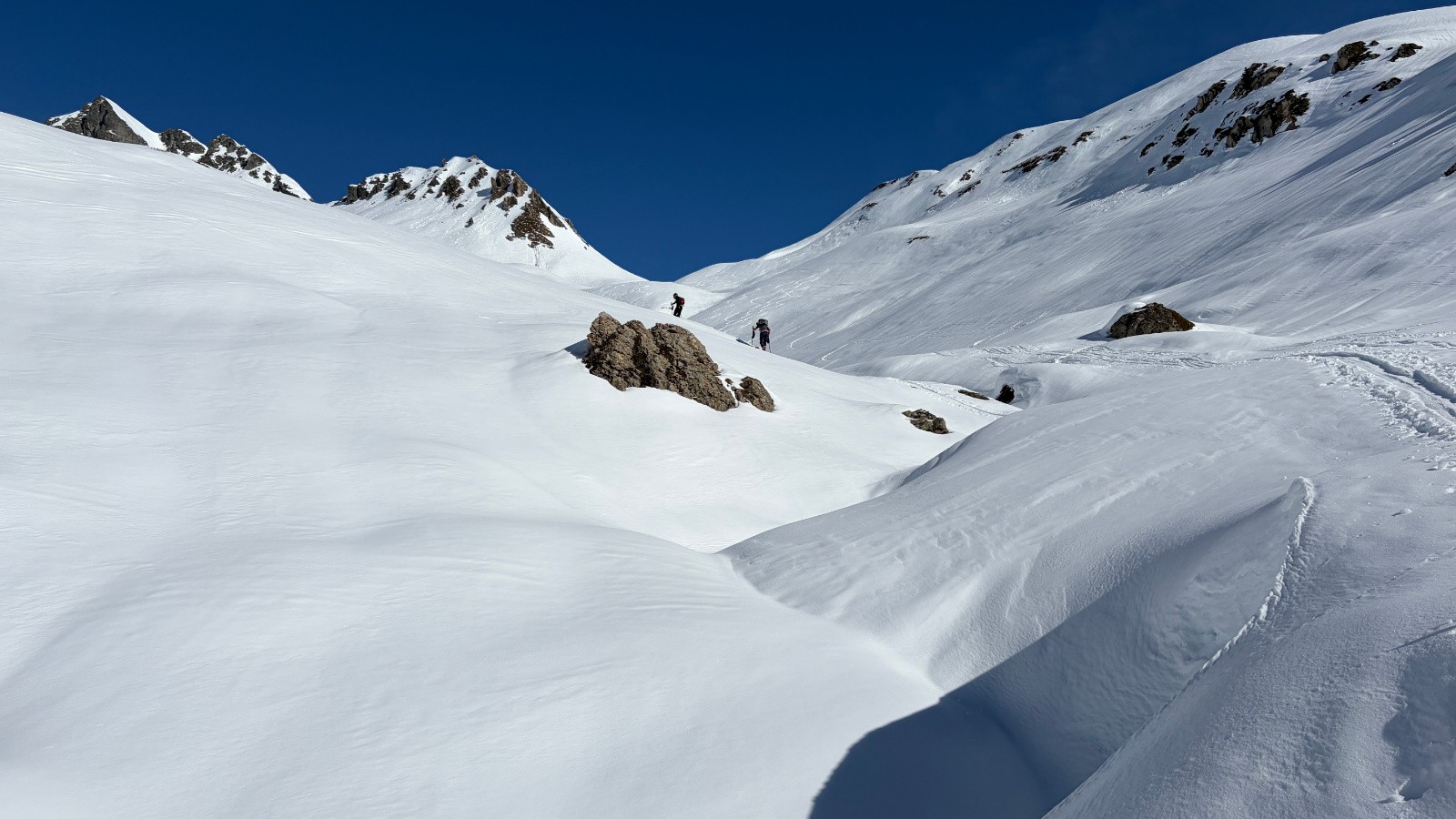 Descente ; la combe NE depuis le col est en poudre, neige légèrement croutée pour rejoindre le refuge de la Balme et pour terminer un vallon de Forand en neige transformée très agréable à skier