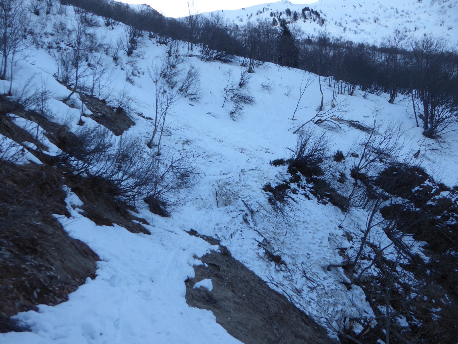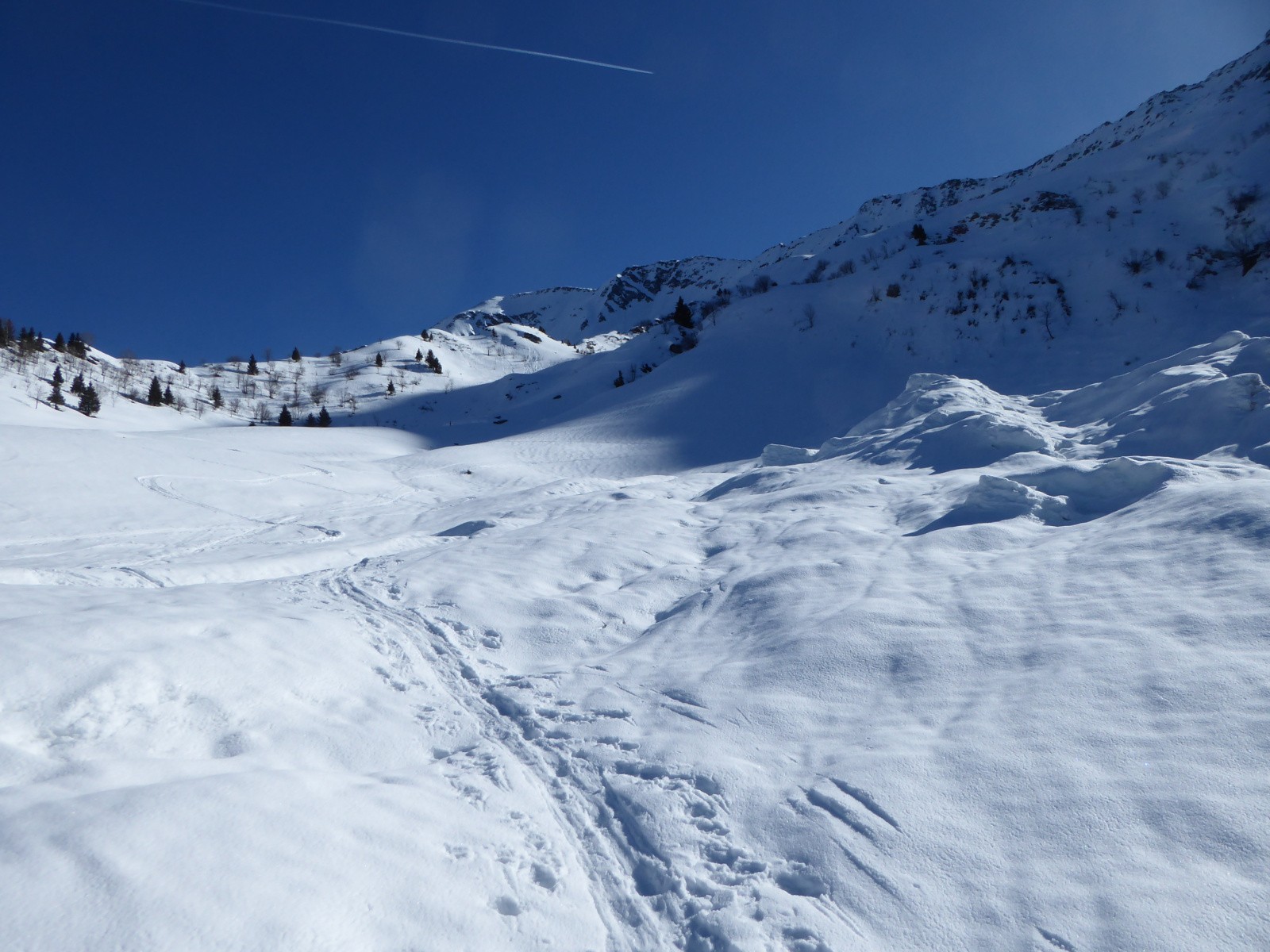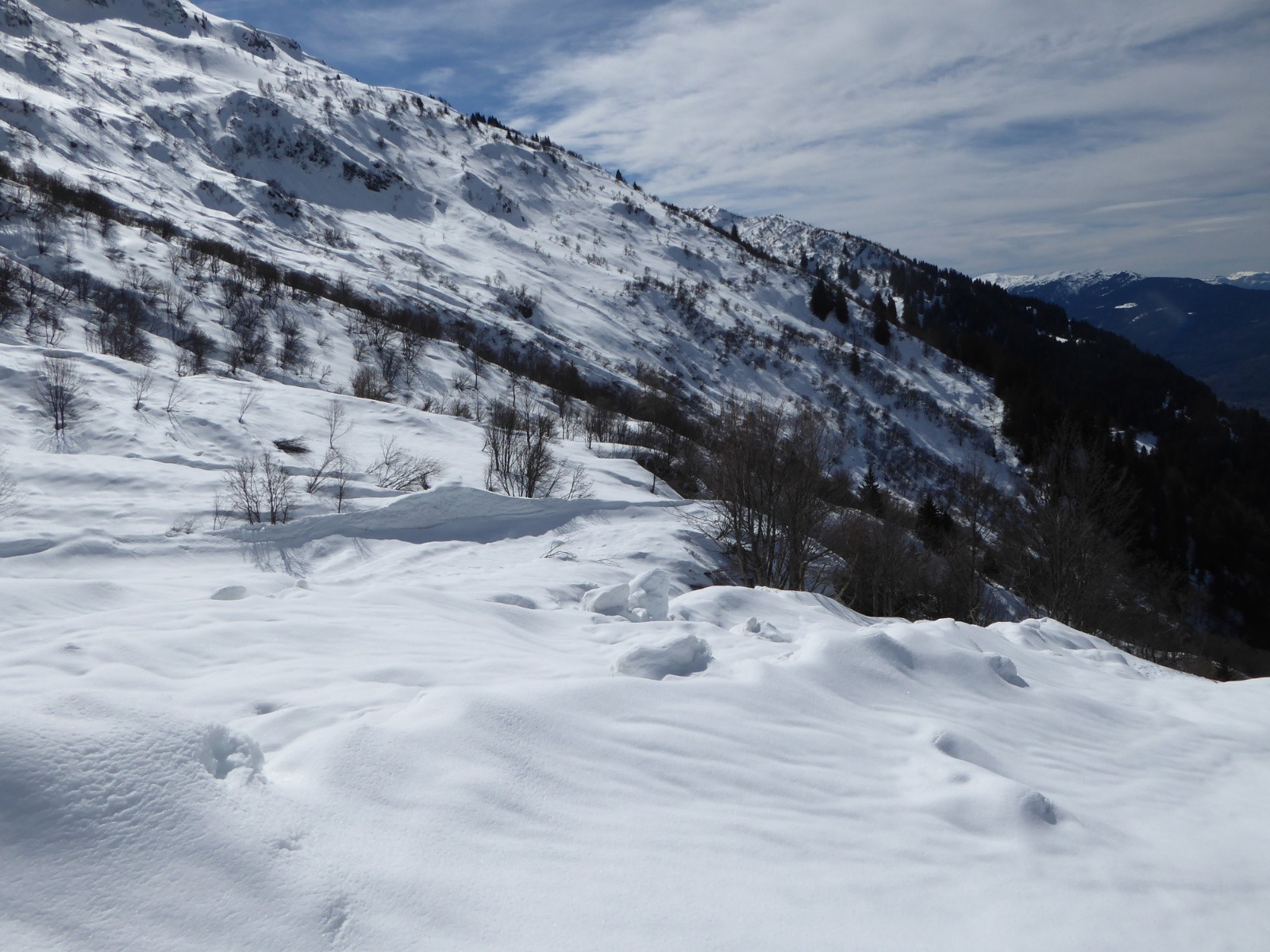 Itinéraire suivi : Départ en VTTAE depuis le Mollard jusqu'à Tioulévé, ski de rando par le pont des Rouelles et traversée de la grosse avalanche, Chalet de la Perrière et des Marmottes Noires, lac au pied du pas de la Mule 2150m, descente assez pénible jusqu'à 1800m sur une neige croutée ou poudre très dense et profonde**, ensuite neige décaillée*** à **** plus bas, descente début de la forêt assez délicat, faible enneigement, celà ne durera pas longtemps, le chemin entre le pont des Rouelles et Tioulévé sera déneigé d'ici une semaine ou deux.