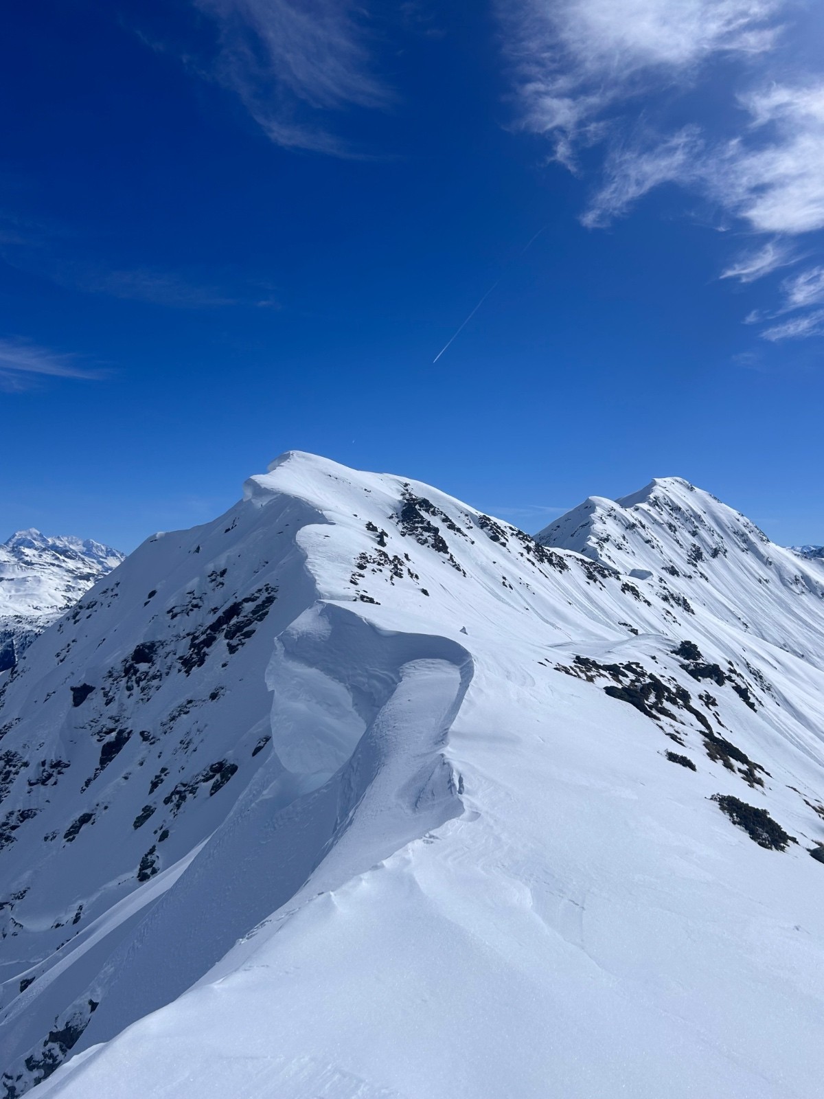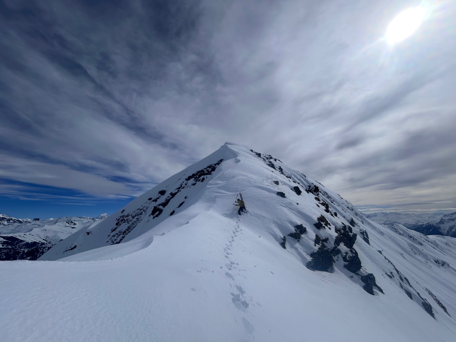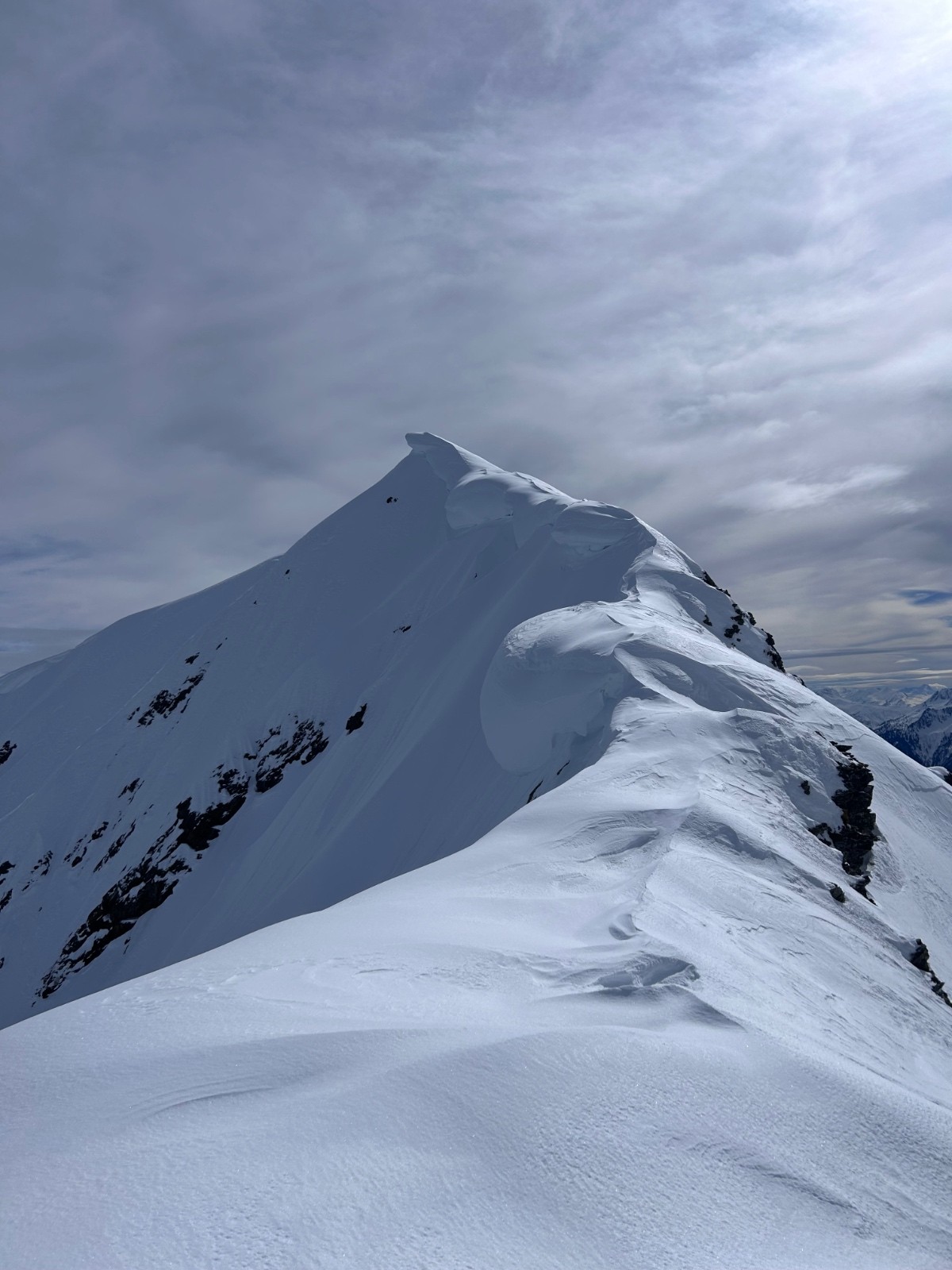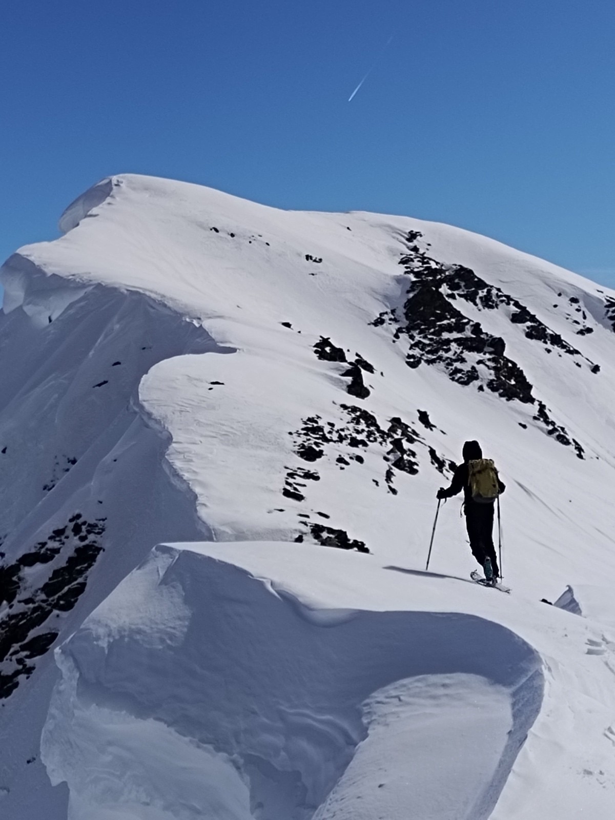 Belle journée partagée avec mon père sans jamais croiser une seule personne. Une bonne et belle mission puisqu’en plus d’être longue, il a fallu tout tracer à partir du sommet de côte 2000 jusqu’au col de la bathie, y compris les différentes arêtes parcourues (celle du Mirantin / du pic de vache rouge / de la grande journée). Gros brassage notamment dans le couloir pour accéder à l’arête de la grande journée et sur l’arête de la GJ. Un gros 60cm en moyenne voir + par endroit et la tête dans la neige par moment (elle est froide). La corniche a été délicate à franchir sans piolet, mais jai pu bénéficier de l’aide du saint esprit (mon père sous moi qui me poussait 😂) et moi qui lui tendait mes mains une fois en haut.