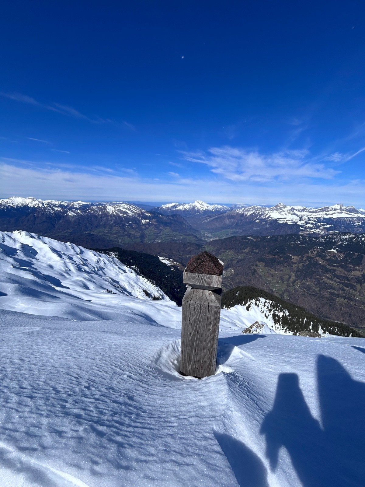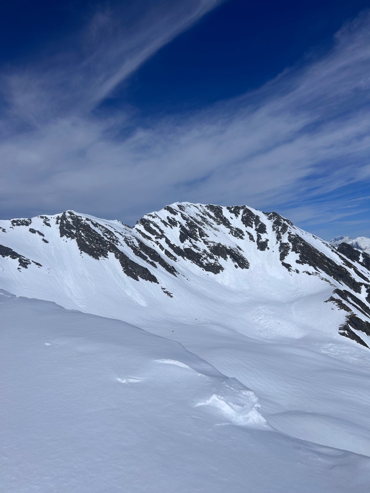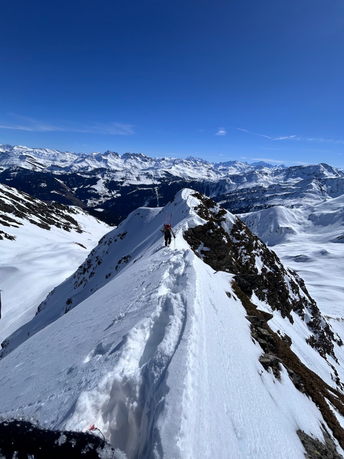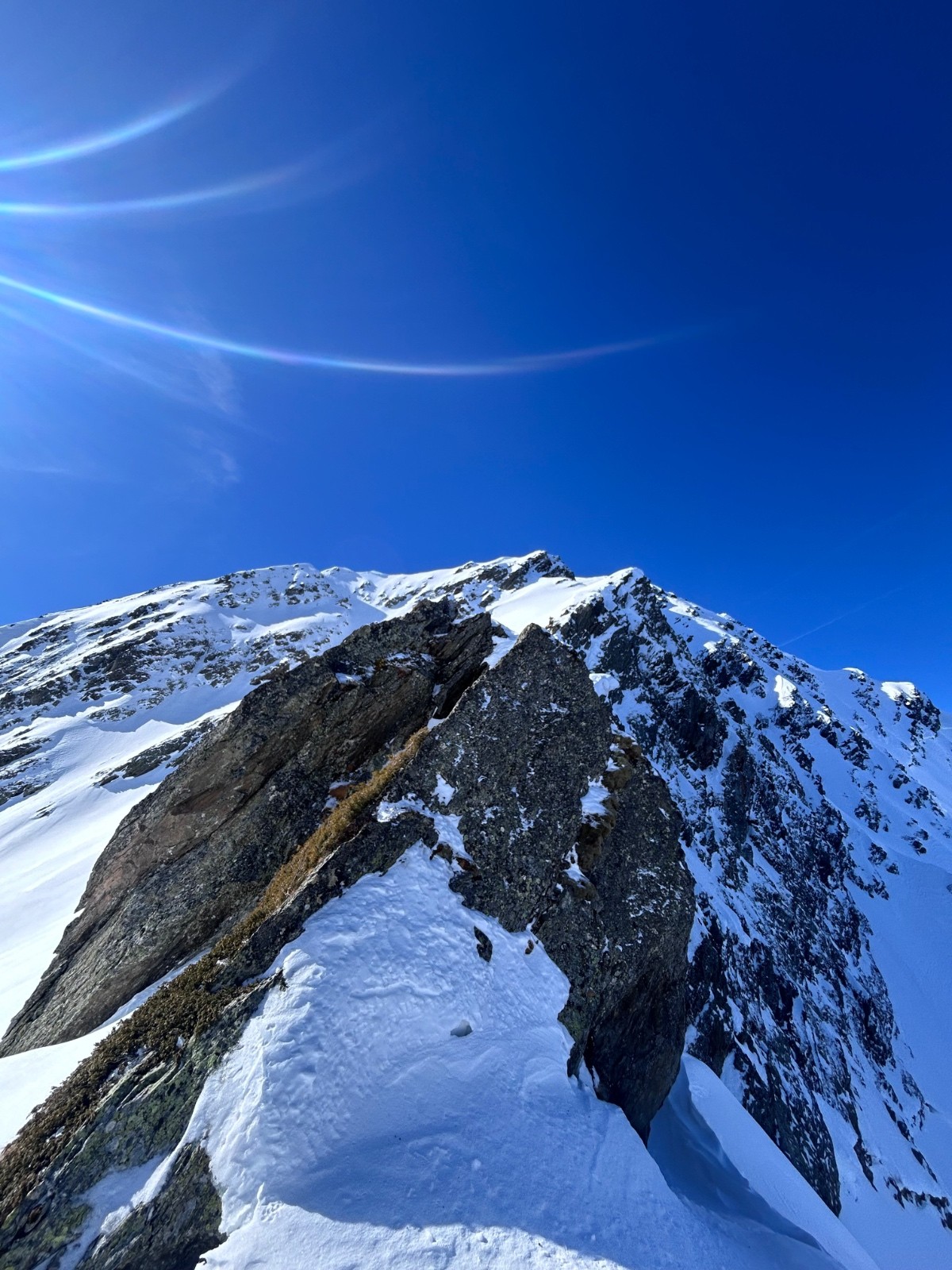Belle journée partagée avec mon père sans jamais croiser une seule personne. Une bonne et belle mission puisqu’en plus d’être longue, il a fallu tout tracer à partir du sommet de côte 2000 jusqu’au col de la bathie, y compris les différentes arêtes parcourues (celle du Mirantin / du pic de vache rouge / de la grande journée). Gros brassage notamment dans le couloir pour accéder à l’arête de la grande journée et sur l’arête de la GJ. Un gros 60cm en moyenne voir + par endroit et la tête dans la neige par moment (elle est froide). La corniche a été délicate à franchir sans piolet, mais jai pu bénéficier de l’aide du saint esprit (mon père sous moi qui me poussait 😂) et moi qui lui tendait mes mains une fois en haut.