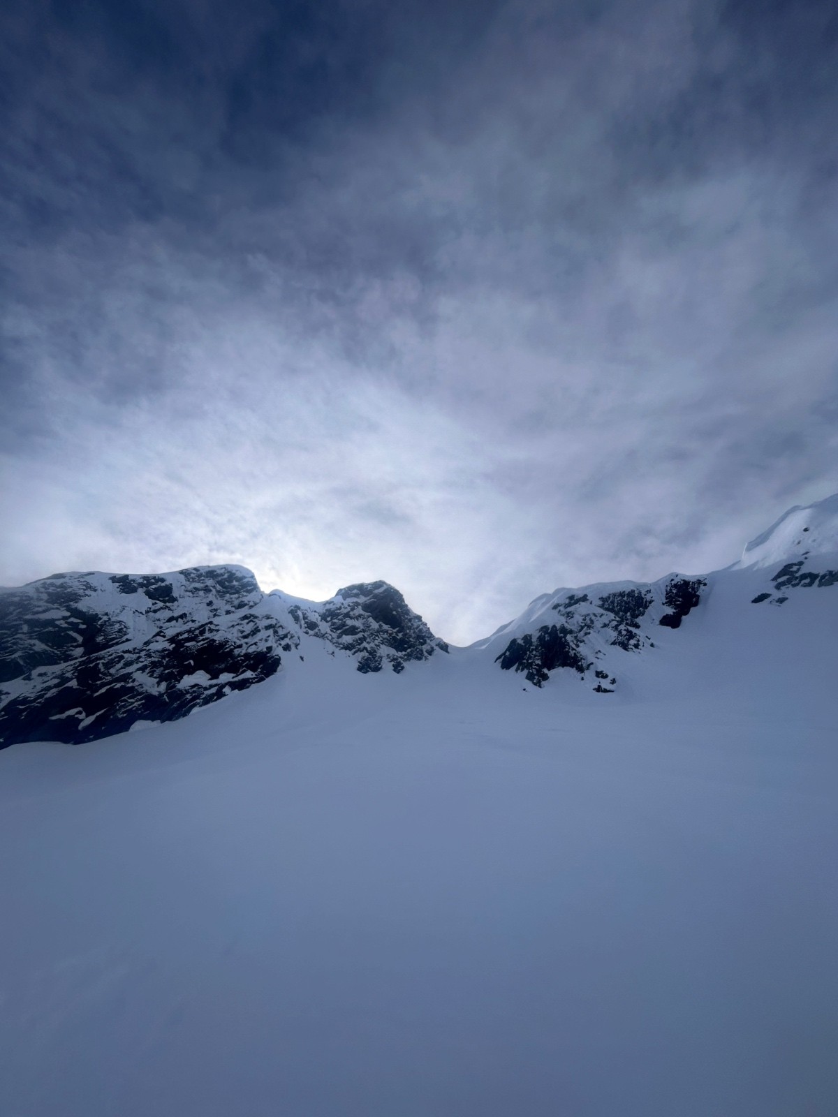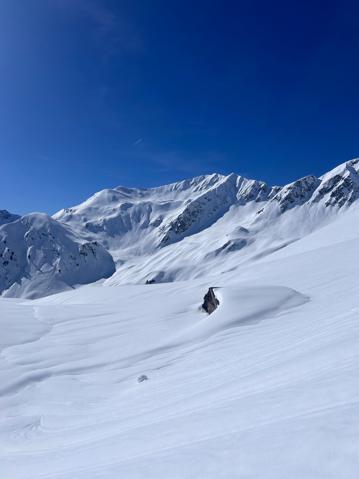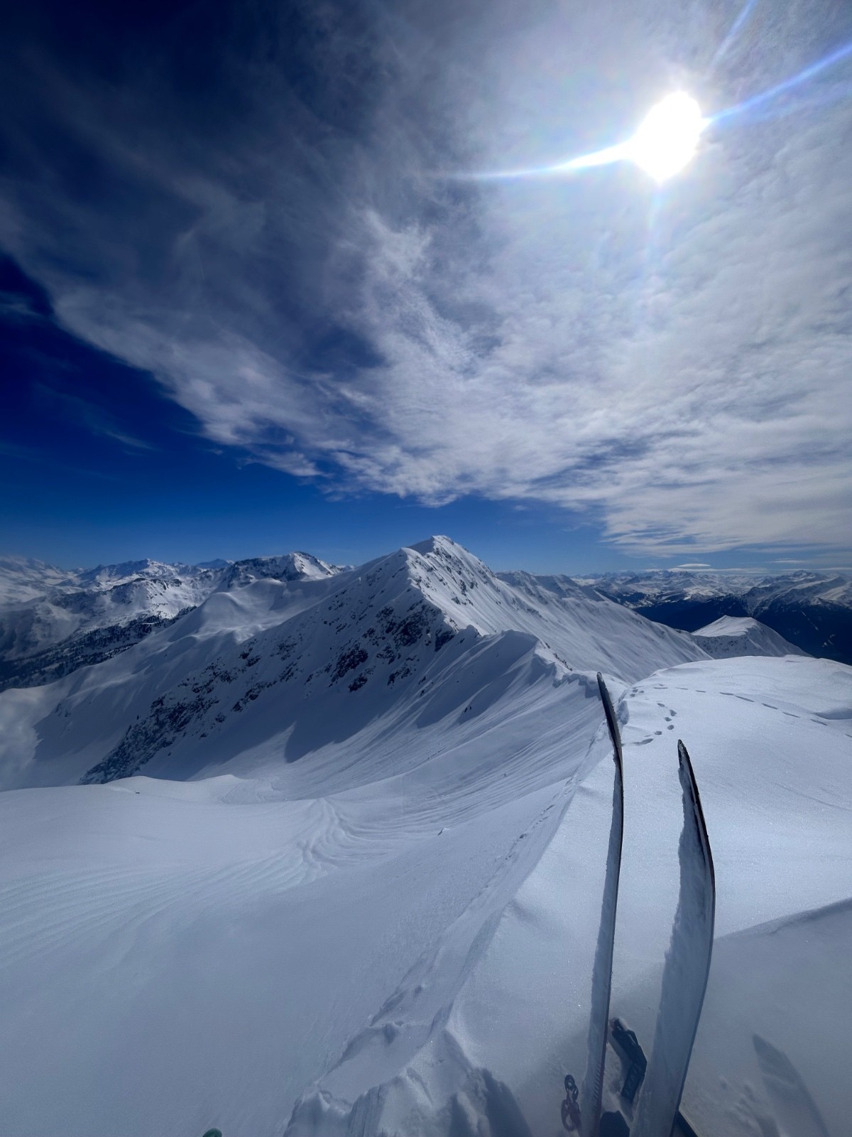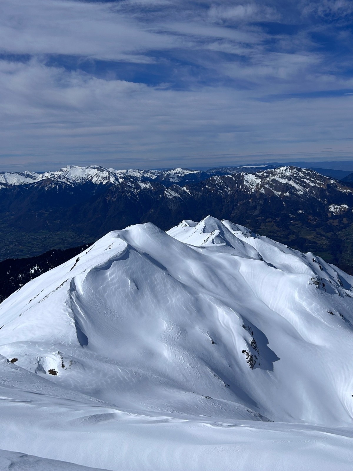 Belle journée partagée avec mon père sans jamais croiser une seule personne. Une bonne et belle mission puisqu’en plus d’être longue, il a fallu tout tracer à partir du sommet de côte 2000 jusqu’au col de la bathie, y compris les différentes arêtes parcourues (celle du Mirantin / du pic de vache rouge / de la grande journée). Gros brassage notamment dans le couloir pour accéder à l’arête de la grande journée et sur l’arête de la GJ. Un gros 60cm en moyenne voir + par endroit et la tête dans la neige par moment (elle est froide). La corniche a été délicate à franchir sans piolet, mais jai pu bénéficier de l’aide du saint esprit (mon père sous moi qui me poussait 😂) et moi qui lui tendait mes mains une fois en haut.
