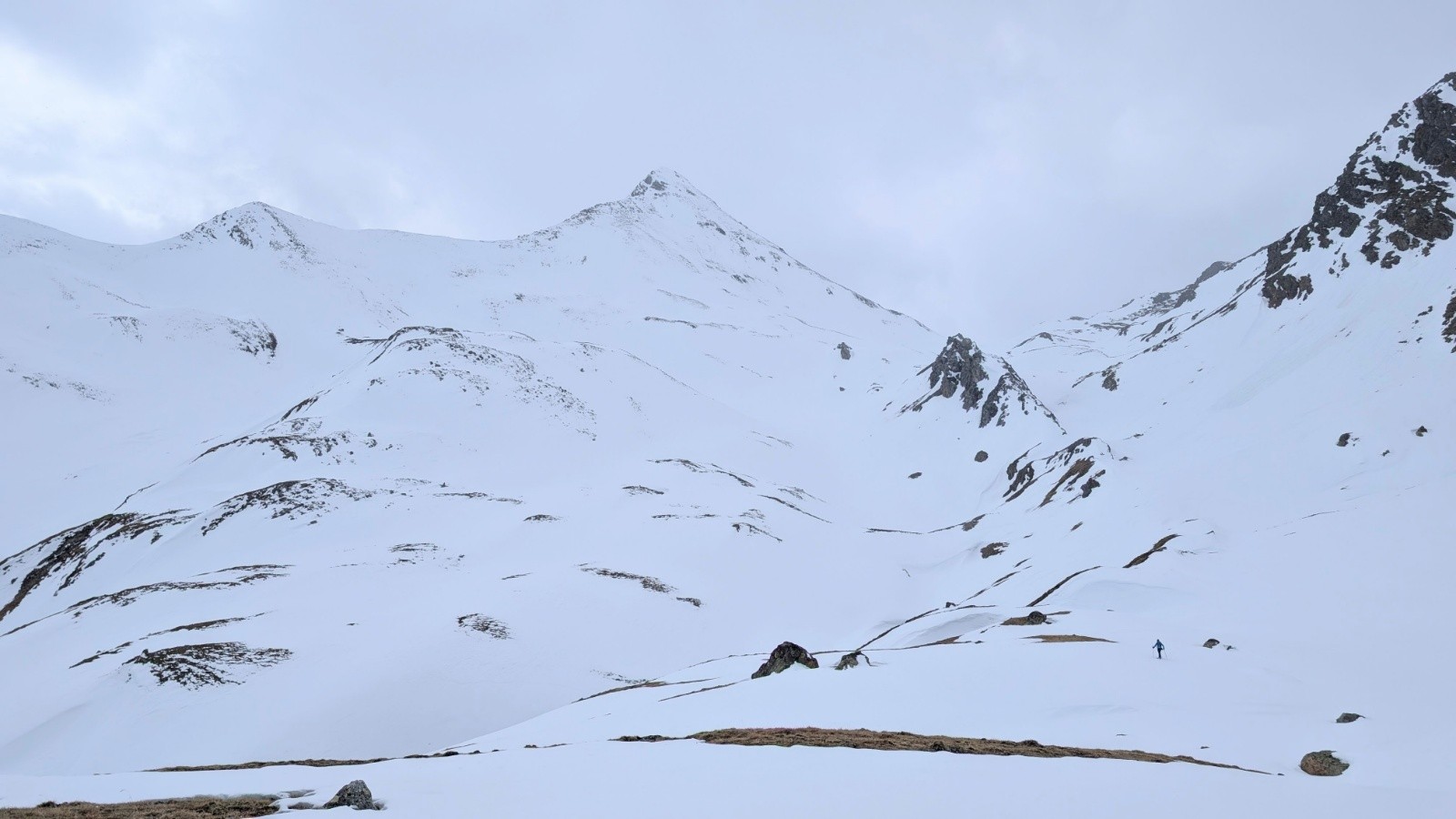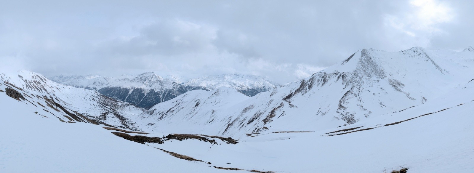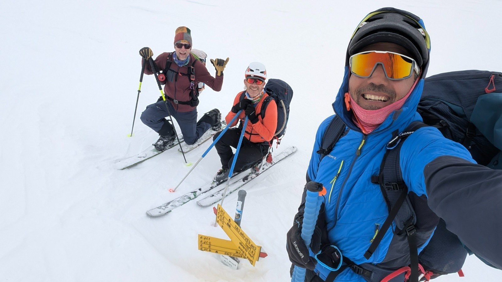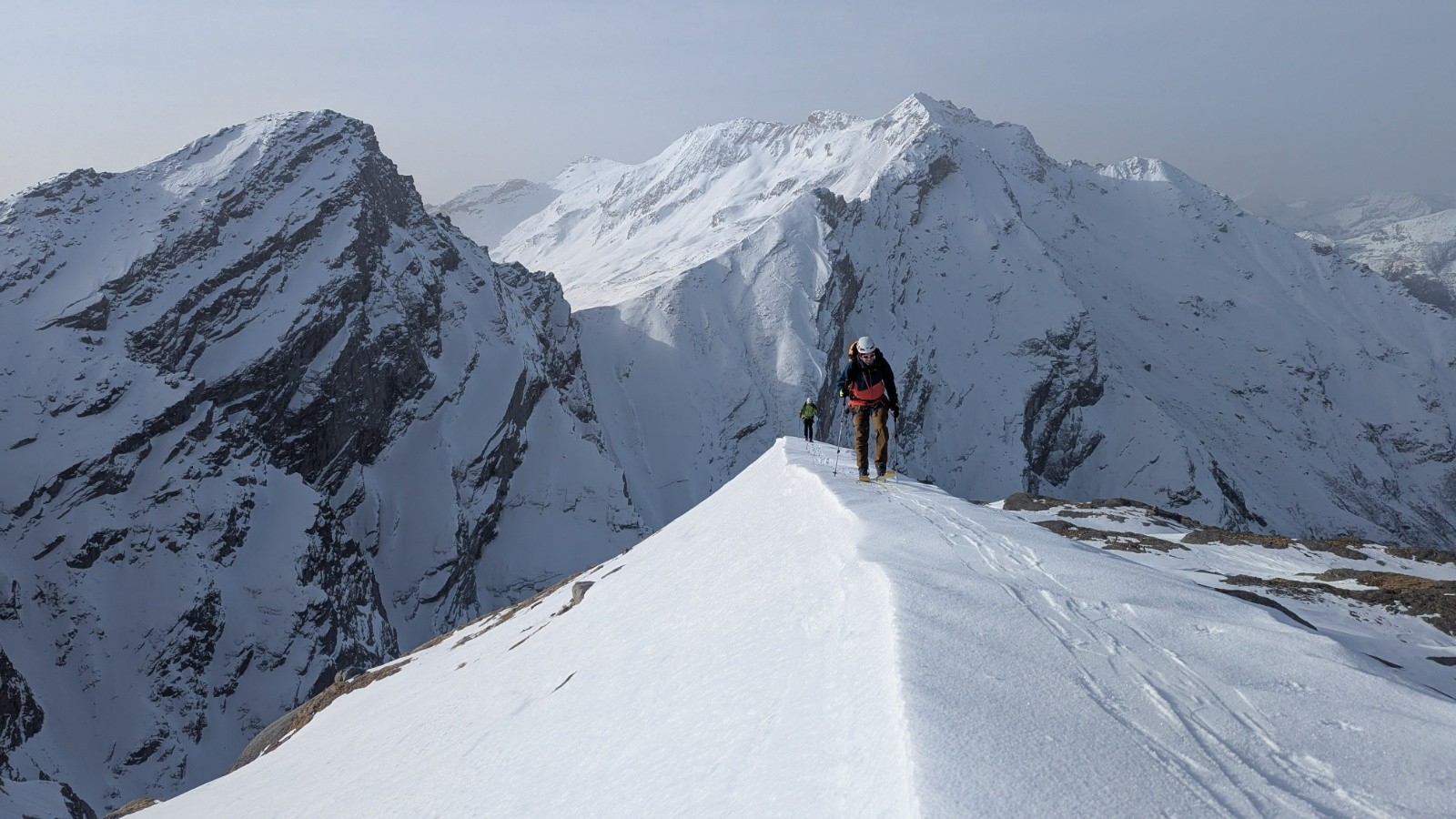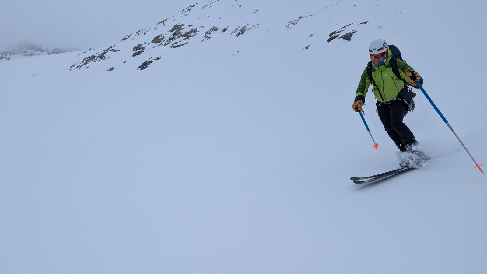- On a tout eu côté neige et météo avec quelques jours blancs total à naviguer à la canne quelques dizaines de centimètre, la visibilité jaunâtre du vent de Sud polaire sous le sable du Sahara et bien sûr une super fenêtre de soleil globalement. Côté enneigement c'est très correct mais hétérogène avec du bon gavage en face Nord à la gymnastique du marcassin entre les rhododendrons, la moquette très profonde et les plaques d'herbe sur les versants Sud.