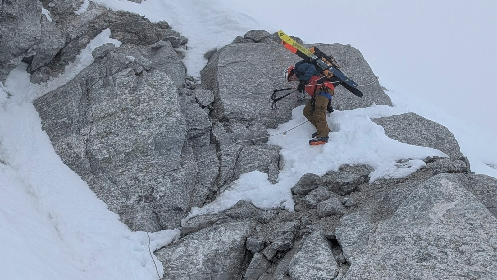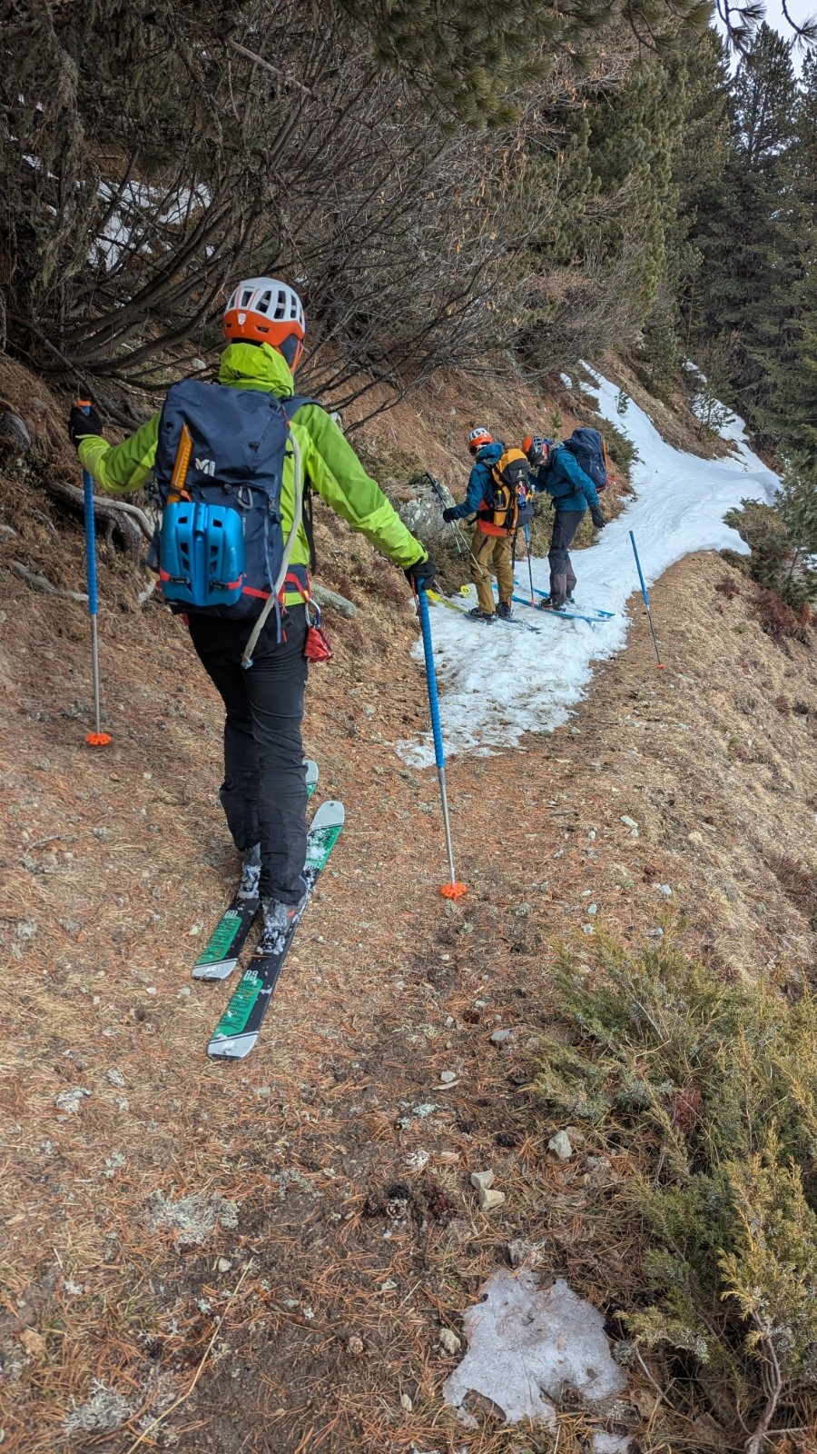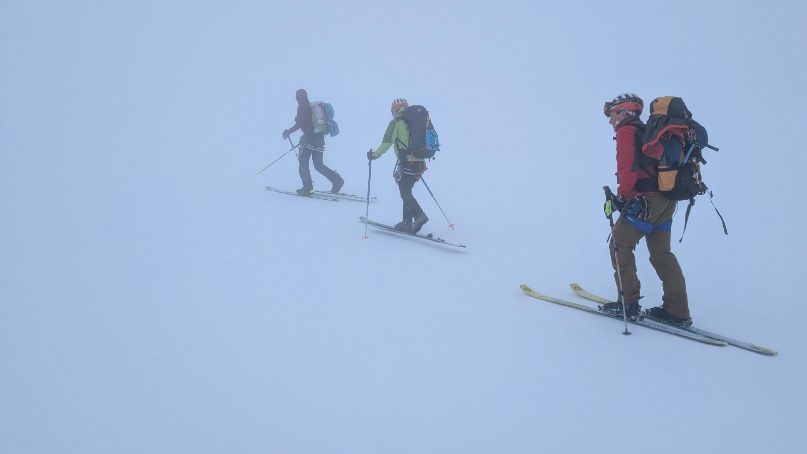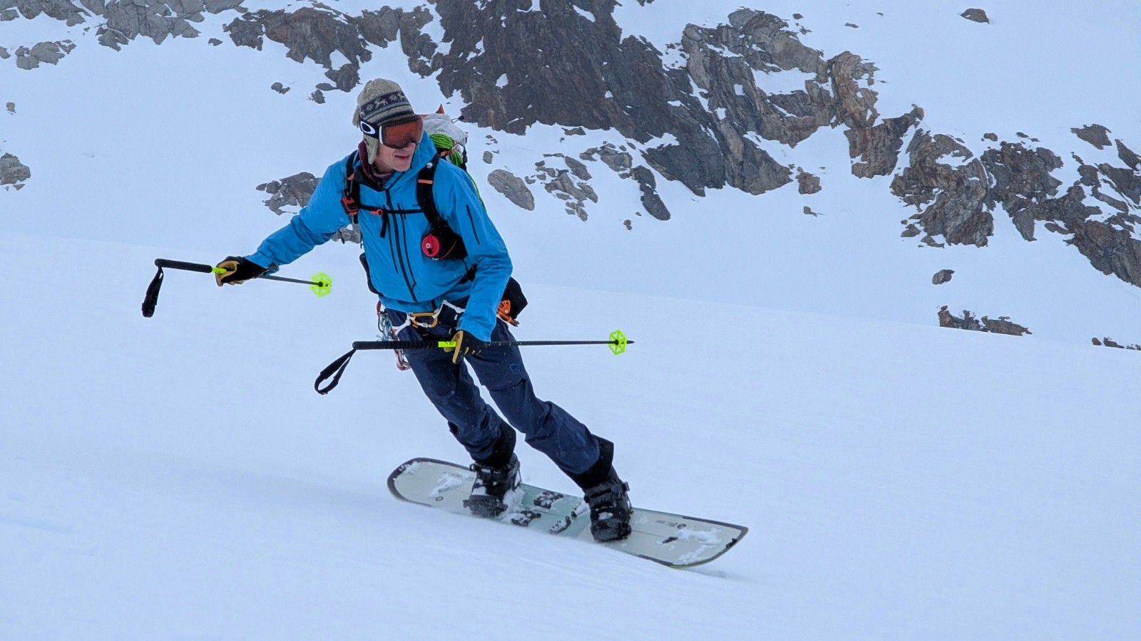 - On a tout eu côté neige et météo avec quelques jours blancs total à naviguer à la canne quelques dizaines de centimètre, la visibilité jaunâtre du vent de Sud polaire sous le sable du Sahara et bien sûr une super fenêtre de soleil globalement. Côté enneigement c'est très correct mais hétérogène avec du bon gavage en face Nord à la gymnastique du marcassin entre les rhododendrons, la moquette très profonde et les plaques d'herbe sur les versants Sud.