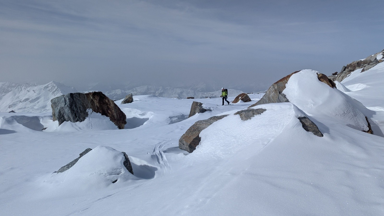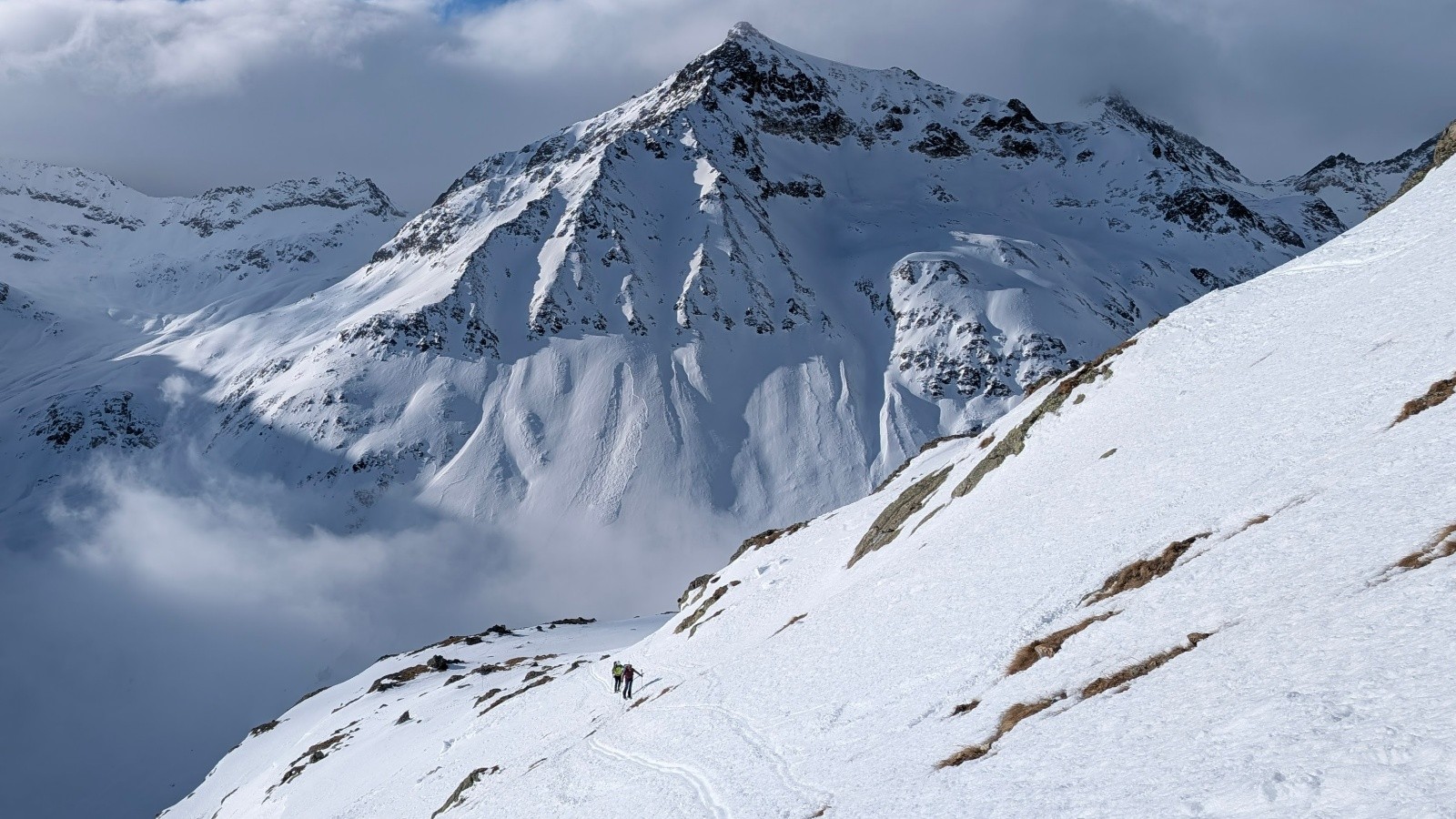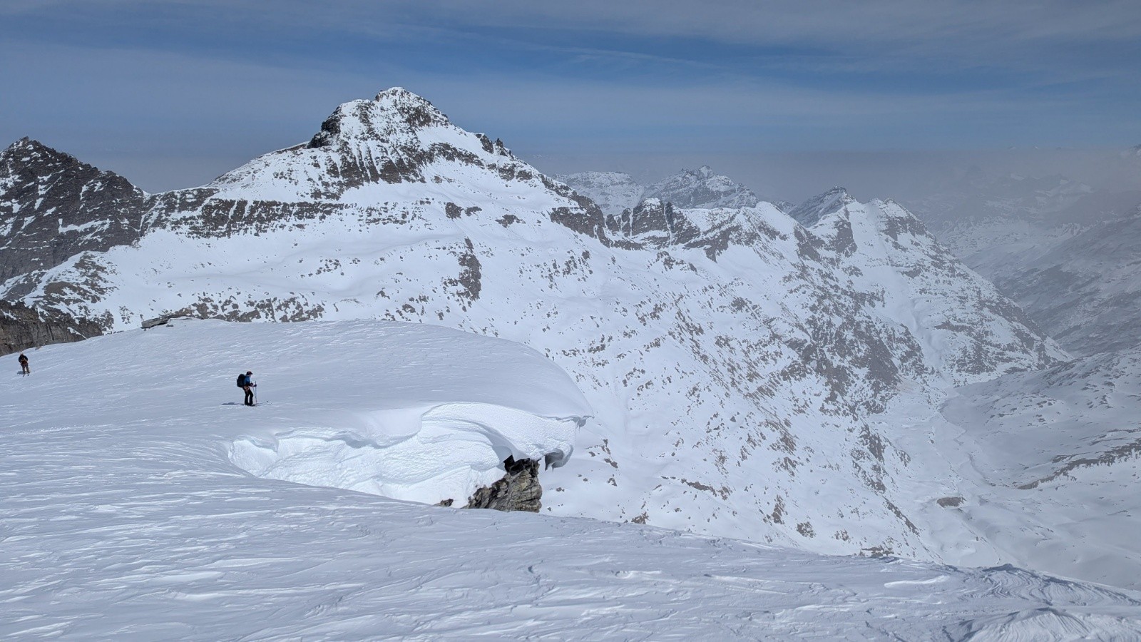 Côté avalanche, risque 2, pas mal de gros écoulements et plaques déjà en bas après les fortes chutes de février, mais rien de rédhibitoire, à part un doute et de la distance prise au Rheinwaldhorn.