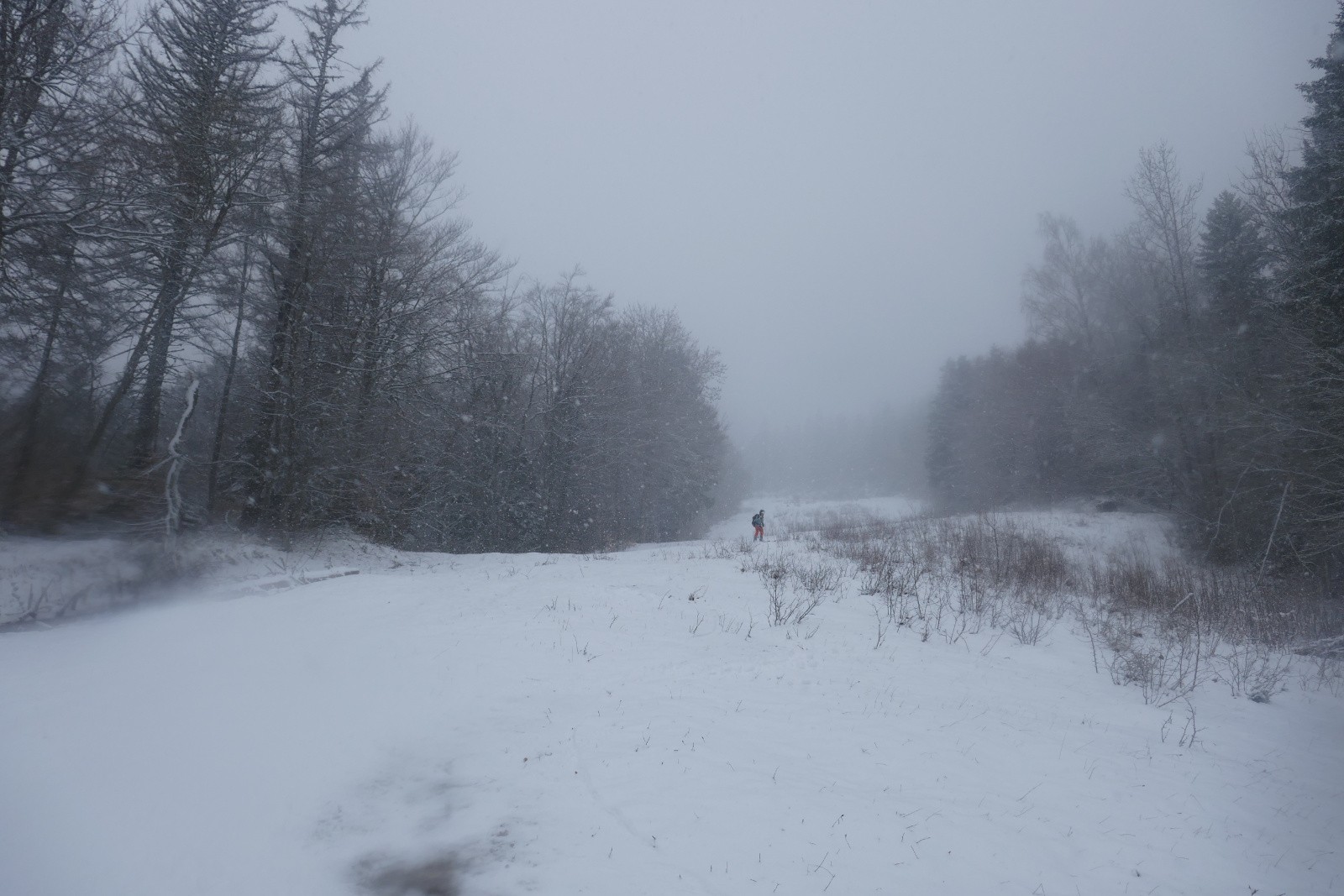 Petite sortie matinale pour voir ce que donne la perturbation du jour. A 9h, nous trouvons la limite pluie/neige vers 950m. A peine 2cm au col, ça commence bien. Un gros névé sur le bas de la piste nous laisse l'espoir d'un chaussage quasi à la voiture. Que nenni ! Rapidement, les skis seront portés. Bon pour 100m de D+ où on retrouve enfin un enneigement à peu près continu. La neige tombante est très humide et on se retrouve rapidement trempés ! L'épaisseur laisse à désirer pendant longtemps et on sent les cailloux quasiment jusqu'au col à 1450m. Au-dessus, l'ambiance change, la neige a résisté et tout est très blanc. Au sol, nous dépassons enfin les 10cm de nouvelle neige, forêt comprise. Il neige toujours fortement et ça cumule bien. Quelques accus partent en placounettes sous le l'Aulp (rien de conséquent). Nous parvenons à la croix en 1h50. Petite discussion rapide et un constat commun, nous sommes complètement trempés ! La motivation baisse d'un cran et il neige toujours fort. On avise un repli stratégique devant l'état de nos vêtements. Le haut du couloir a été lustré par une coulée et les 15/20cm ne suffisent pas à rendre le ski agréable; Une fois passé l'étroiture, ça va un peu mieux et on peut skier les contre-pentes presque agréables avec la nouvelle neige.