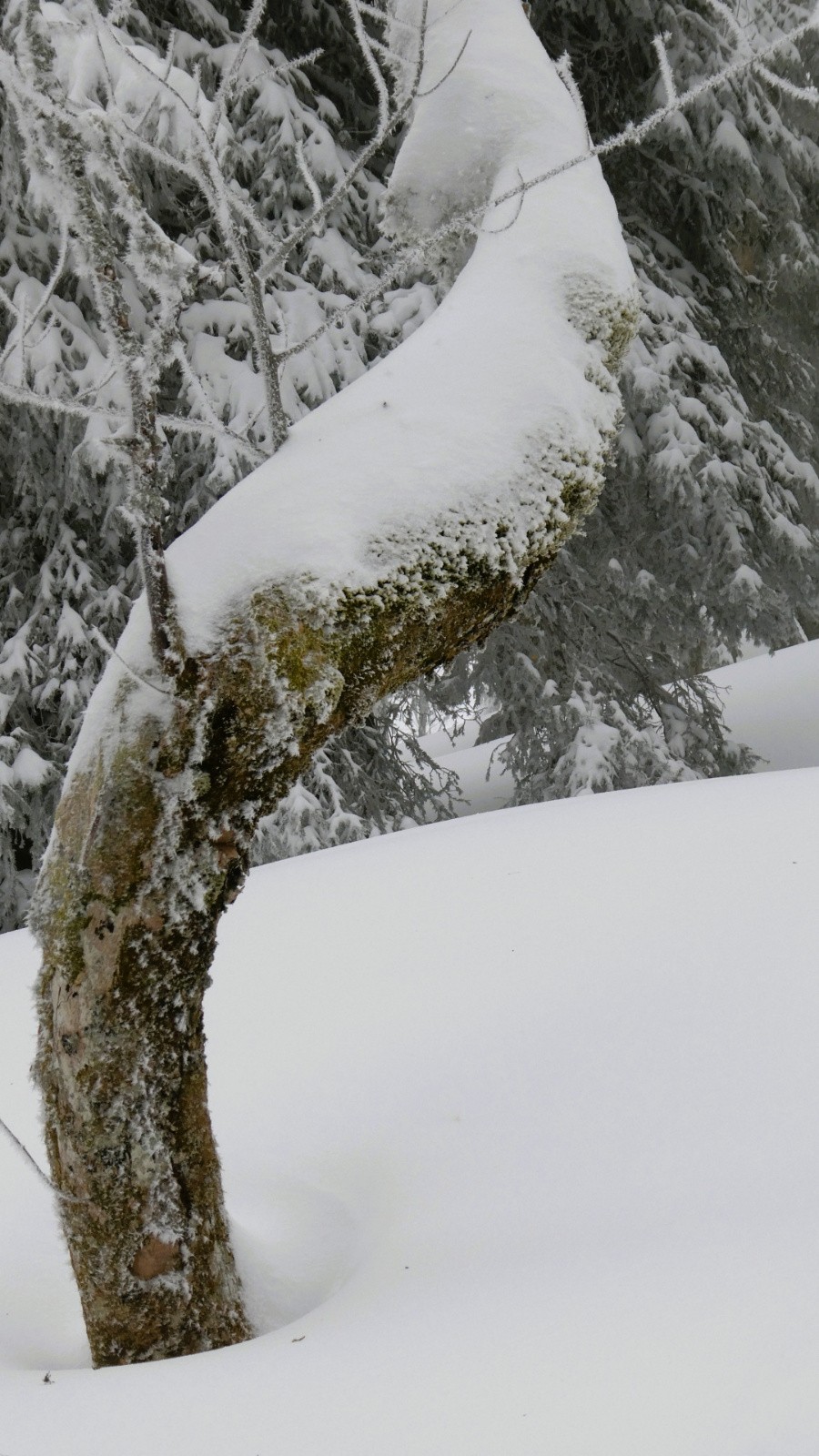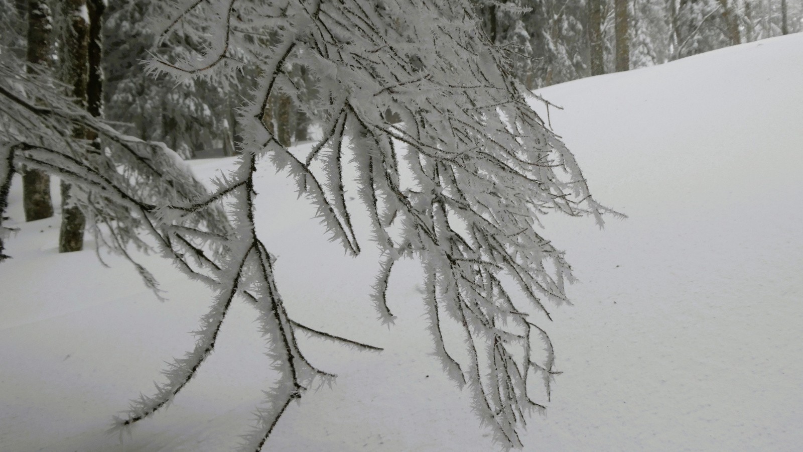 Me suis félicitée d’être partie de relative bonne heure. Peut-être que les suivants auront bénéficié d’une lueur solaire et d’espoir, mais pour moi et quelques autres persévérants, il n’en a rien été. Cependant, pas de regrets, les traces de la veille n’étaient plus que songe et peu de descentes ont précédé la mienne de sorte que j’ai encore eu quelques jouissifs passages, notamment en forêt. Et pas encore le désagrément de voir ressortir les cailloux sur le chemin de traverse. Tout le monde ne pourra pas en dire autant.