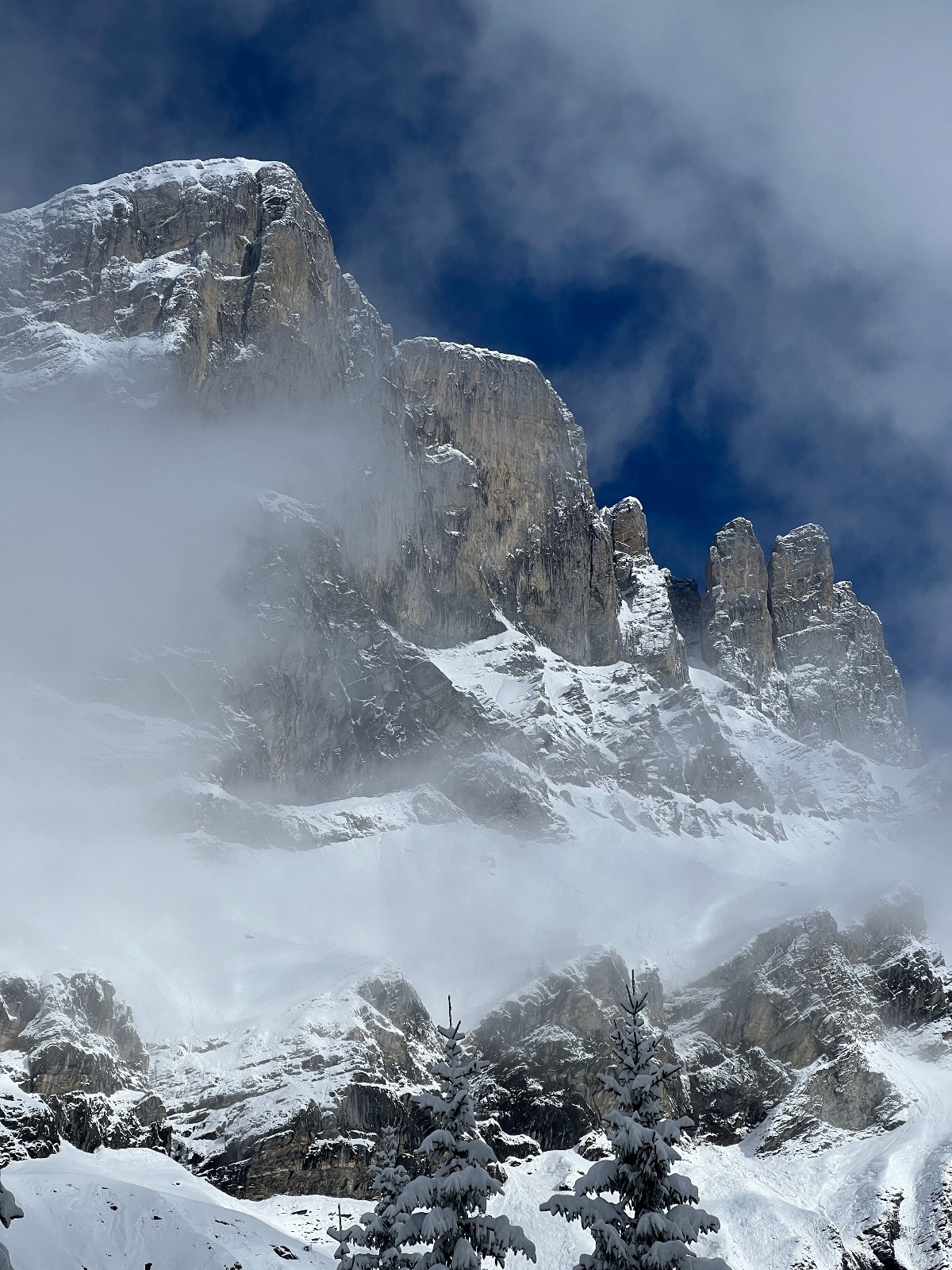 On suit la piste balisé "ski rando" sur le domaine skiable, c'est bucolique entre les sapins. On arrive aux chalets des Ayères avec cette immense barre des Fiz au dessus. 0 trace devant nous, une petite coulée se déclenche, bon ça rassure pas trop, on continue un peu je suis pas rassuré et là une grosse coulée part à environ 200m de nous, ça fait du bruit et ca va vite puis 2 autres un peu plus loin derrière, c'est vraiment pas rassurant pour la suite surtout que tout l'itinéraire passe sous cette barre jusqu'au refuge. Moi ça m'a bien refroidit donc pas envie de continuer, on fait demi tour (200m après les chalets).