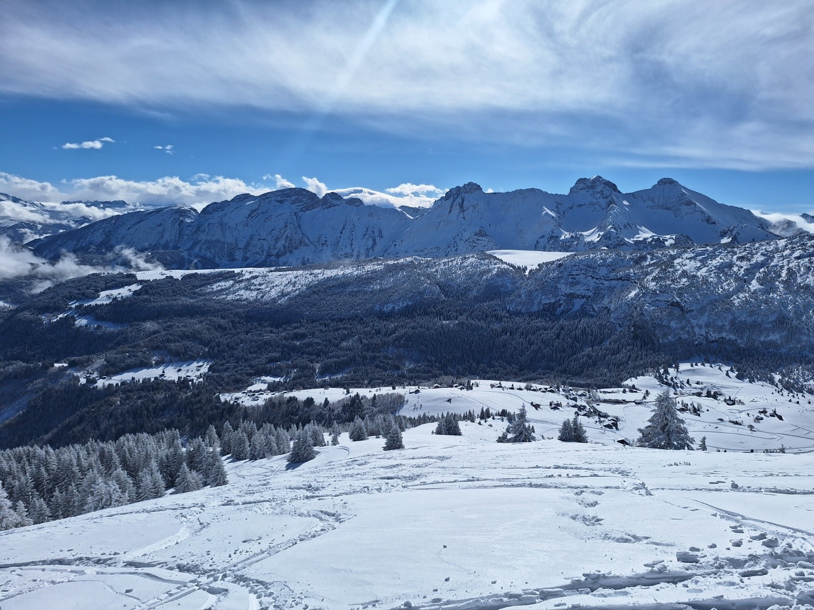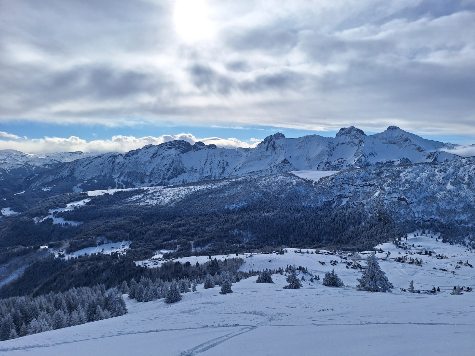 La suite de la montée se passe sans encombre, la trace est même faite jusqu'en haut. Le soleil vient sublimer un paysage qui a revêtu sa belle tenue d'hiver! La neige semble bonne, même si passé le plateau de Solaison, le vent l'a déjà bien travaillée! Ça sera probablement moins léger qu'espéré... même si ça a l'air de bien se skier, vu les virages du premier descendeur du jour... visiblement il fallait arriver encore 10 minutes plus tôt pour faire la 1ère trace 😆