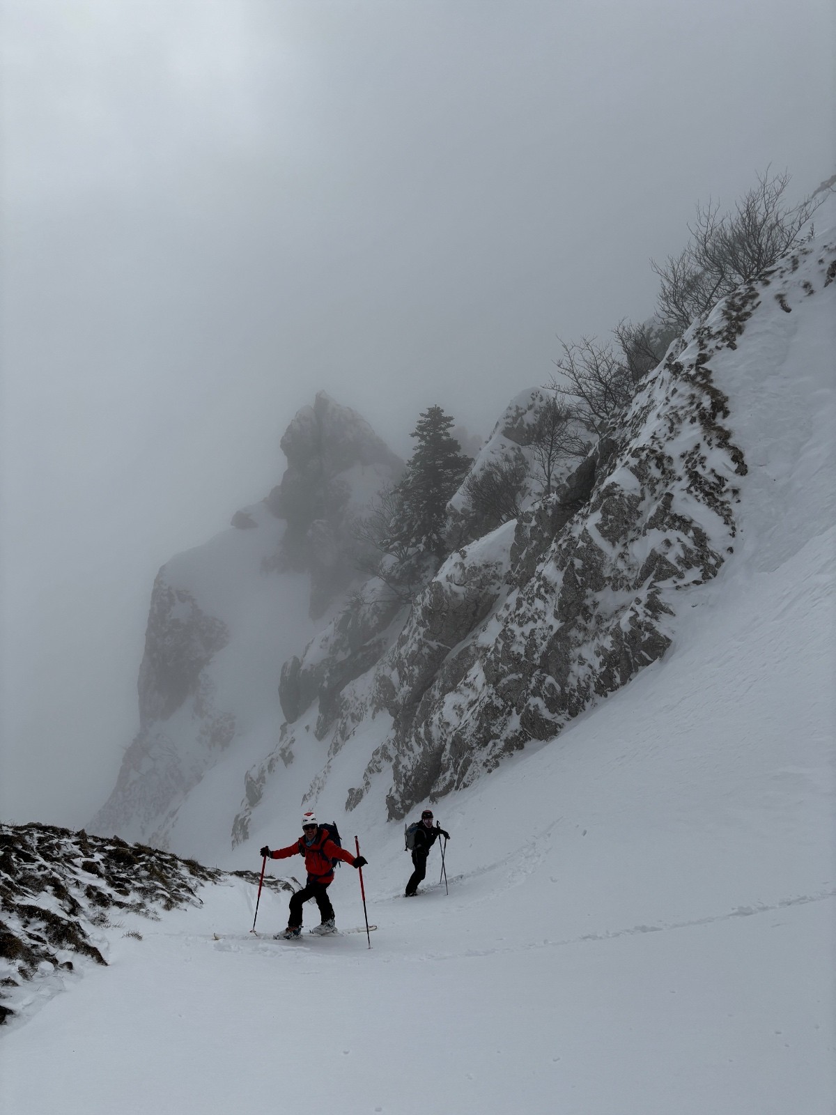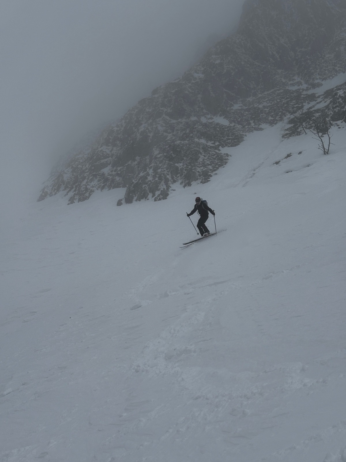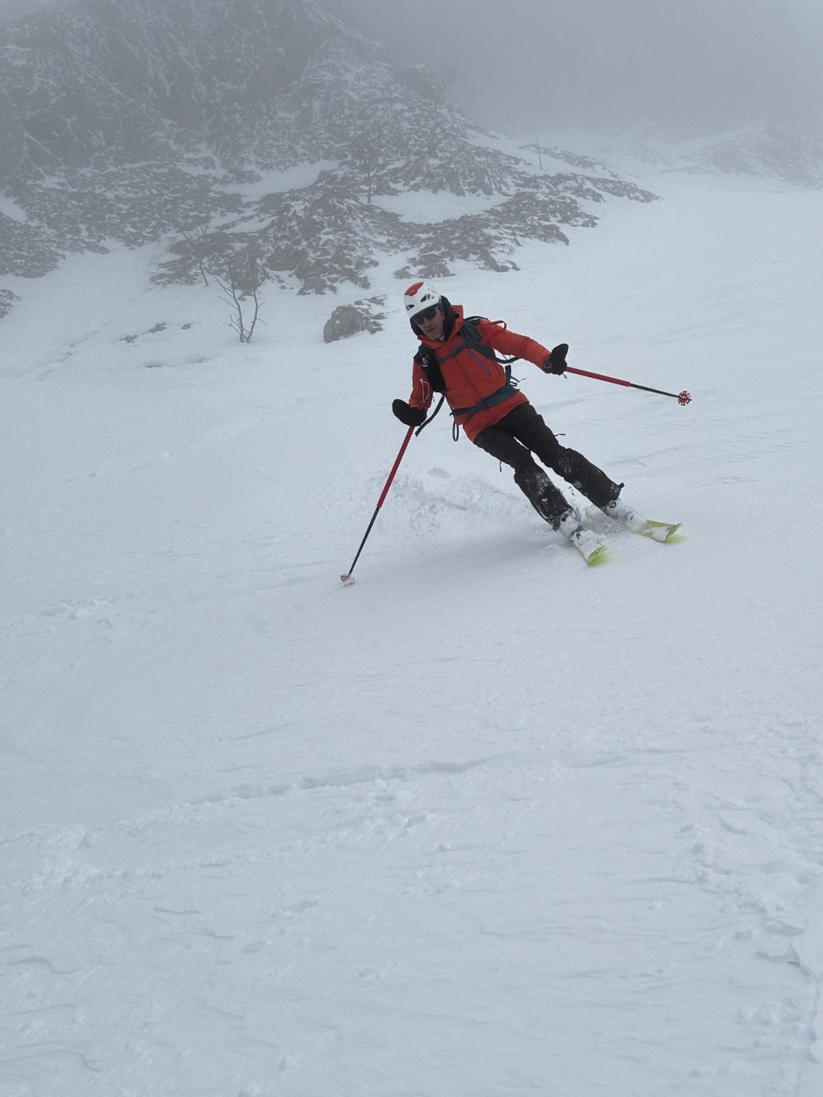La descente sera tranquille, on skie tranquillement pour ne pas se faire surprendre par les changements de neige. Malheureusement pas de vue sur les Sultanes, totalement dans le brouillard.