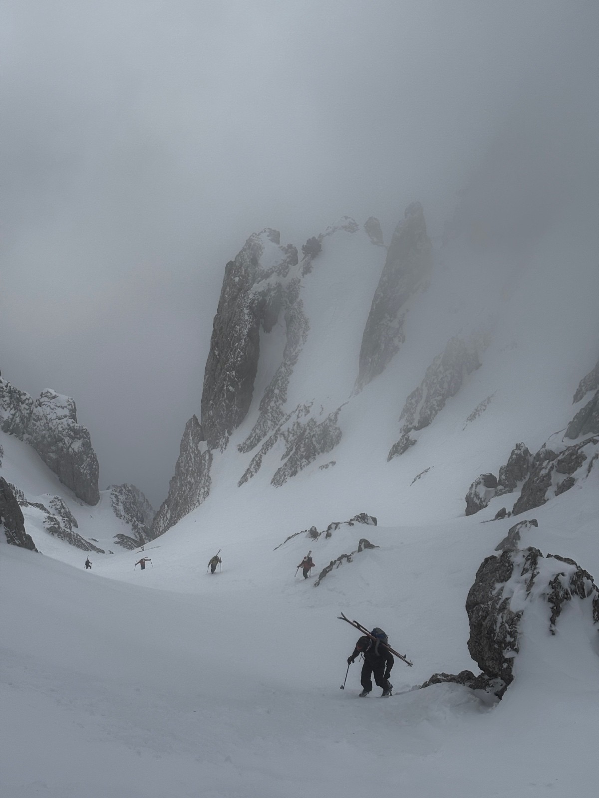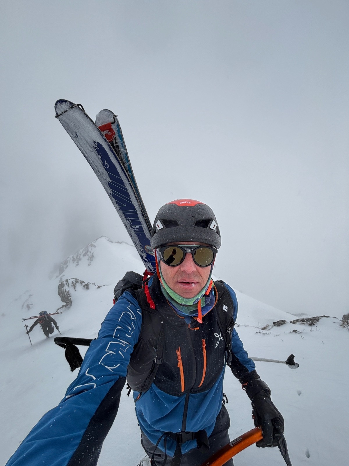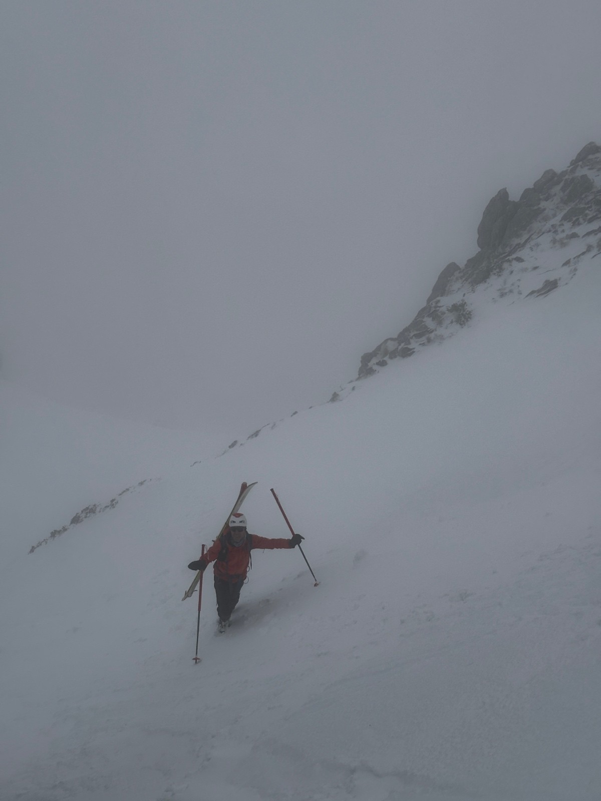 La descente sera tranquille, on skie tranquillement pour ne pas se faire surprendre par les changements de neige. Malheureusement pas de vue sur les Sultanes, totalement dans le brouillard.
