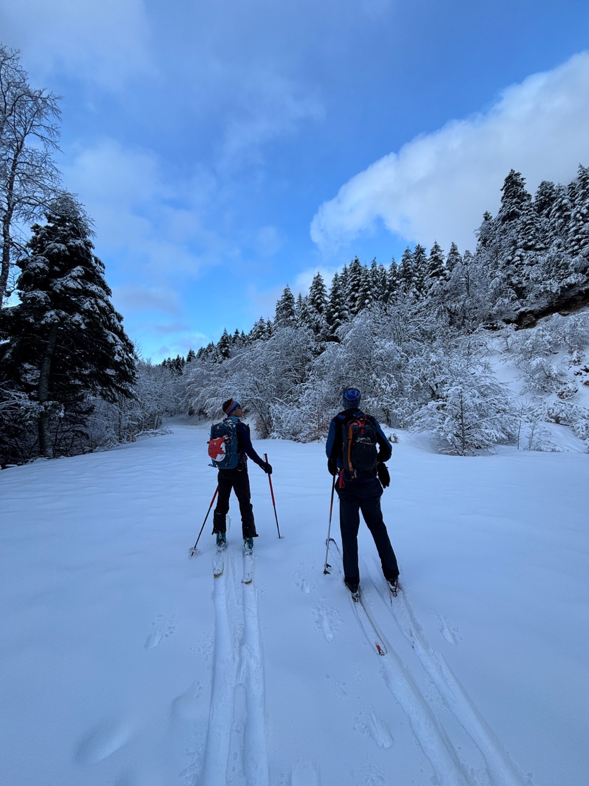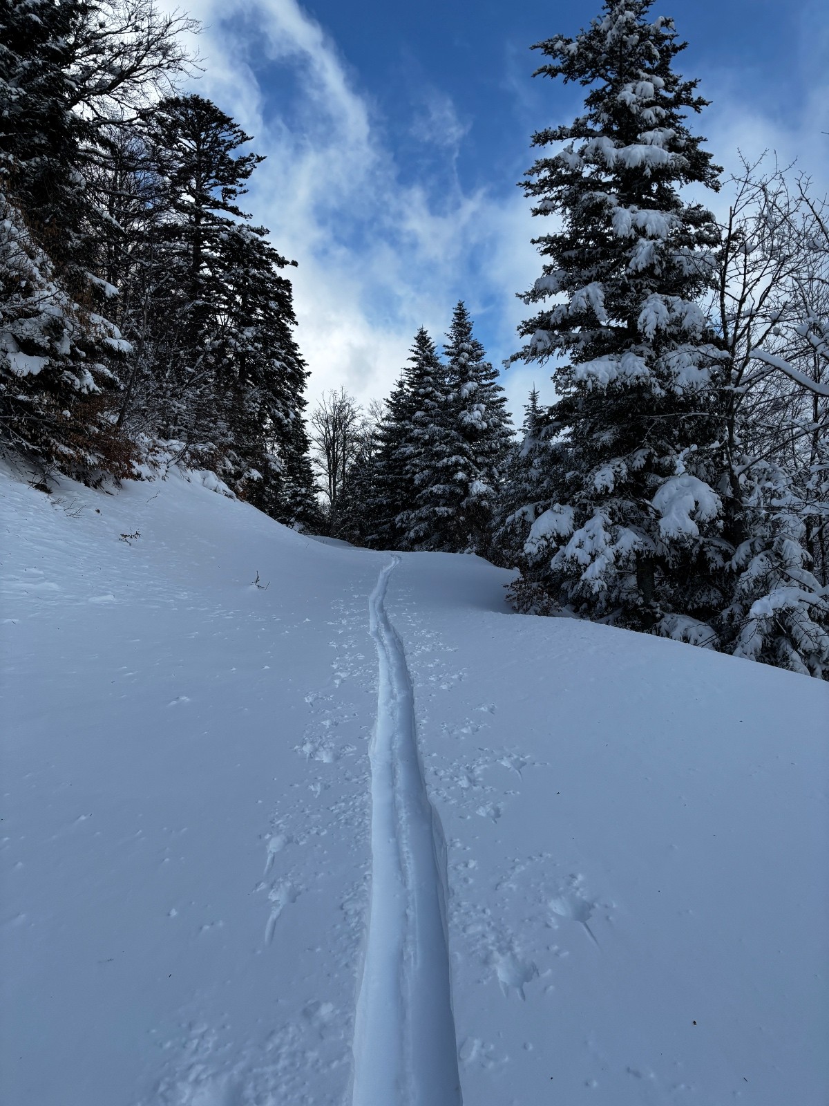 Conditions pour le ski : Bonnes, mais la forêt est faiblement enneigée sous la route supérieure. Au dessus c'est profond. Dans la trouée, de vieilles boules se cachent sournoisement sous la couche de fraîche, parfois épaisse (50/60cm), parfois nulle selon le vent et les accus.